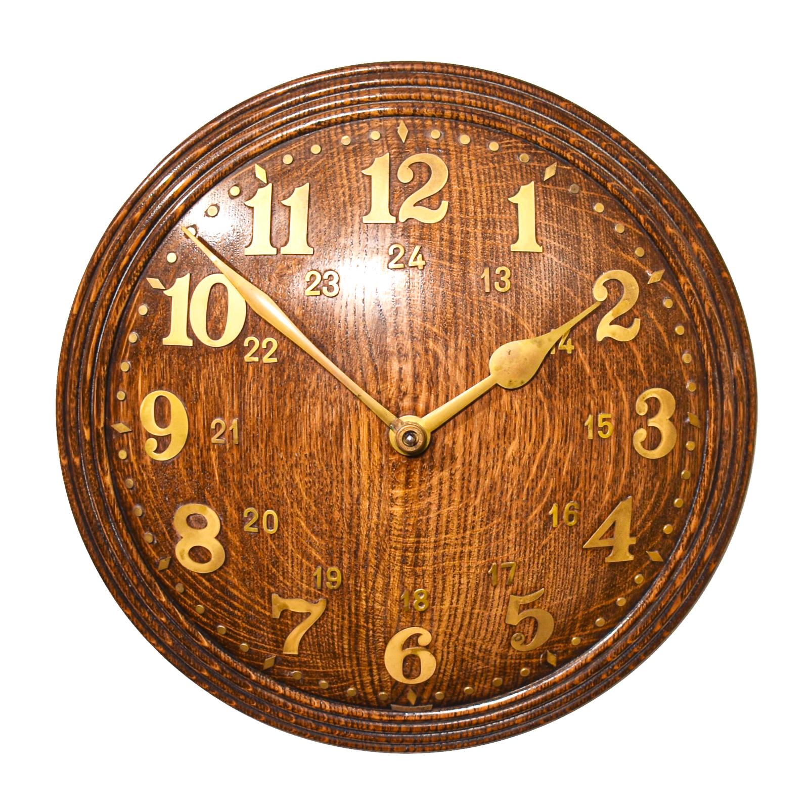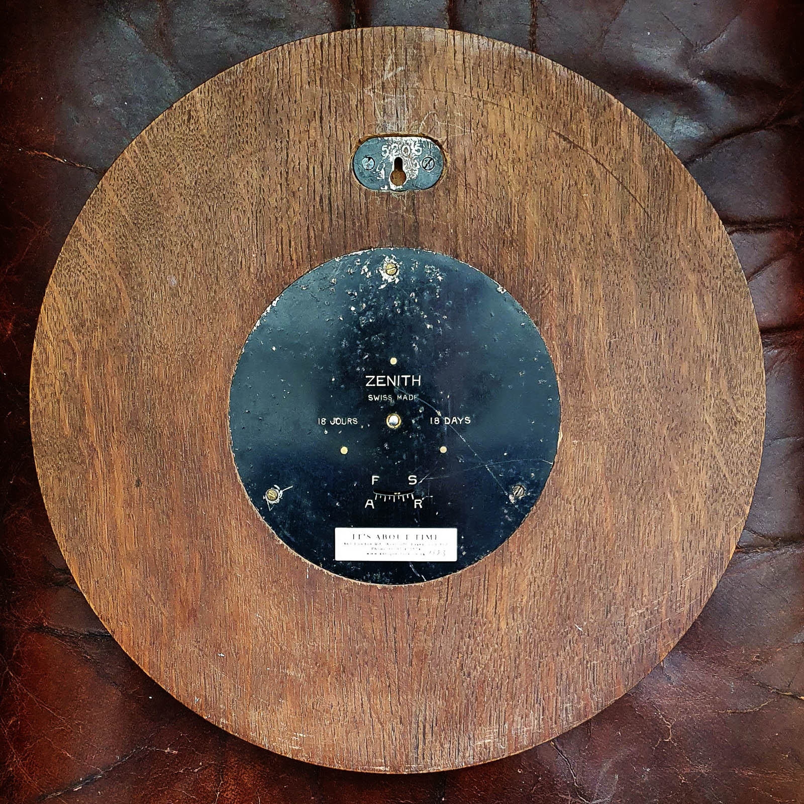 A twist on the traditional dial clock. This timepiece was made by Zenith and features a superb quality Swiss,18 day movement with a center winding position and very domed solid Oak dial. It’s worth noting that this one is in absolutely excellent condition and has a good colour. This example in Oak and roughly 12 size has the addition of a smaller 24hr dial with the 12 hr chapter ring. Heals retailed this clock from the 1930’s to 1960’s and has become quite collectable in recent years. With gilt brass numerals and hands.