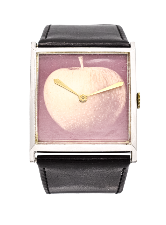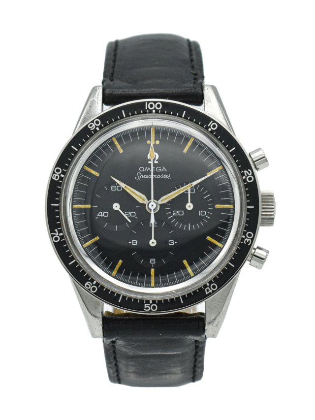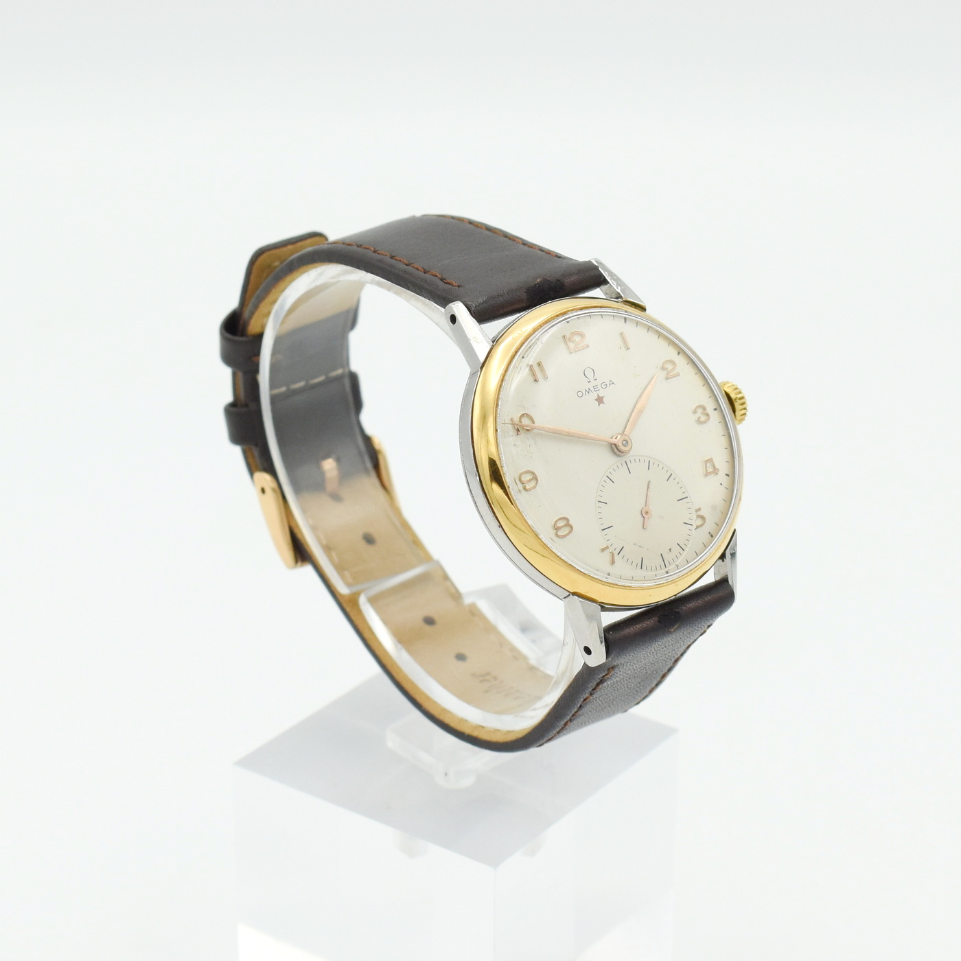 A 1944 Omega ‘Red Star’ with the classic 30T2 movement. The watch has gold bezel and a stainless steel case, on a leather strap with gold Omega buckle. The dial shows a nice petina with gold numerals and stylish hands, as well as sunken subdial and Omega red star. The red star was added to Omega dials at the time honouring the movement which had won an award at the Teddington Obsevatory, being the most accurate. The case measures 41mm in length, 35mm in diameter, not including the crown, and 9mm in depth. Reference number 10953425.