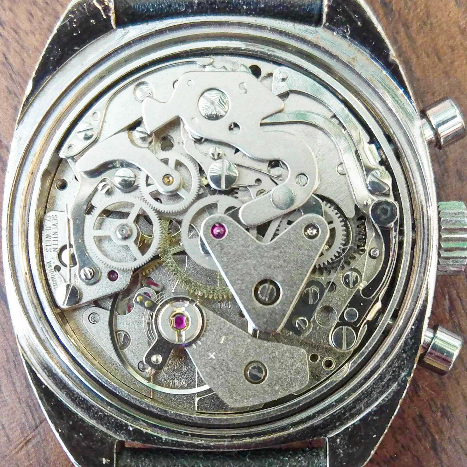 Heuer Chronograph from the late 1970’s grey fume dial with white sub dials. Sweep chrono hand in Orange with steel ‘stick’ Hour and Minutes with line lume. The date aperture at 6. On a contemporary but well matched strap with orange highlights. The movement is the classic Valjoux 7734 with 17 jewels, a true ‘workhorse’. The dial is near mint. The case is unpolished and original. If you would like the outer case restored this can be arranged but keeping this original will add to it’s value.