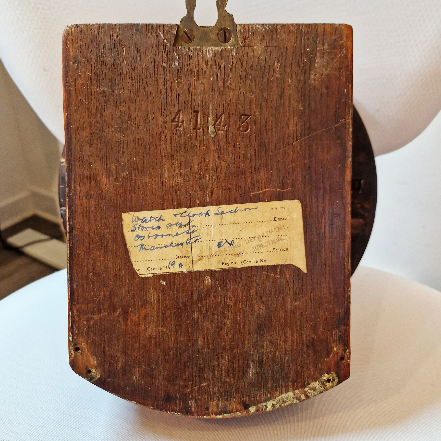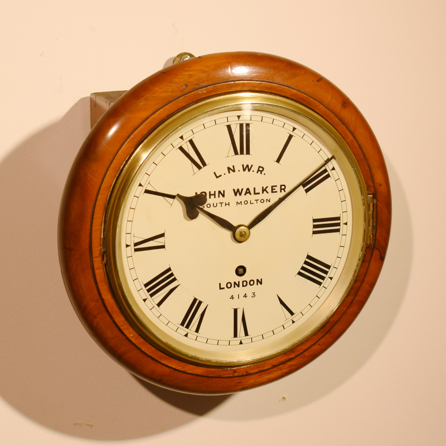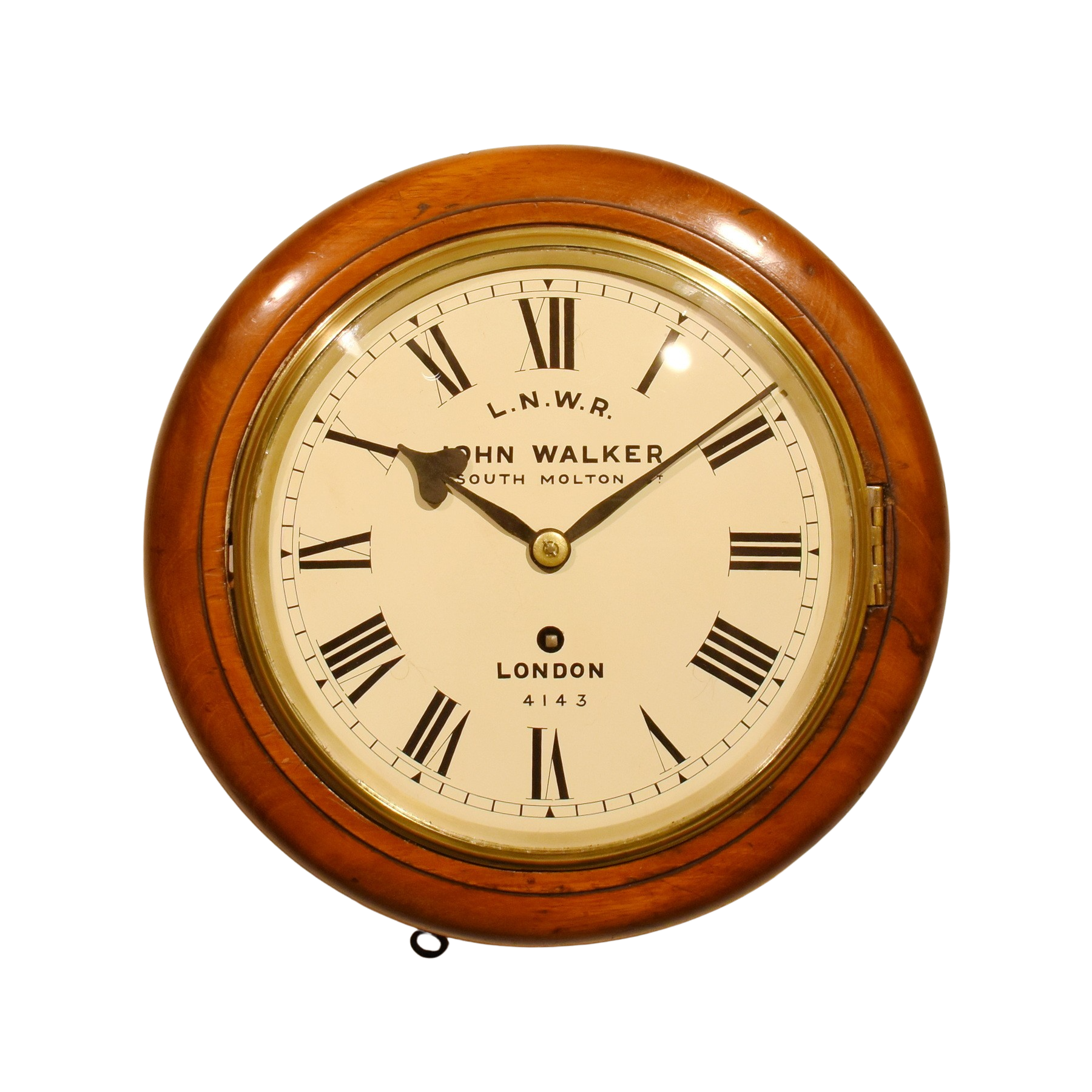 A very nice railway clock of good colour. This clock is a great size with a newly reconditioned 8 inch dial in cream enamel. Convex glass, brass bezel, nicely balanced wooden case with side door and lockable door to the bottom. Signed John Walker of 1 South Molton Street, a prominent clockmaker, known for supplying railway clocks, established in 1830 and recorded operating out of Molton Street from 1906. The dial bears the number 4143, which is also written on the back of the dial plate and engraved into the rear of the case. The label to the rear of the case shows a stamp from Watford Junction, making it quite a rare clock from this area. The hour hand quite an unsual shape, suggesting perhaps that the movement was made by Benson.
