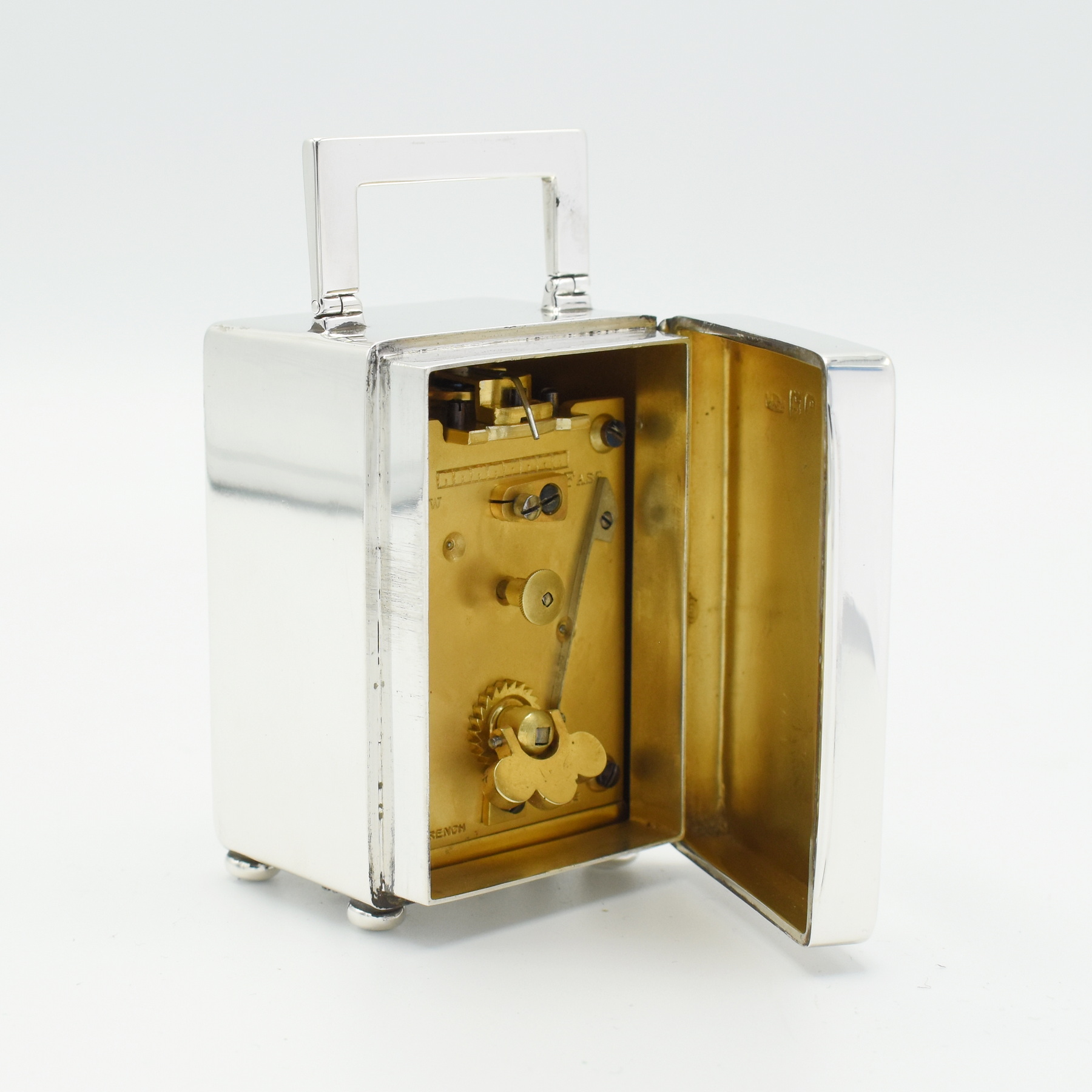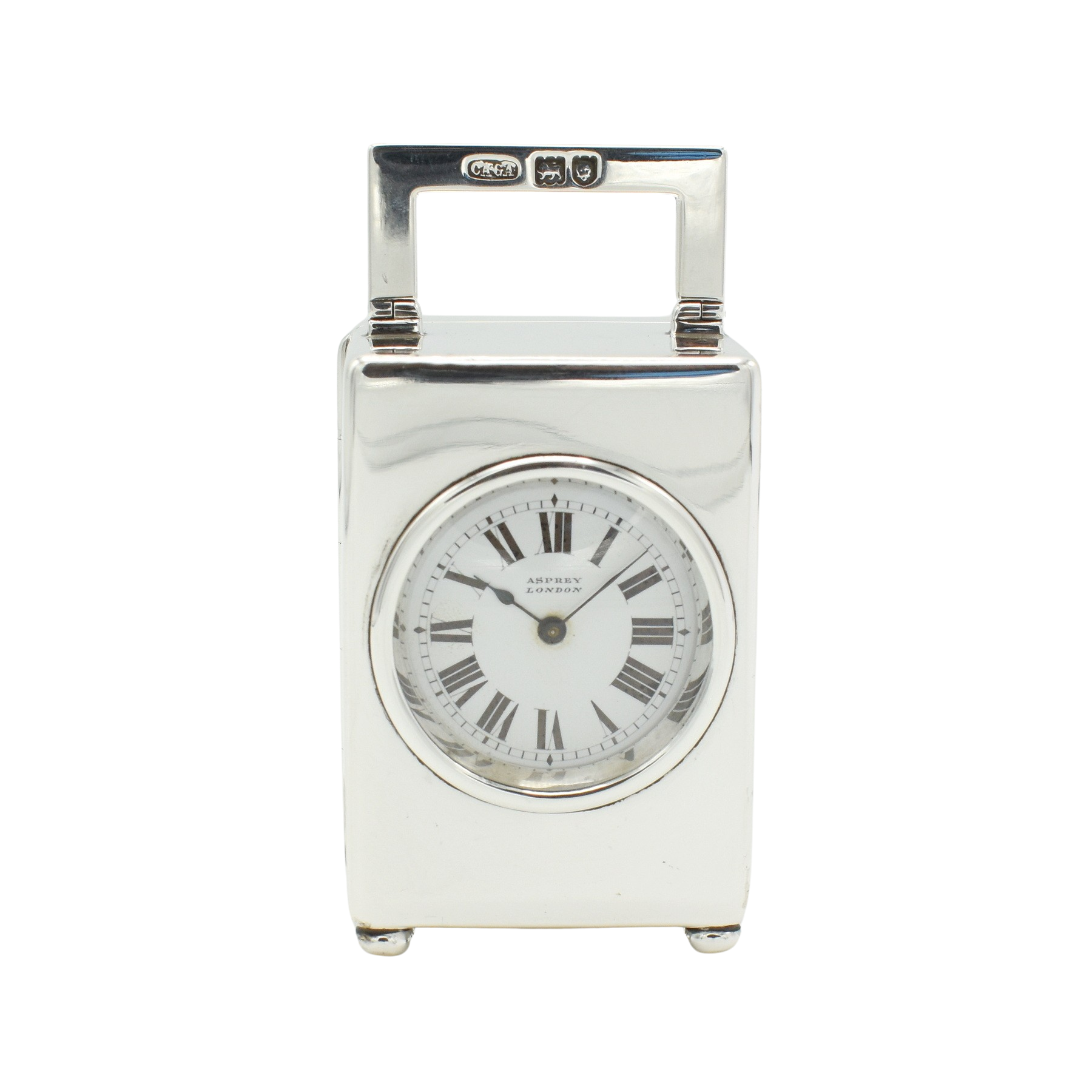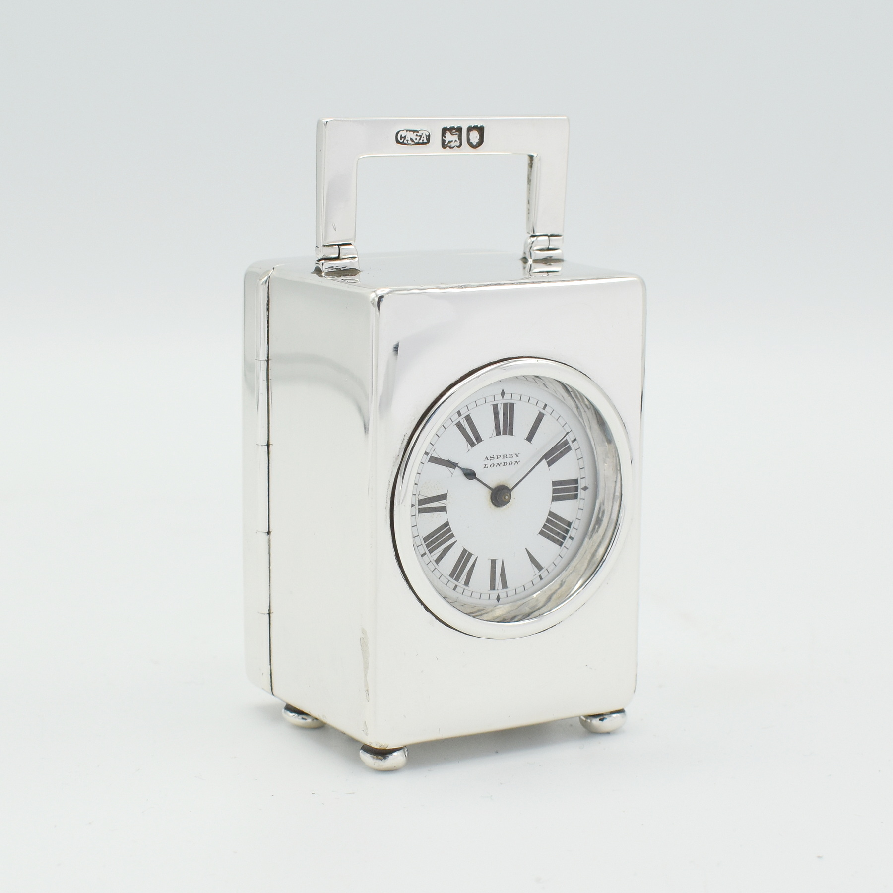 A fine miniature carriage timepiece made and retailed by Asprey of London. The case is solid silver and in near perfect condition, with a gilt interior and an angular ‘deco’ style handle. Hallmarked for Charles & George Asprey for 1901. Sitting on silver bun feet, it stands 9cm high with the handle extended. The dial is in good condition with neat, wide Roman numerals and is signed Asprey, London. Adjusted and wound from the rear. Running for a week on a full wind. In 1889, the business was renamed C & G.E Asprey, despite Charles (II) not retiring until 1891. The last name change of the nineteenth century was in 1900, where the business became known as Asprey & Co. In 1906, Asprey bought out their business competitors, and neighbours, Houghton & Gunn. Sold fully overhauled and with a 24 Month Guarantee.
