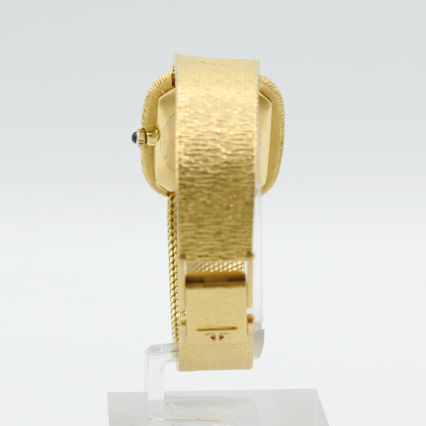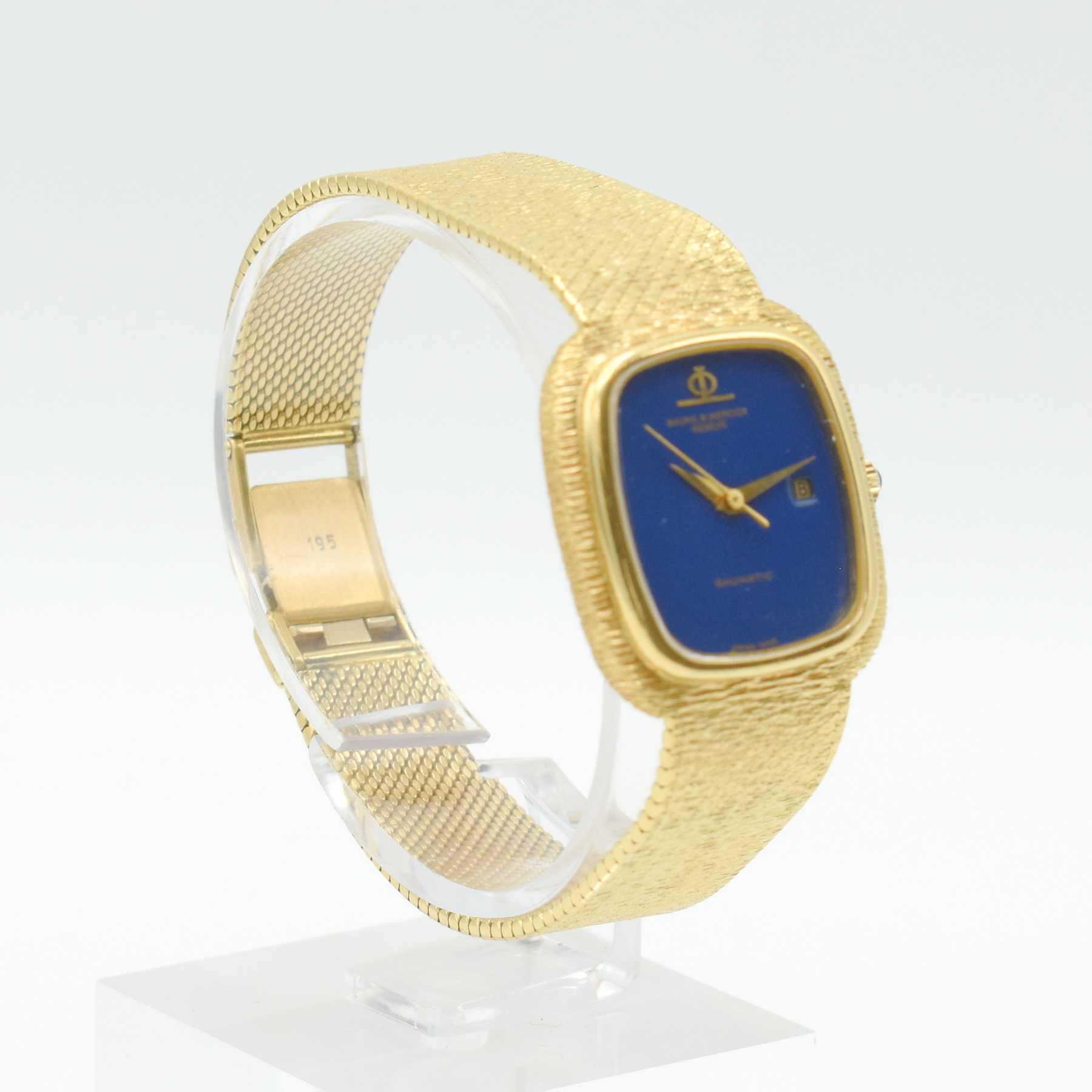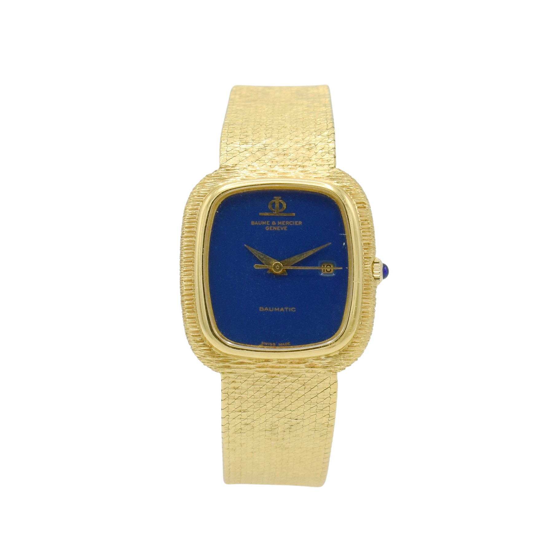 A very attractive Baume et Mercier automatic. The solid gold bark finish case is rather attractive and really quite rare, with a nice decorative texture blending seamlessly into the strap. The dial is a fine deep blue, tastefully plain, and complemented by a blue sapphire cabochon set into the crown and a smooth gold finish bezel. It features the Baume et Mercier name and logo in gold, with gold dauphine minute and hour hands, and a delicate gold seconds hand. At the 3 hour position, there is a small date aperature showing black numerals with a gold background. There are some minor scratches to the bezel, which can be seen in the photos, but overall this watch is in great condition. A very fine and beautiful watch which must be seen in our shop to be fully appreciated.