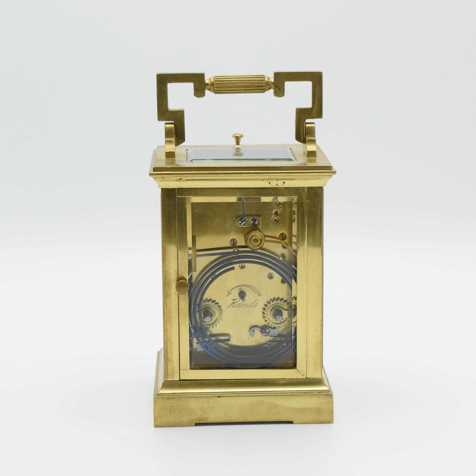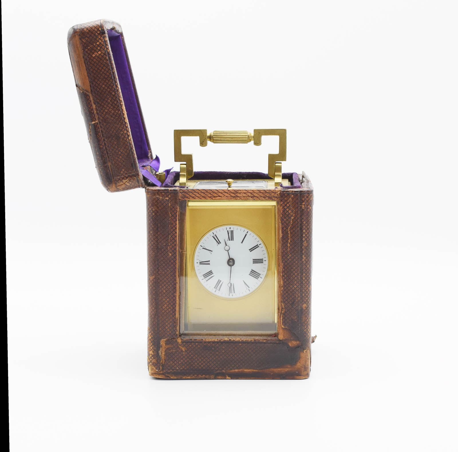 A superb, small masked dial, striking carriage clock. The fully overhauled movement is gong striking on the hour and once for the half hours. The case is polished and laquered so will not require polishing for 15 years or more! This style of carriage clock dates back to aRound 1910. The case style is ‘Anglaise Riche’ and is supplied with original case covered with distressed morrocan leather. This clock also has ‘Push repeat’ on demand and retains the original jewelled lever, Silvered platform escapement.