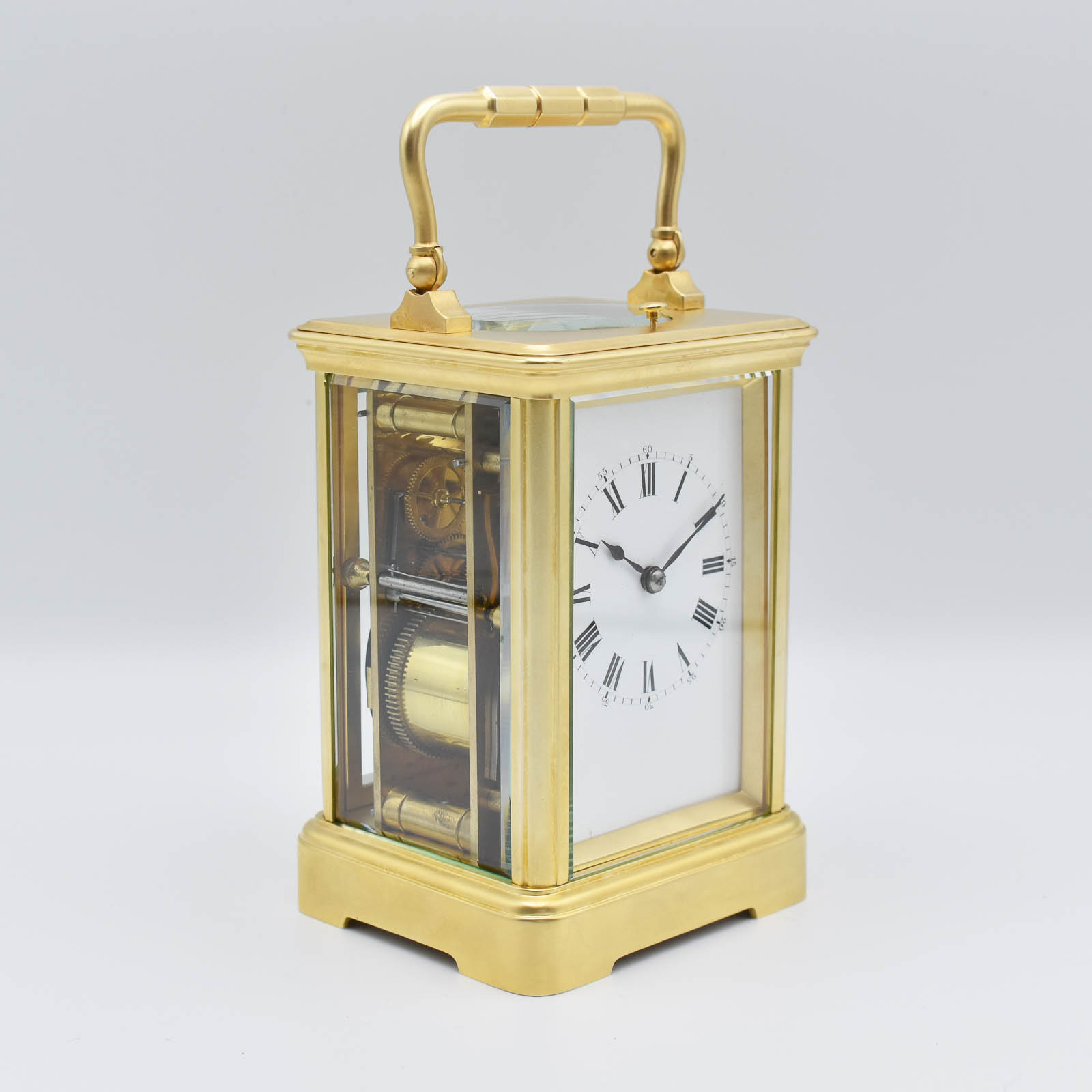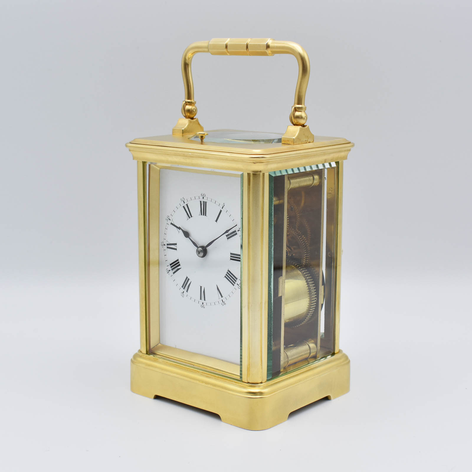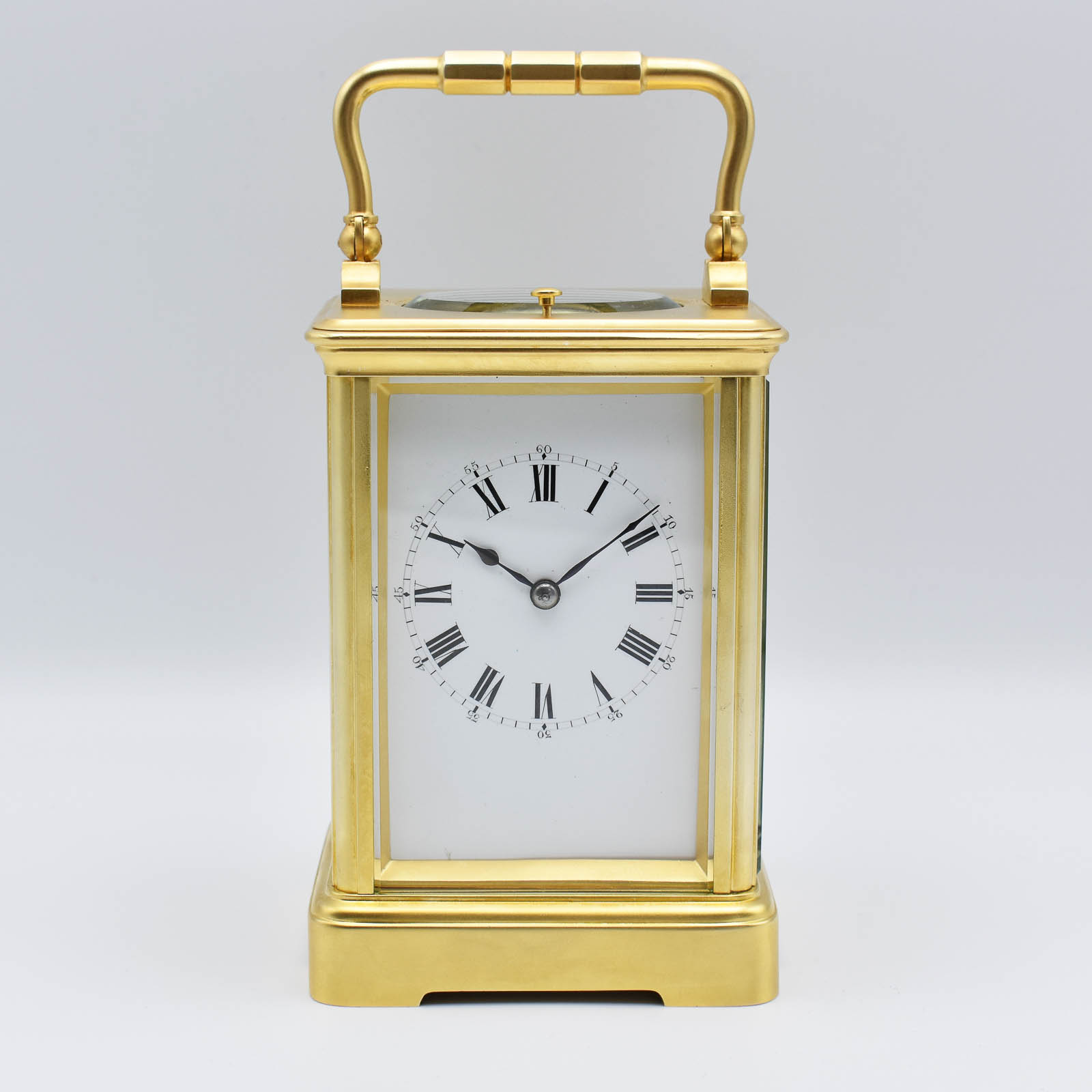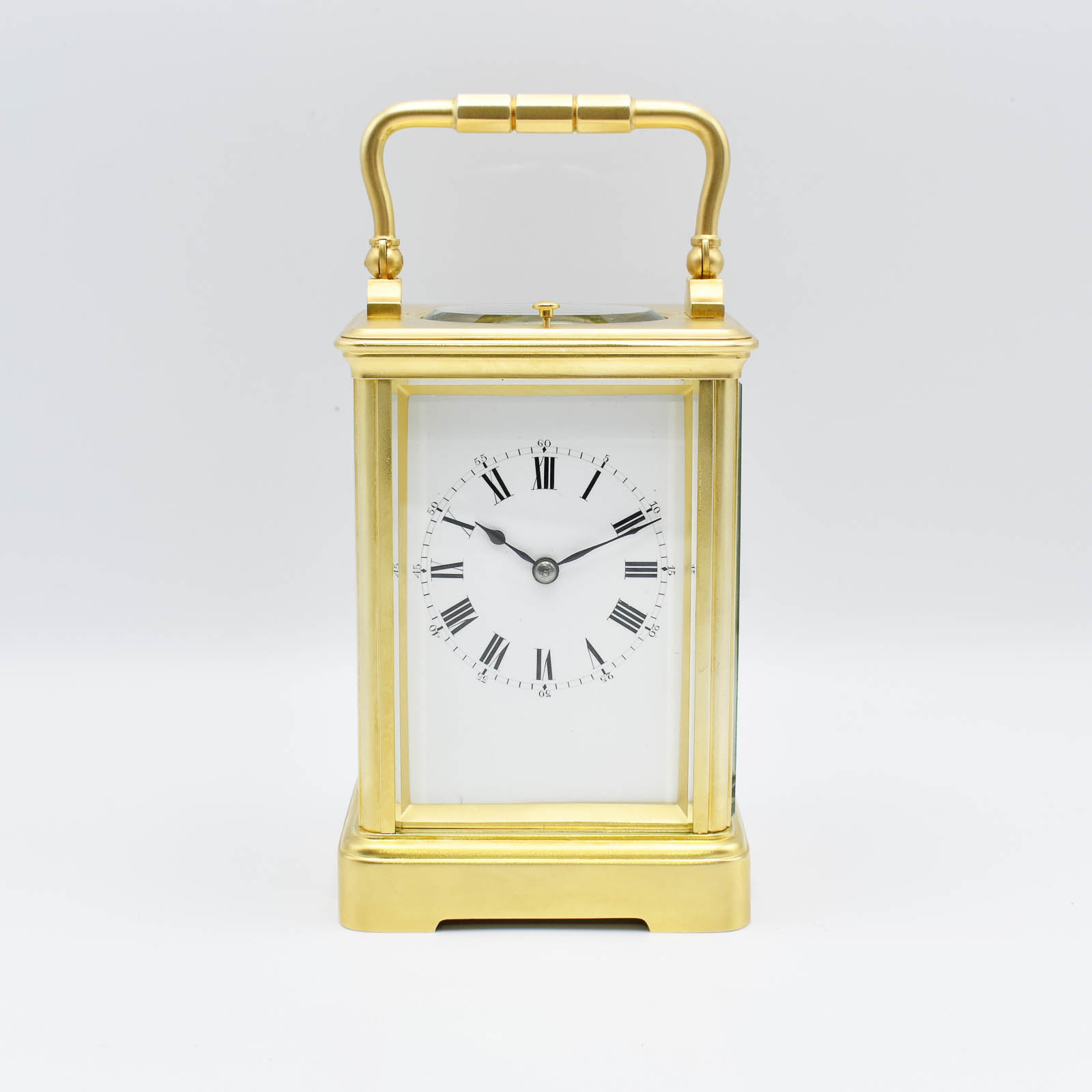 A simple ‘Corniche’ shape carriage clock with push repeat on demand and striking on a soft gong. A super quality gilt case with bevelled ‘sight’ to the dial and multi piece base. The dial displaying Roman numerals with smaller outer minutes and in perfect condition. The original hands, the original escapement. The original outer leather case and key. Numbered 22543 which is a Drocourt serial number and has all the hallmarks of Alfred Drocourt with the ‘Arrow’ for hand setting and dates to 1900-10. Sold fully guaranteed for 2 years. A very reasonably priced clock and would make an ideal gift.