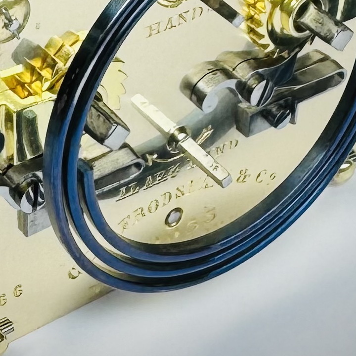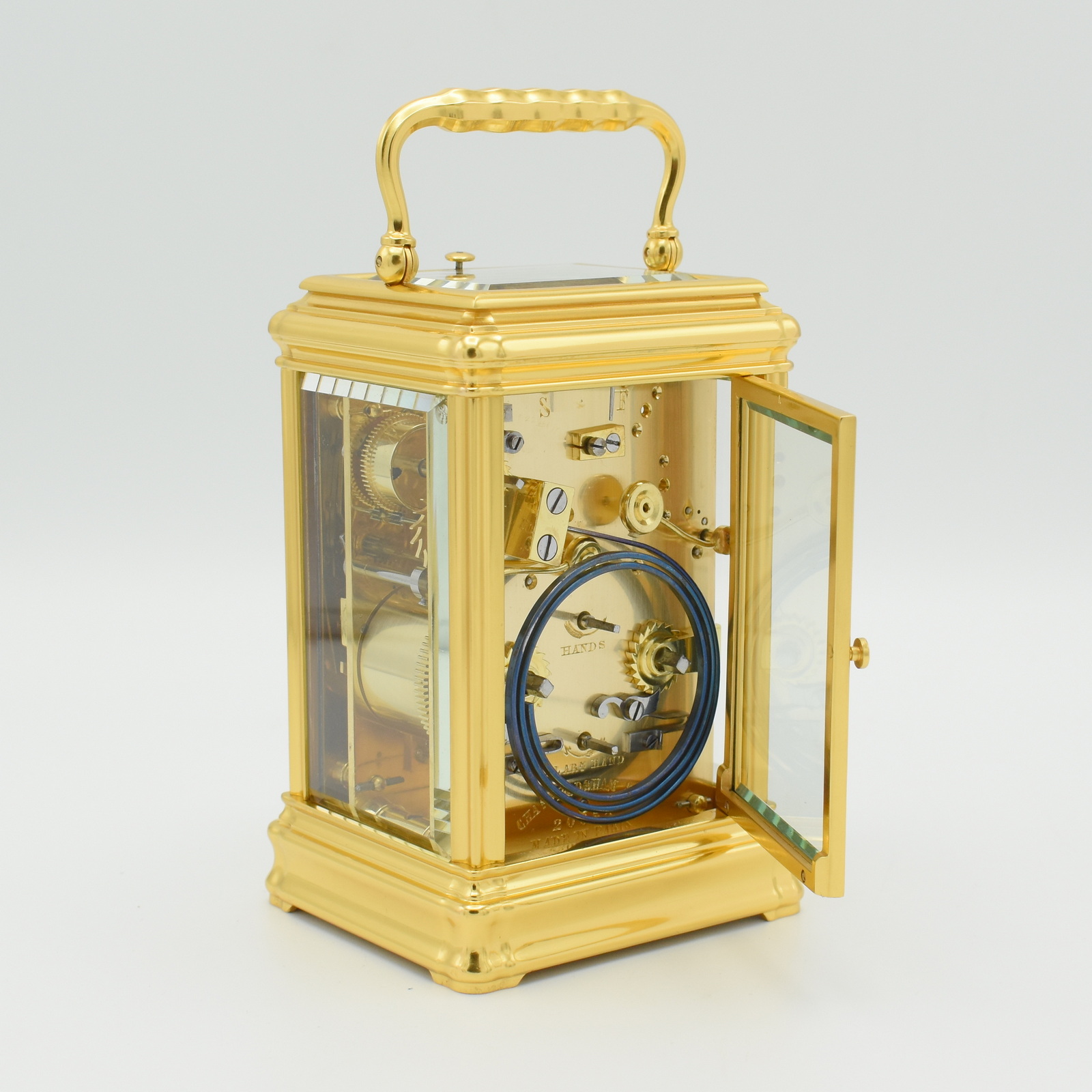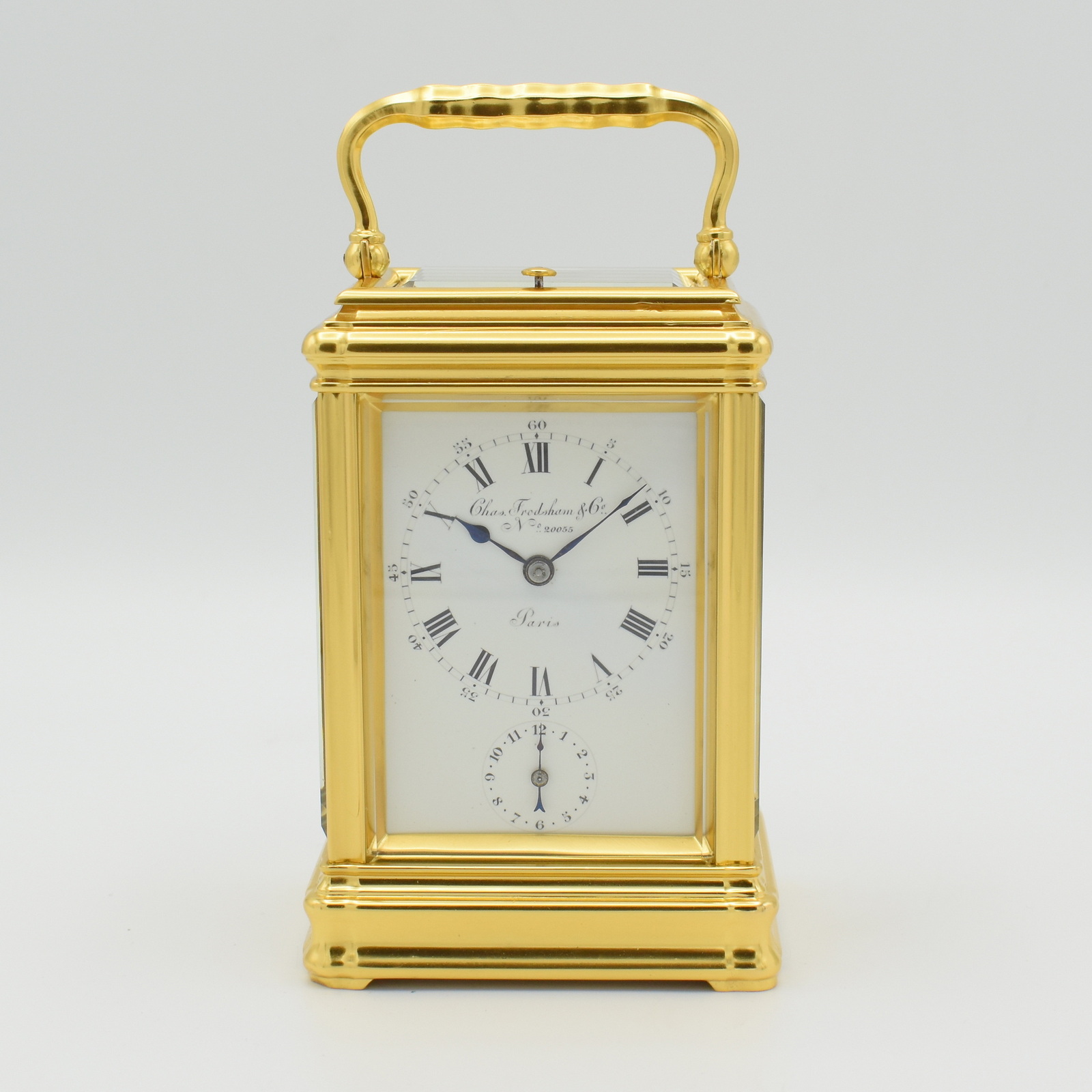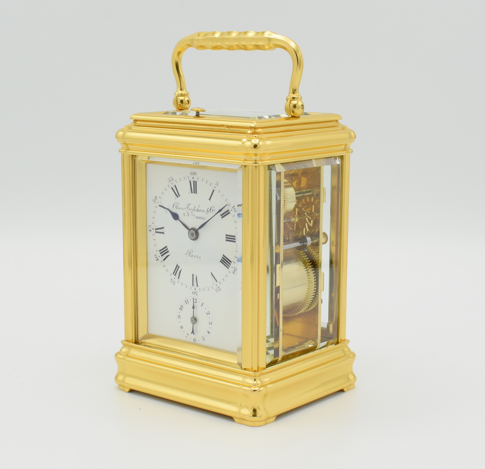 No 20055 is a fine gilt ‘Gorge’ Carriage clock with push repeat, strike-silent and alarm function, it was finished and retailed by the famous Charles Frodsham of London and Paris and given the number 20055. . Charles Frodsham is London’s (and the worlds) oldest remaining clock, watch and chronometer makers. Charles was born in April 1810. He set up, as a young man, his own business in 1834. He very quickly became an important Chronometer maker and then purchased in 1844 the prestigious ’84 The Strand’ after John Roger Arnold suddenly passed away. You can read more about the history of the Frodsham’s directly on their website, should you be interested. The number 20055 dates the clock using the Frodsham numbering system to around 1890-1900. The gilding on this clock has been carefully preserved and looks truly stunning. An important feature of this clock is the strike – silent selection lever to the base, this is rarely seen and adds another layer of interest to this particular clock. The dial and hands are simply superb. The dial has the all important name and number. The clock was made for Charles Frodsham by Drocourt and bears their stamp and number 28066 on the backplate too. To the base of the backplate it is engraved with Charles Frodsham and the number (see last photo) We have numerous pictures of the restoration which we can’t upload to our website but are available on request.