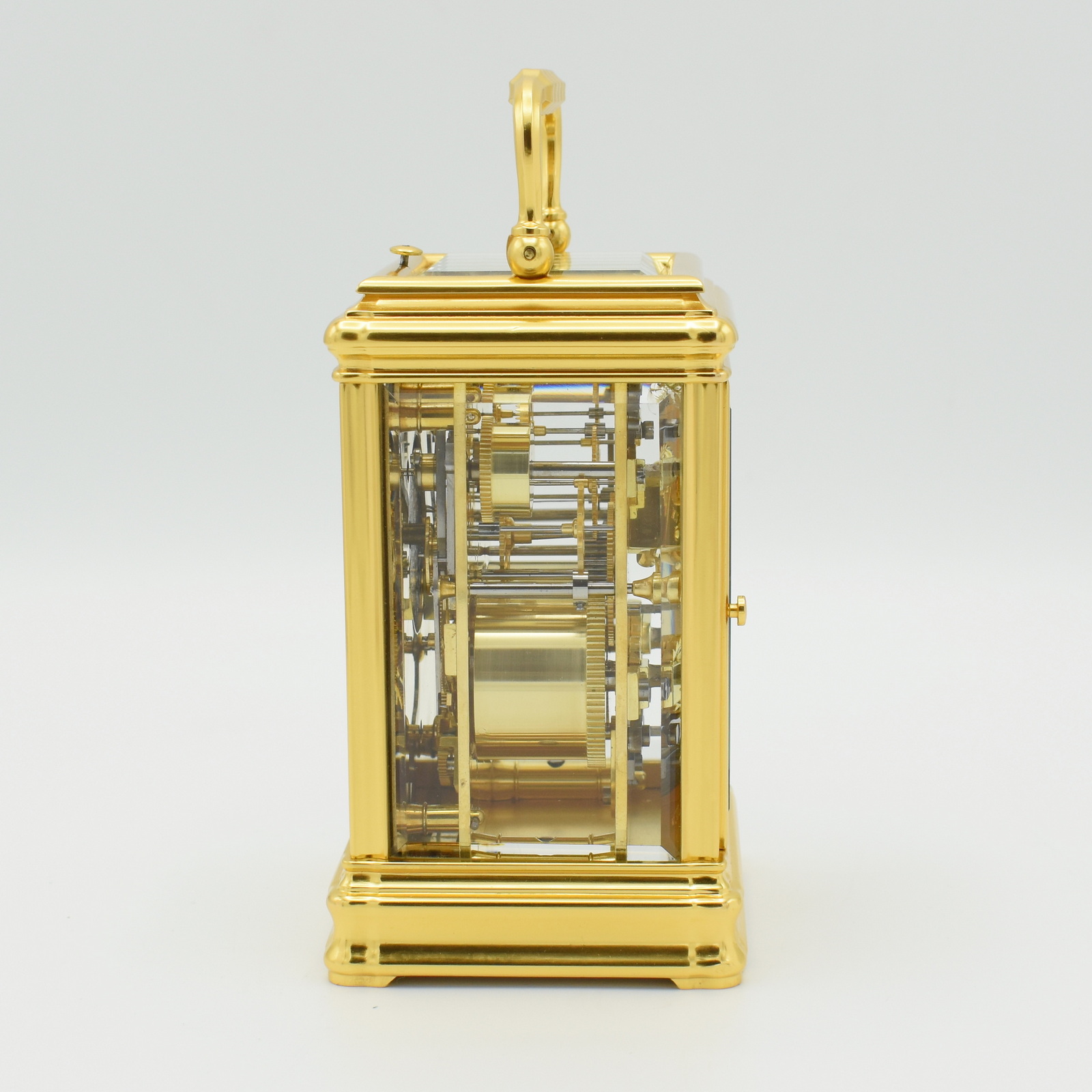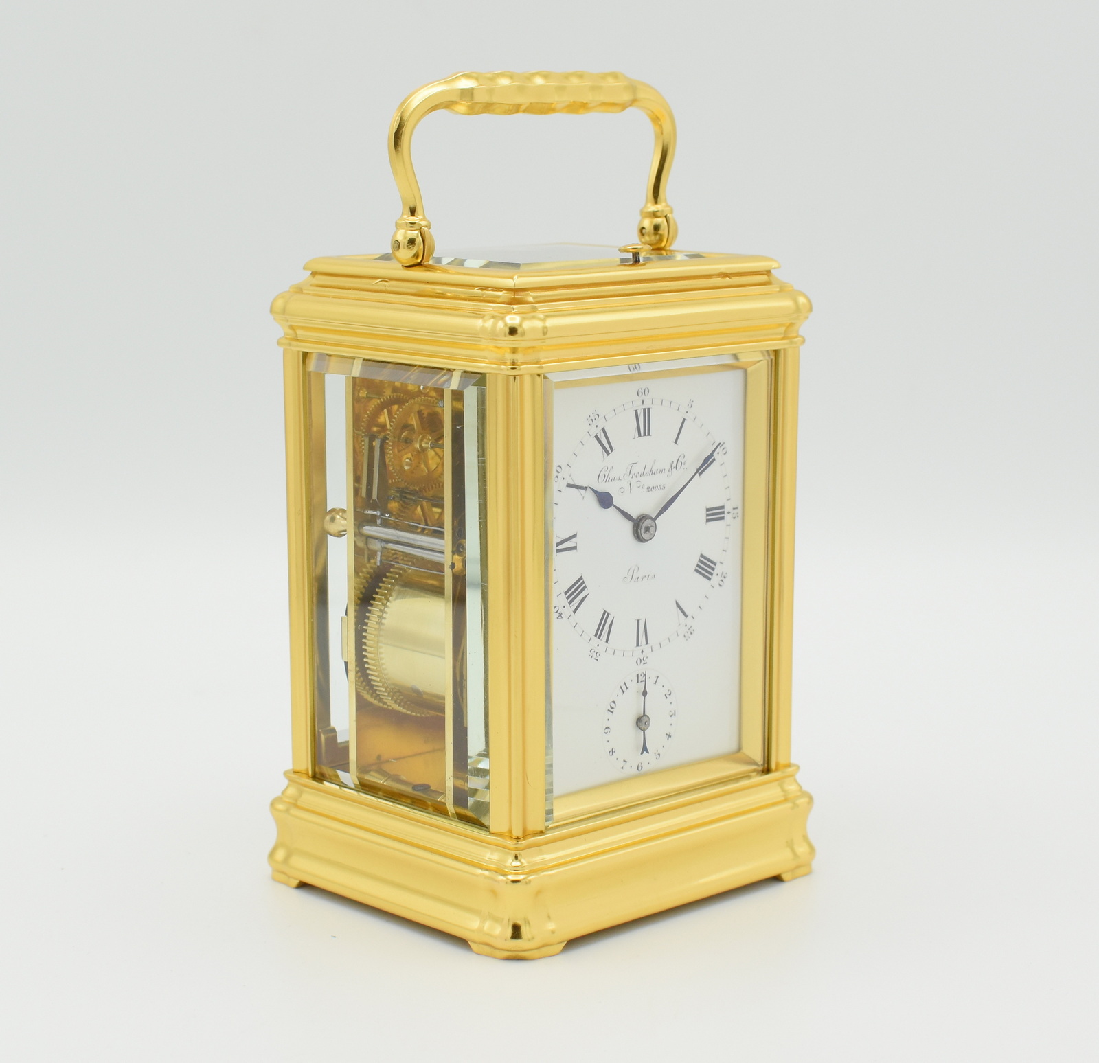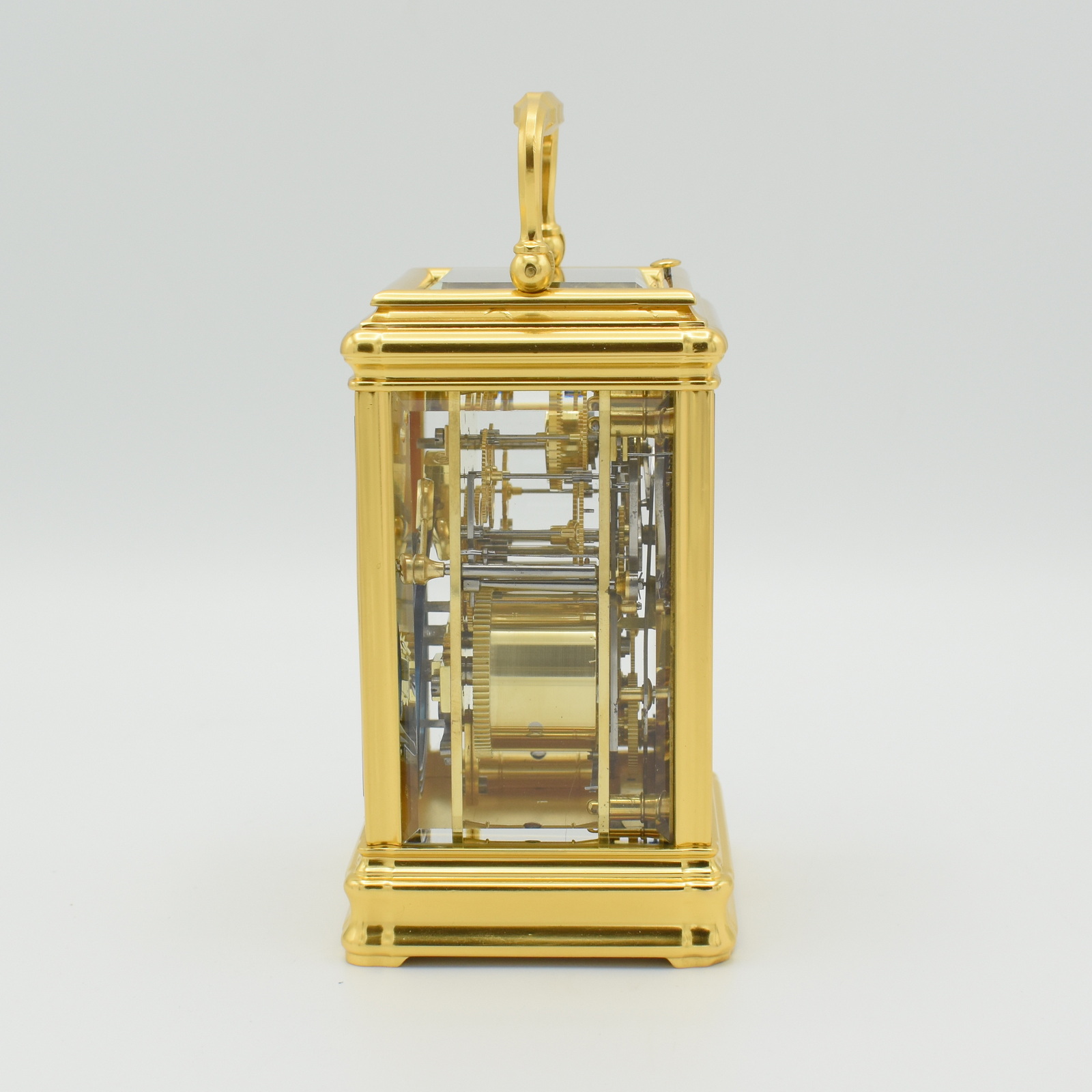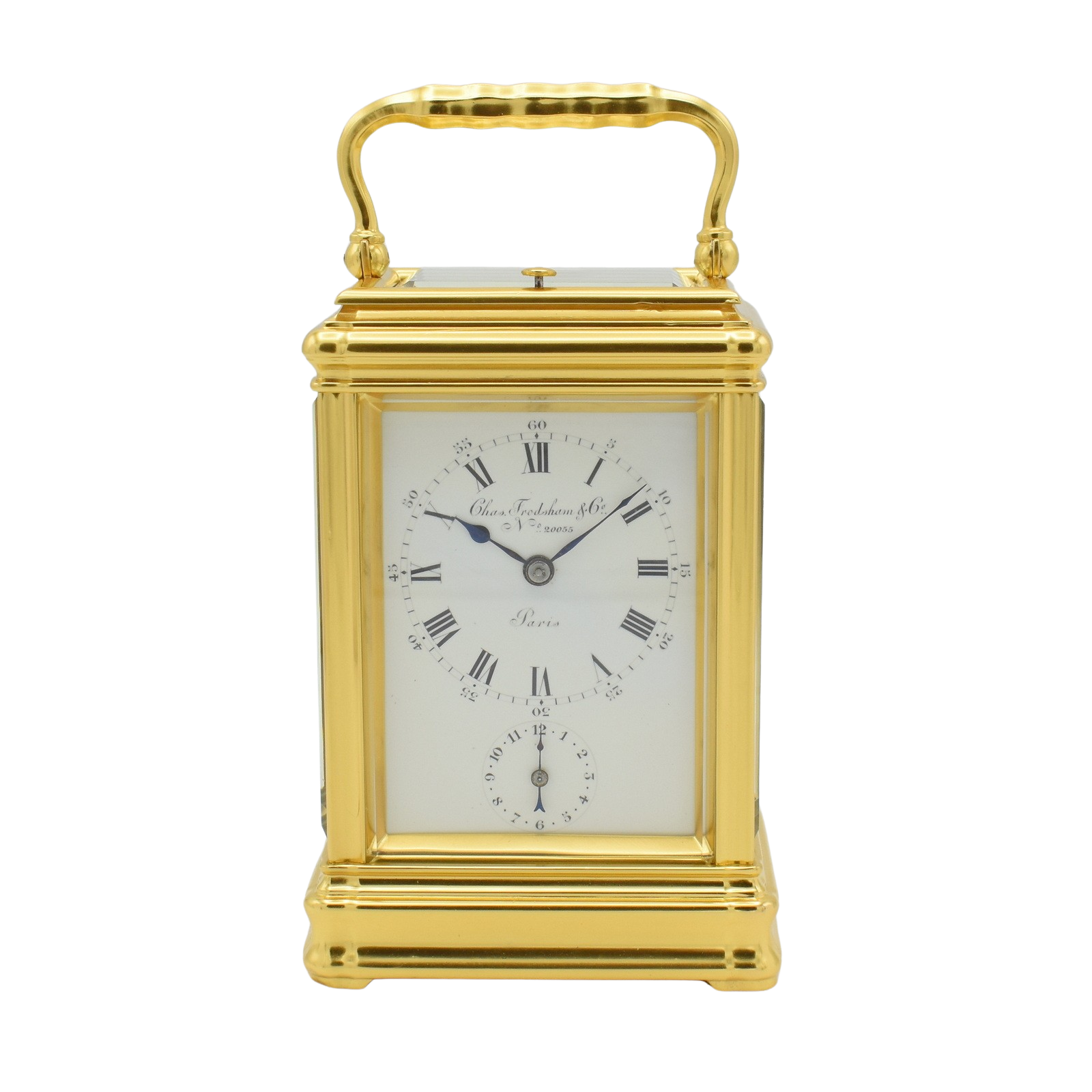 No 20055 is a fine gilt ‘Gorge’ Carriage clock with push repeat, strike-silent and alarm function, it was finished and retailed by the famous Charles Frodsham of London and Paris and given the number 20055. . Charles Frodsham is London’s (and the worlds) oldest remaining clock, watch and chronometer makers. Charles was born in April 1810. He set up, as a young man, his own business in 1834. He very quickly became an important Chronometer maker and then purchased in 1844 the prestigious ’84 The Strand’ after John Roger Arnold suddenly passed away. You can read more about the history of the Frodsham’s directly on their website, should you be interested. The number 20055 dates the clock using the Frodsham numbering system to around 1890-1900. The gilding on this clock has been carefully preserved and looks truly stunning. An important feature of this clock is the strike – silent selection lever to the base, this is rarely seen and adds another layer of interest to this particular clock. The dial and hands are simply superb. The dial has the all important name and number. The clock was made for Charles Frodsham by Drocourt and bears their stamp and number 28066 on the backplate too. To the base of the backplate it is engraved with Charles Frodsham and the number (see last photo) We have numerous pictures of the restoration which we can’t upload to our website but are available on request.