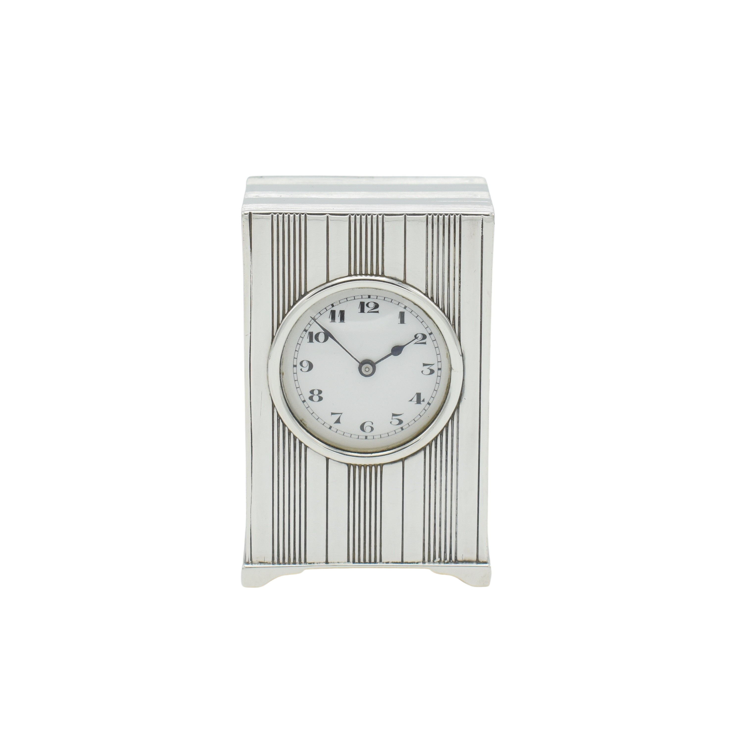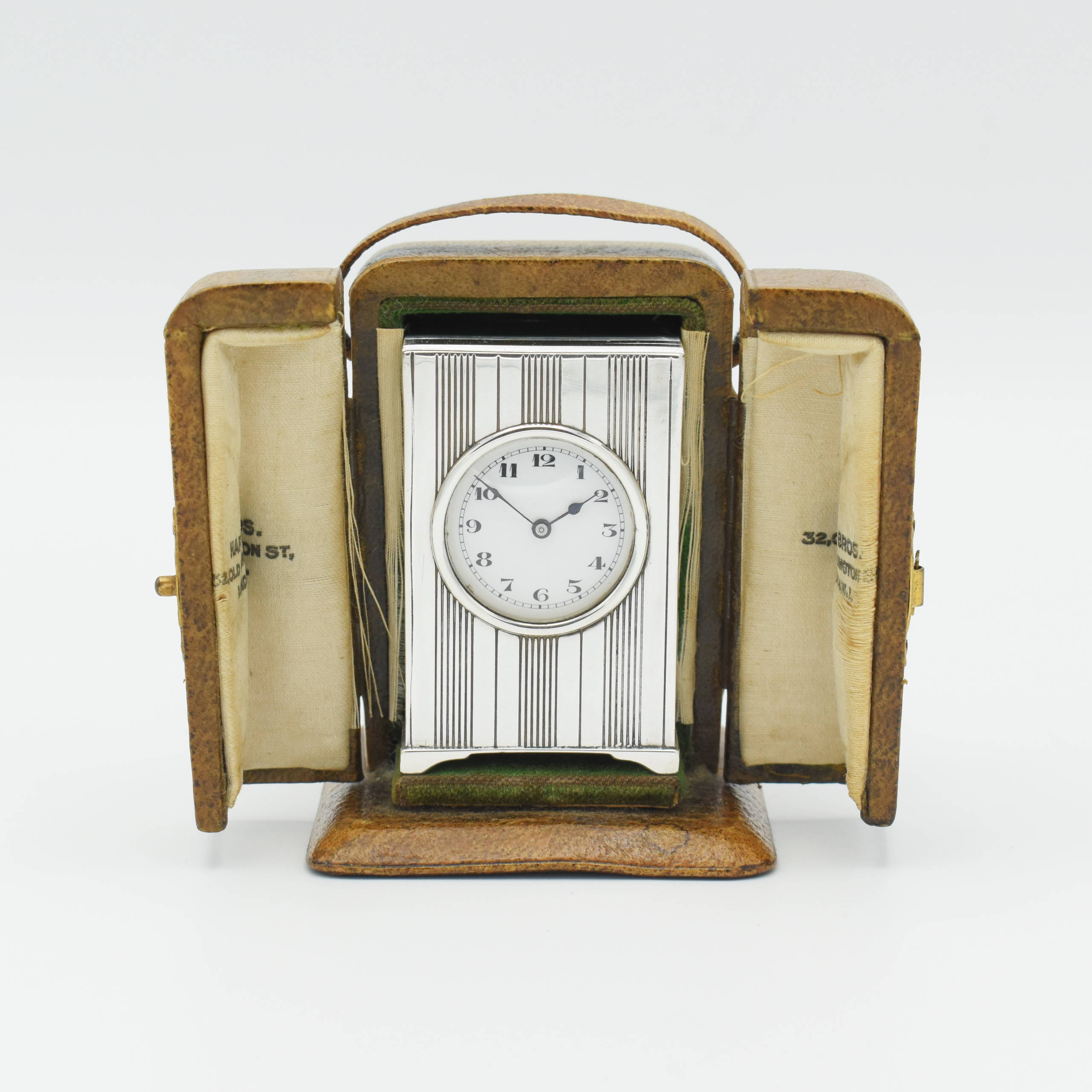 This is an exceptionally well preserved solid silver timepiece retains its outer leather covered protective travel case. We sell a lot of clocks and have done for over 43 years, yet we have not seen this design before, its very ‘clean’ design and simple geometric pattern are pleasing. It was retailed by Hardy Bros of the prestigious Old Burlington Street in Mayfair, London, we estimate at around 1920-30. Further research of the hallmarks and stamps to be exact though. The case has a small recess for the key (which is original) and leather covered with two hinged doors, silk lined and printed with the retailers name.