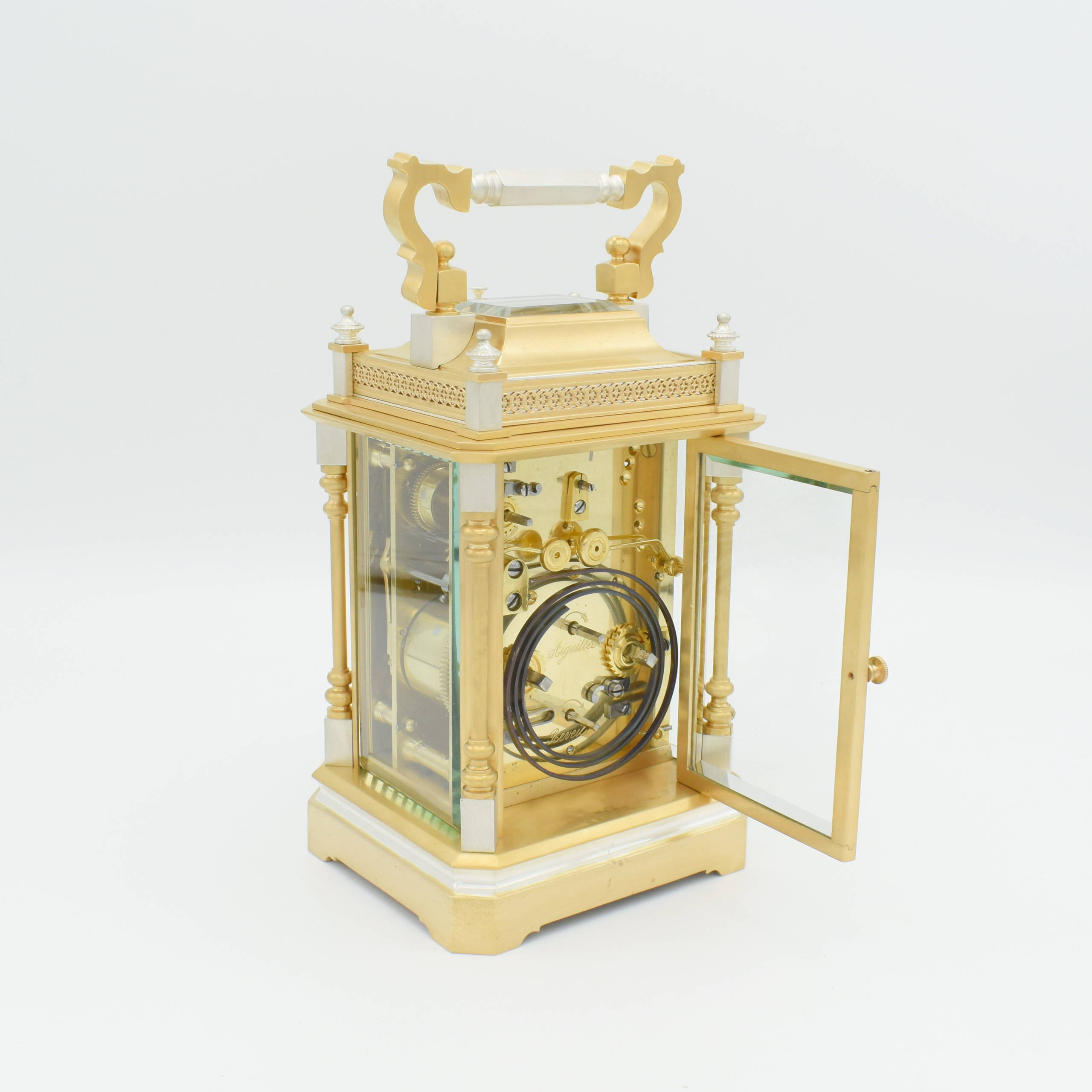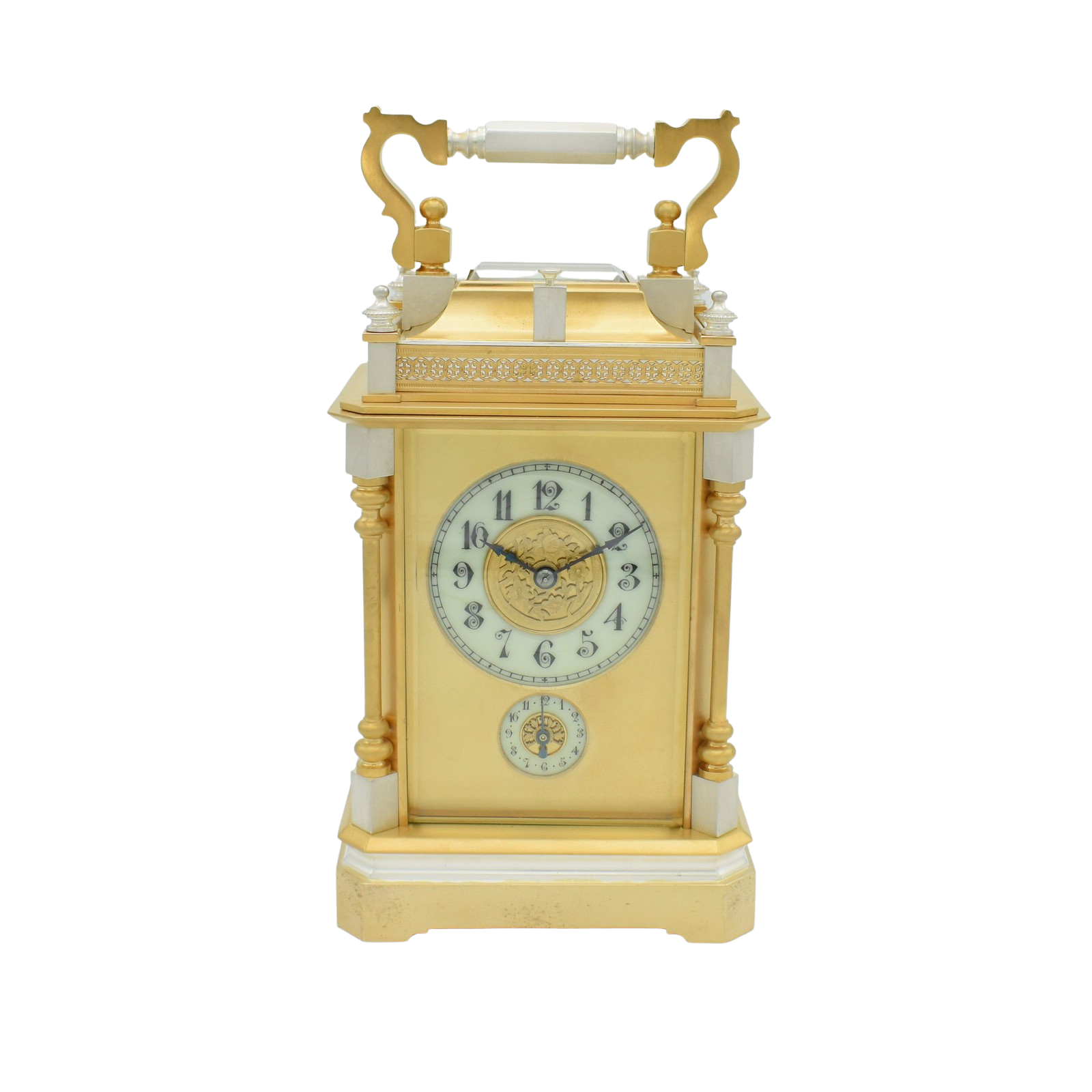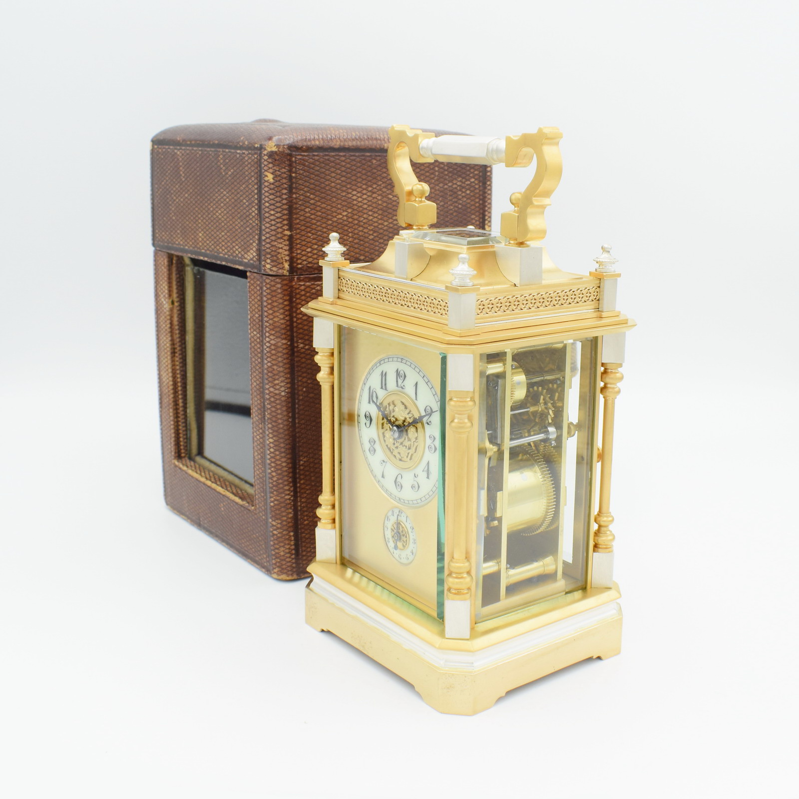 This is a little bit different! A very large and interesting repeating, alarm, striking carriage clock with the original leather covered travel case. Made by Richard & Co of Paris circa 1890. The design reminds us of the Classicism & Rococco French architecture and we’re sure that’s exactly what this clock was styled after. The case has been carefully constructed of gilt brass and silver plated brass giving a very appealing two tone appearance. We have painstakingly taken the whole case and movement to pieces – pictures can be emailed of the restoration. The clock has had a full overhaul and service and is sold with our 24-month guarantee. The original outer leather case has the corresponding number on it and is quite large to accommodate this substantial clock. Of the many different types of carriage clocks we have had over the years we have not had one like this. Quite unique and rare. RESERVED