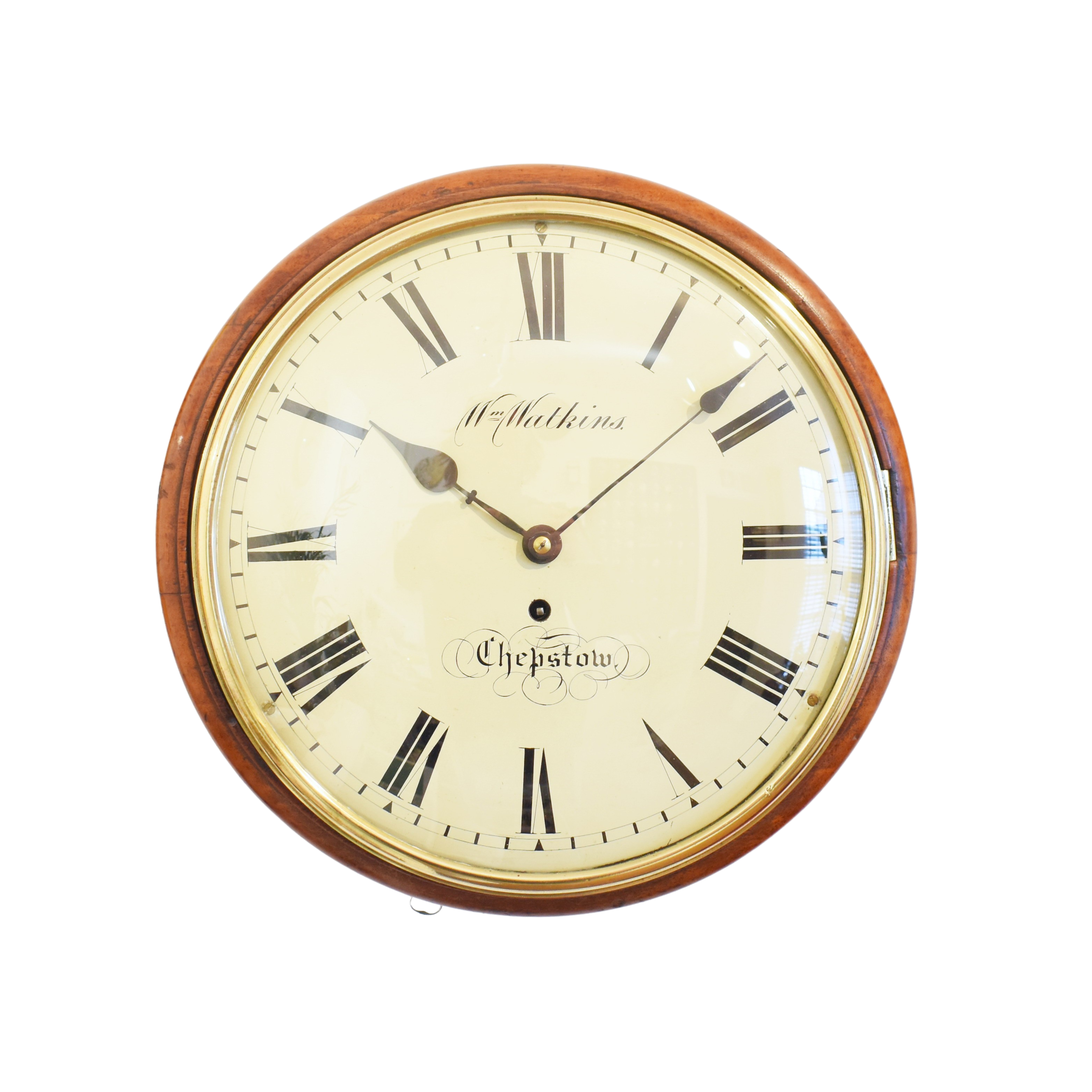 William Watkins was born in January 1826 and became a clockmaker in the town of Chepstow, Monmouthshire, Wales. This fine clock with a wonderful 12″ convex dial and original blued steel hands has a substantial fusee movement in quite a unique shape. The Mahogany case is well preserved and has two side doors and the lower convex door held with a lock and key. The cast brass bezel is the original and held with a latch. The photos really don’t quite get across how attractive this wall clock is. If you can pop in to our shop and see this in real life …we don’t think you’ll be walking out empty handed!