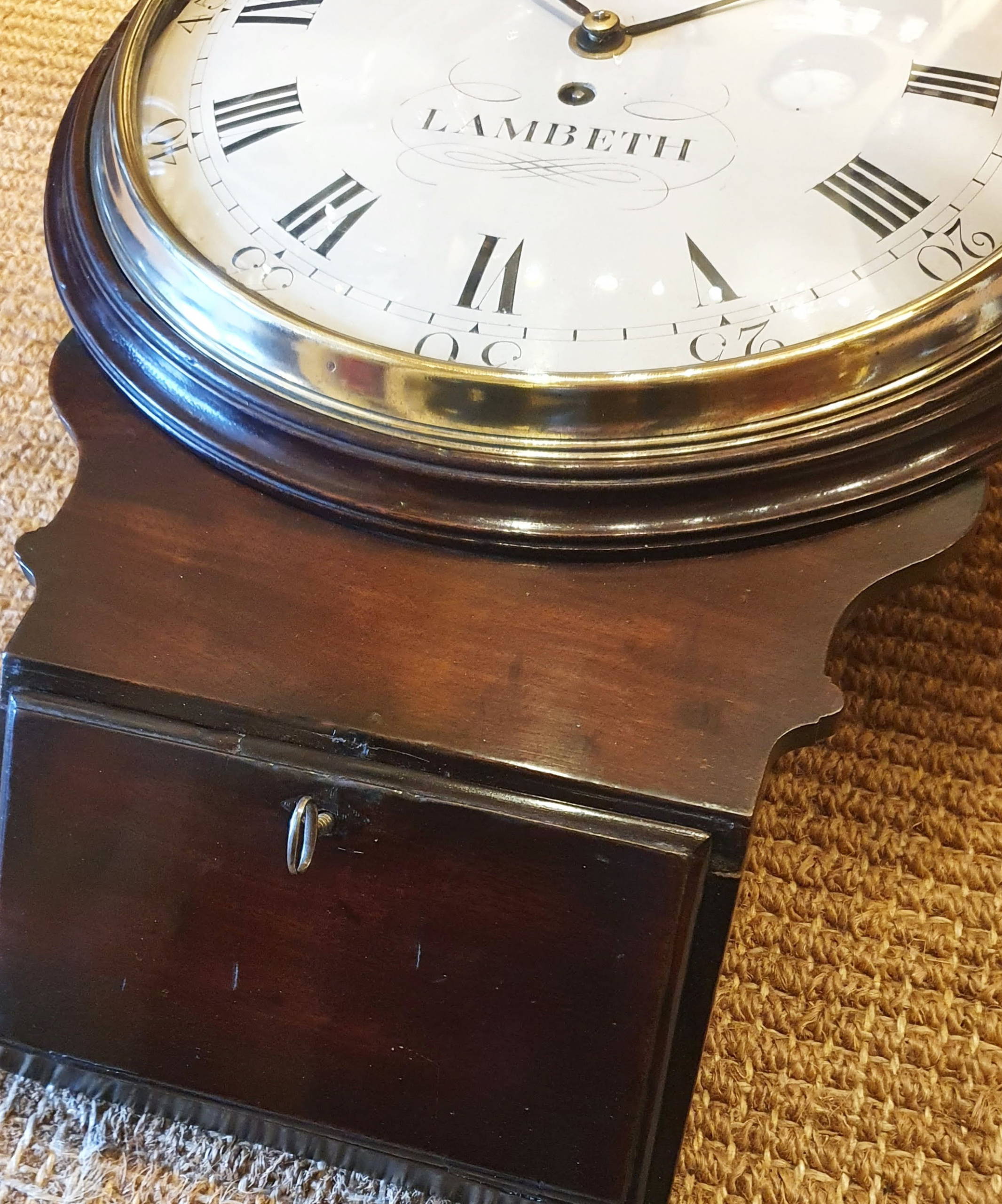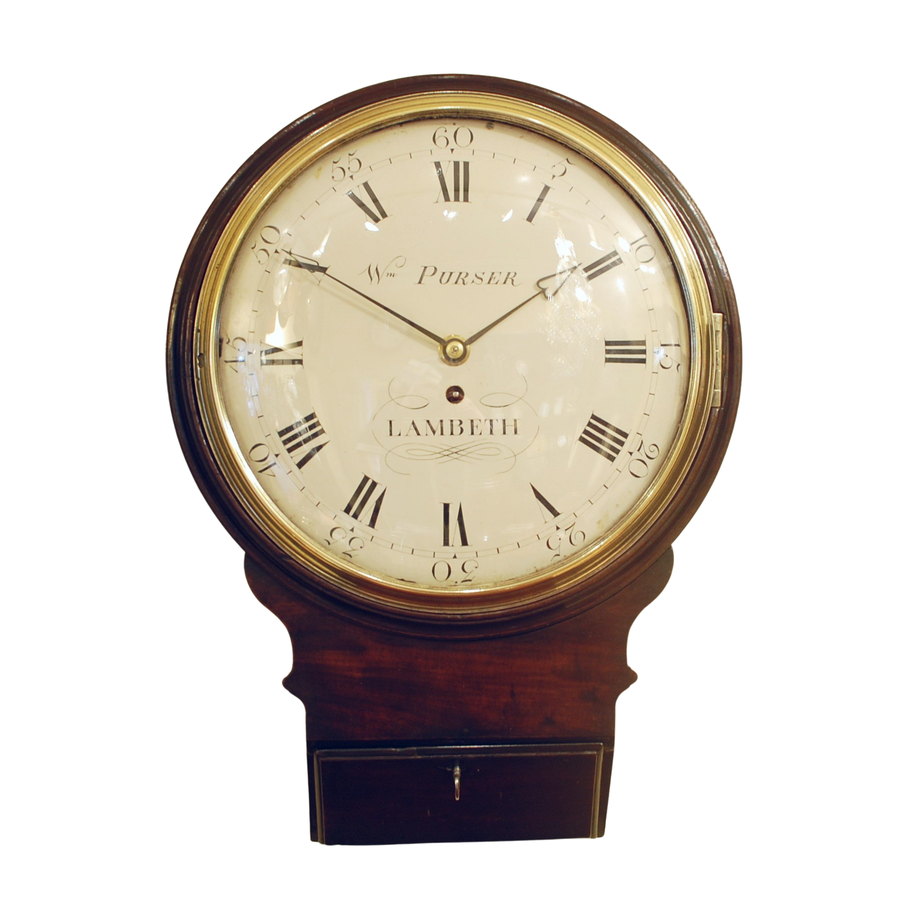 An extremely early fusee ‘trunk’ dial wall clock (timepiece) William Purser was working from 1780 and he would have made this circa 1800. The case is constructed of a Cuban mahogany and has the original wax finish. The lower trunk door is held with a lock and key. The brass bezel has a wonderful profile and is fitted with what looks like the original convex glass. The bezel lock was removed some time ago but has been fitted with a more reliable latch! The restored dial shows Roman numerals and outer Arabic’s. The hands are rather special too, a period design and both original. The proportions are perfect, allowing for a longer flat brass rod pendulum.