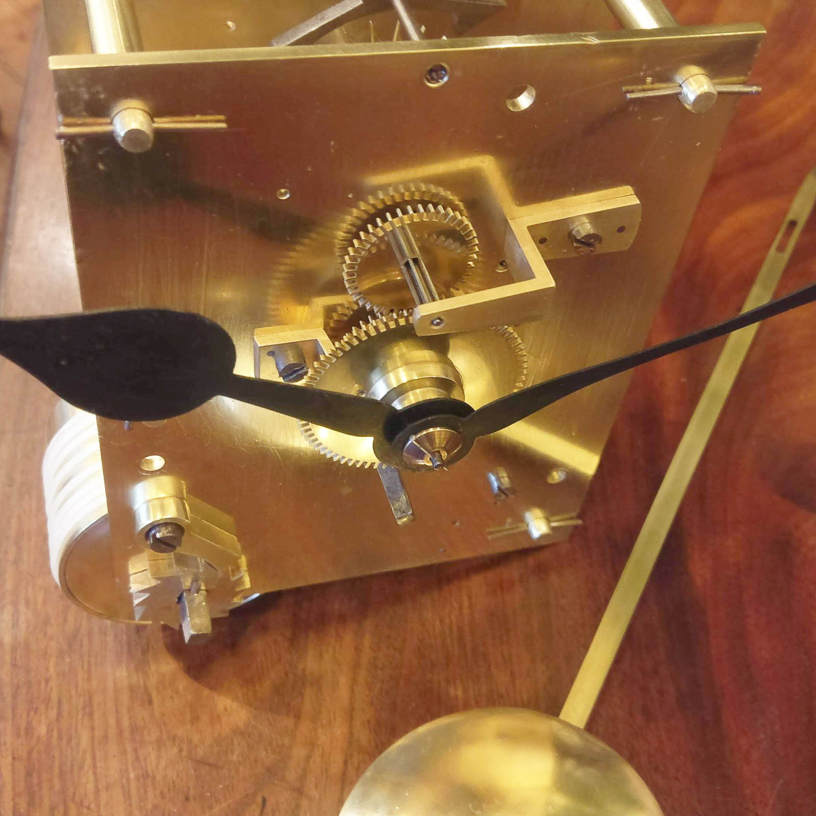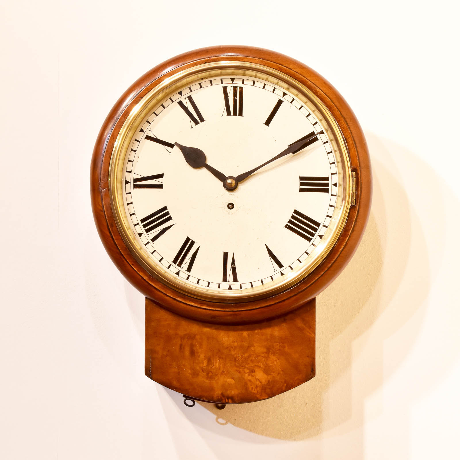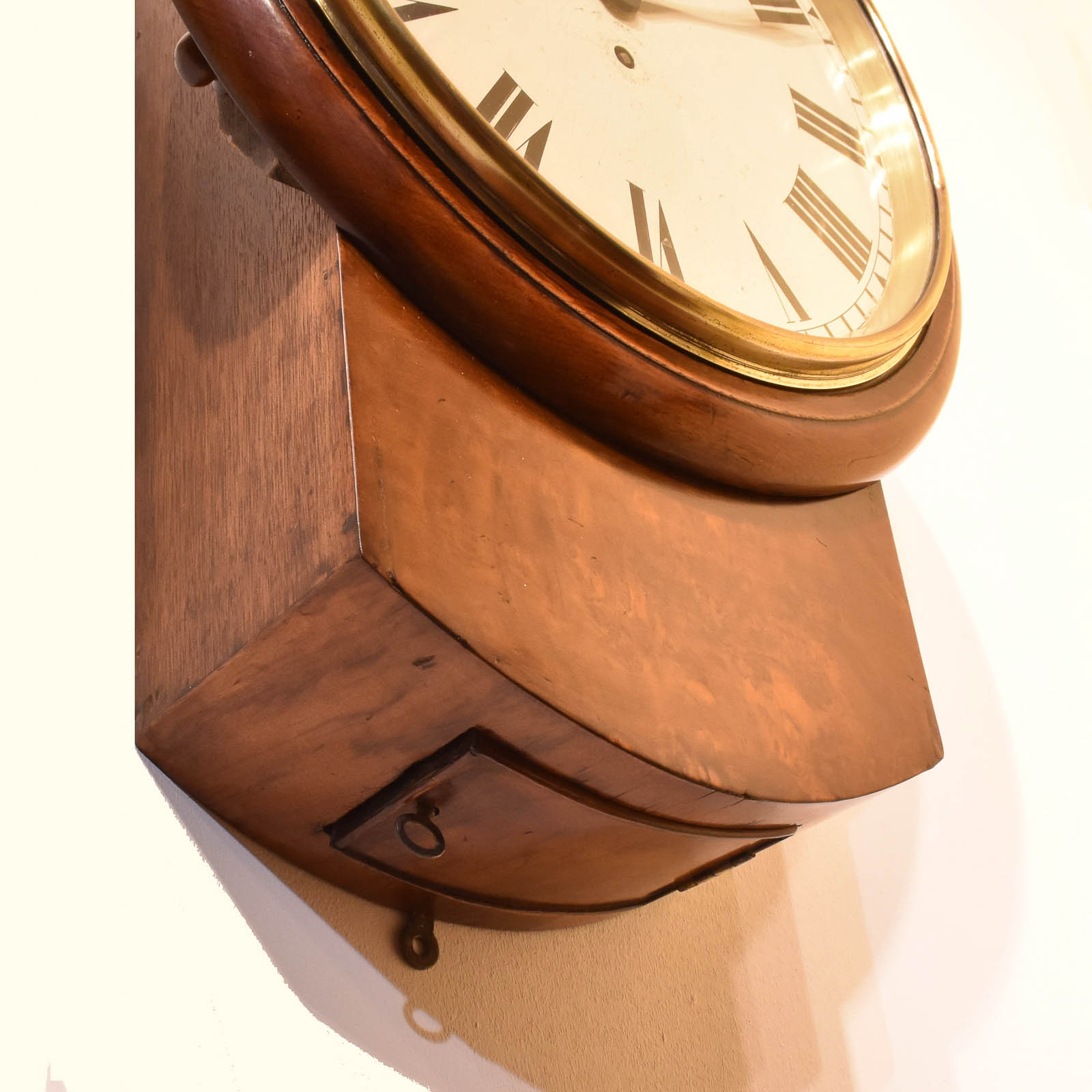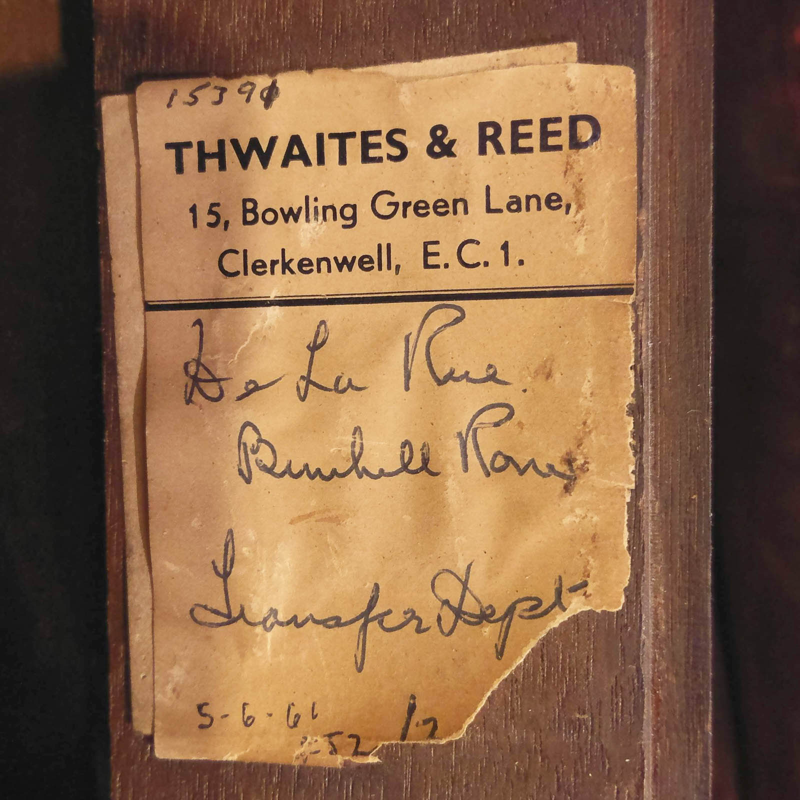 Here we have a rather interesting timepiece. The case is made of Walnut with a highly figured front panel. The clock has the usual lower convex door held with a lock and key and side door held with a latch, but what’s interesting is the fact that this clock was in the offices of De La Rue, a company which is still going strong today and who printed our British bank notes. The label shows it was taken from the Transfer dept for servicing by Thwaites & Reed of Bowling Green lane, EC1. The offices of De La Rue were in Bunhill Row, London. The clock features a fully overhauled single ‘fusee’ movement with long brass rod pendulum and Bob. Overall the clock has a pleasant warm colour and is ready to grace any interior, classic or contemporary. Sold with a full 24 month guarantee.