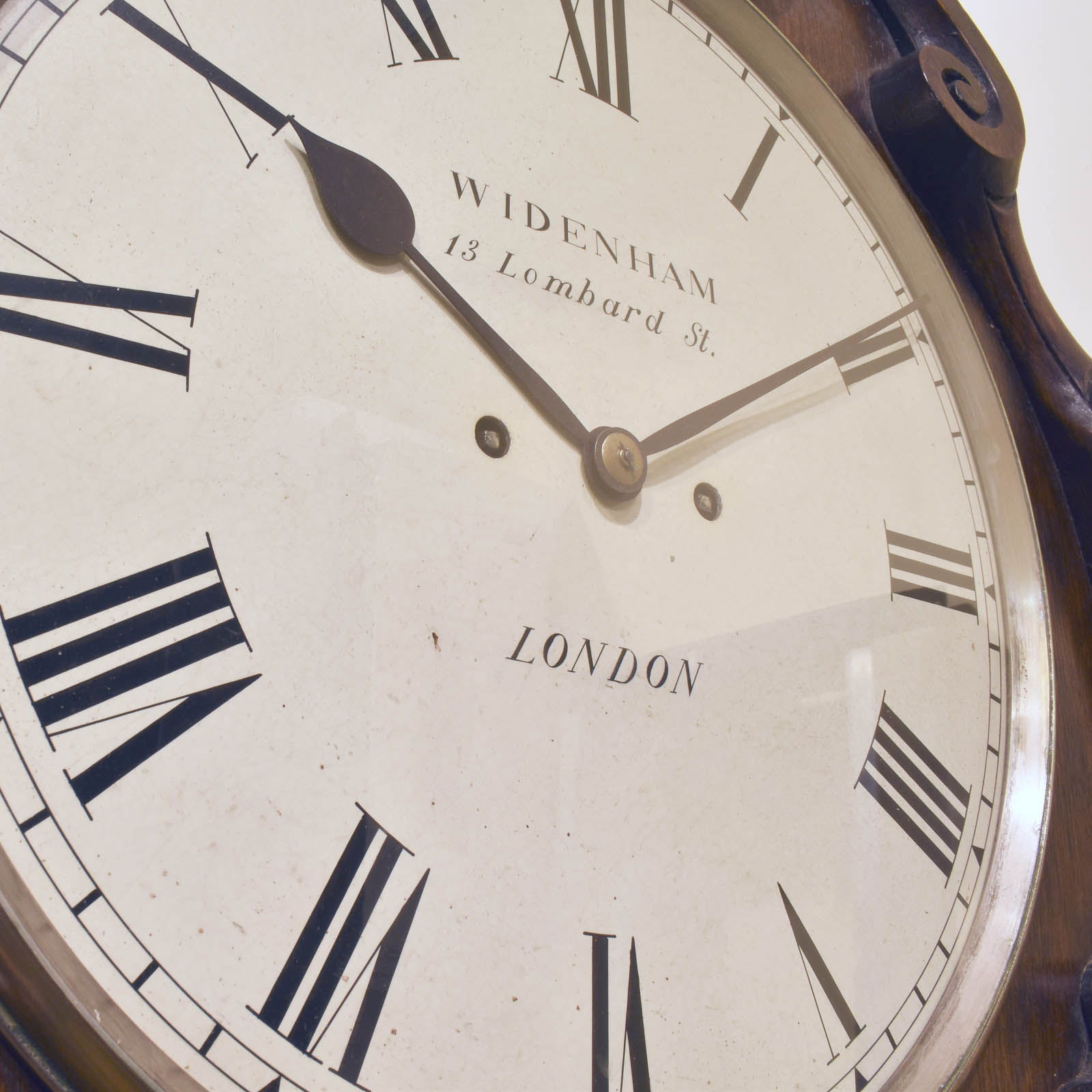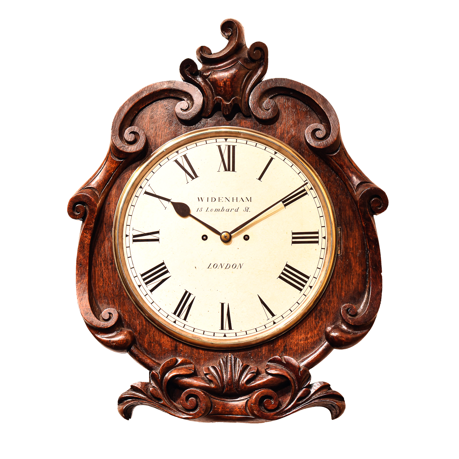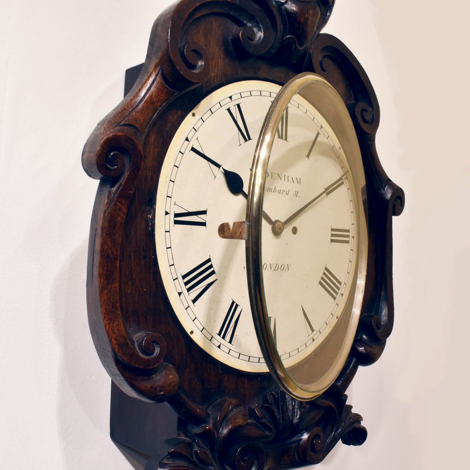 A superb Victorian wall clock with an unusually decorative asymetric carved oak case of good proportions. It has a superb quality twin fusee movement which strikes on the hour on a bell. Made by Widenham, Lombard St, London. Circa1850. The case has the classic ‘pegged’ back box with lower locking door with key and one side door to the right. Very reasonably priced for such a clock.