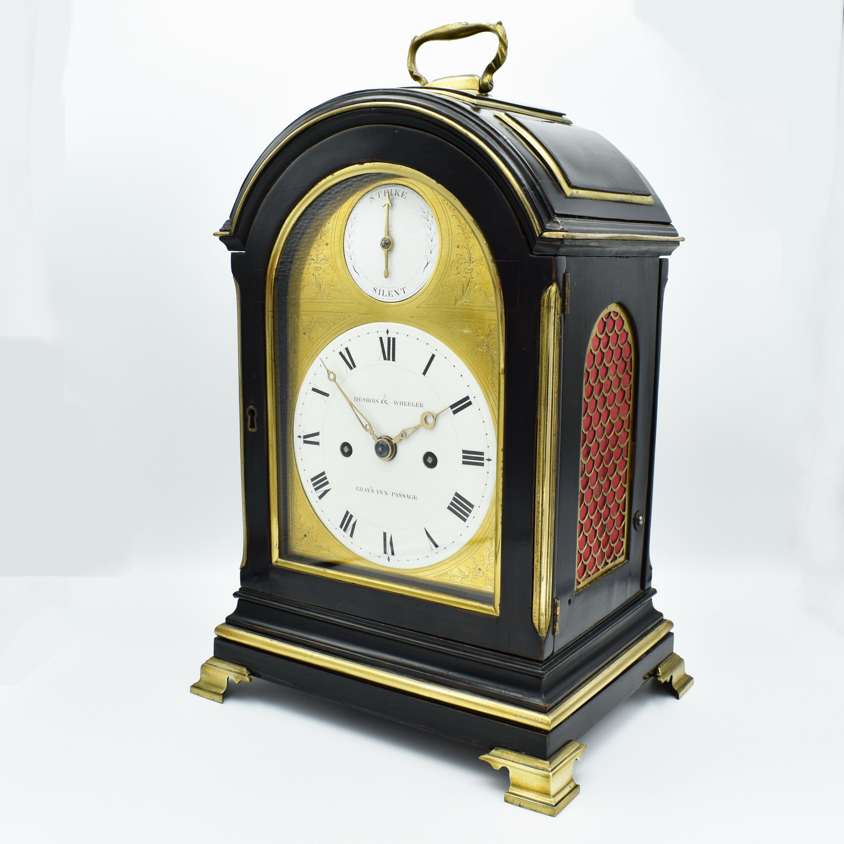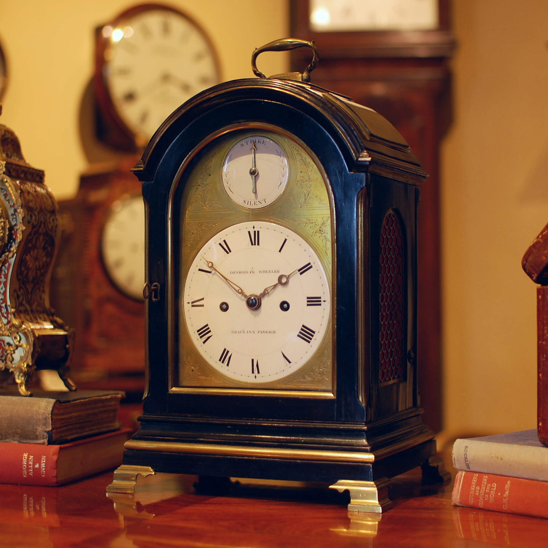 A fine and small Regency ‘Table’ or ‘Bracket’ clock from the partnership of Daniel Desbois (1773-1848) and Mr Wheeler (trying to find out more info). They were active from 1790-1835 and produced some of the finest clocks and watches of the Regency period. They had a premises at No 9 Gray’s Inn Passage in Central London. This clock has just arrived and will going through a full restoration. The clock has strike – silent to the arch, pull repeat and unusually the clock features an enamel and engraved brass, dial. This dial arrangement is ‘by far’ the rarest, and to us, the most desirable. It is complimented with a pair of gilded brass hands. Importantly it is the size of this clock which makes it very unique. More to follow ….Please call or email to reserve!