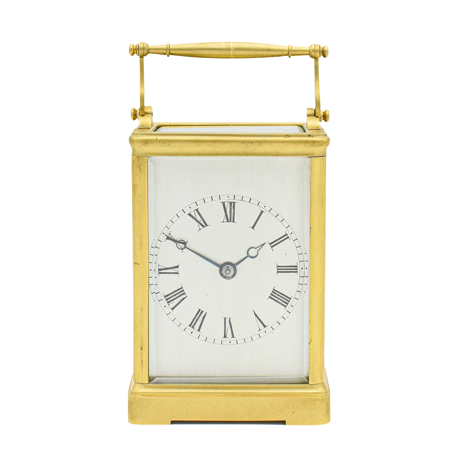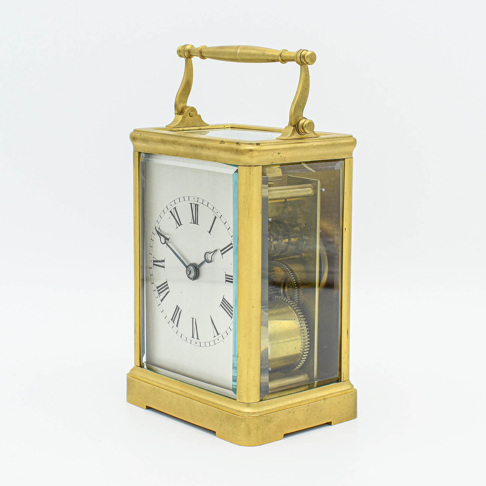 A fine and early carriage clock. The case is constructed as ‘ multi-piece’ case with solid rear door and early handle design. The original and unusual jeweled lever, platform escapement is superb and untouched. The clock is ‘countwheel’ striking on a bell and can be left silent (if you do not wind the strike side). The Silvered dial showing Roman numerals and true Breguet hands. The bevelled glass to all sides are perfect. The clock is stamped Dixon et Fils and the plates are stamped with a small stamp for Raingo Freres established in 1813. we would date this clock to aRound 1820-30. This is a very original, rare and early carriage clock that would appeal to the collector or investor.