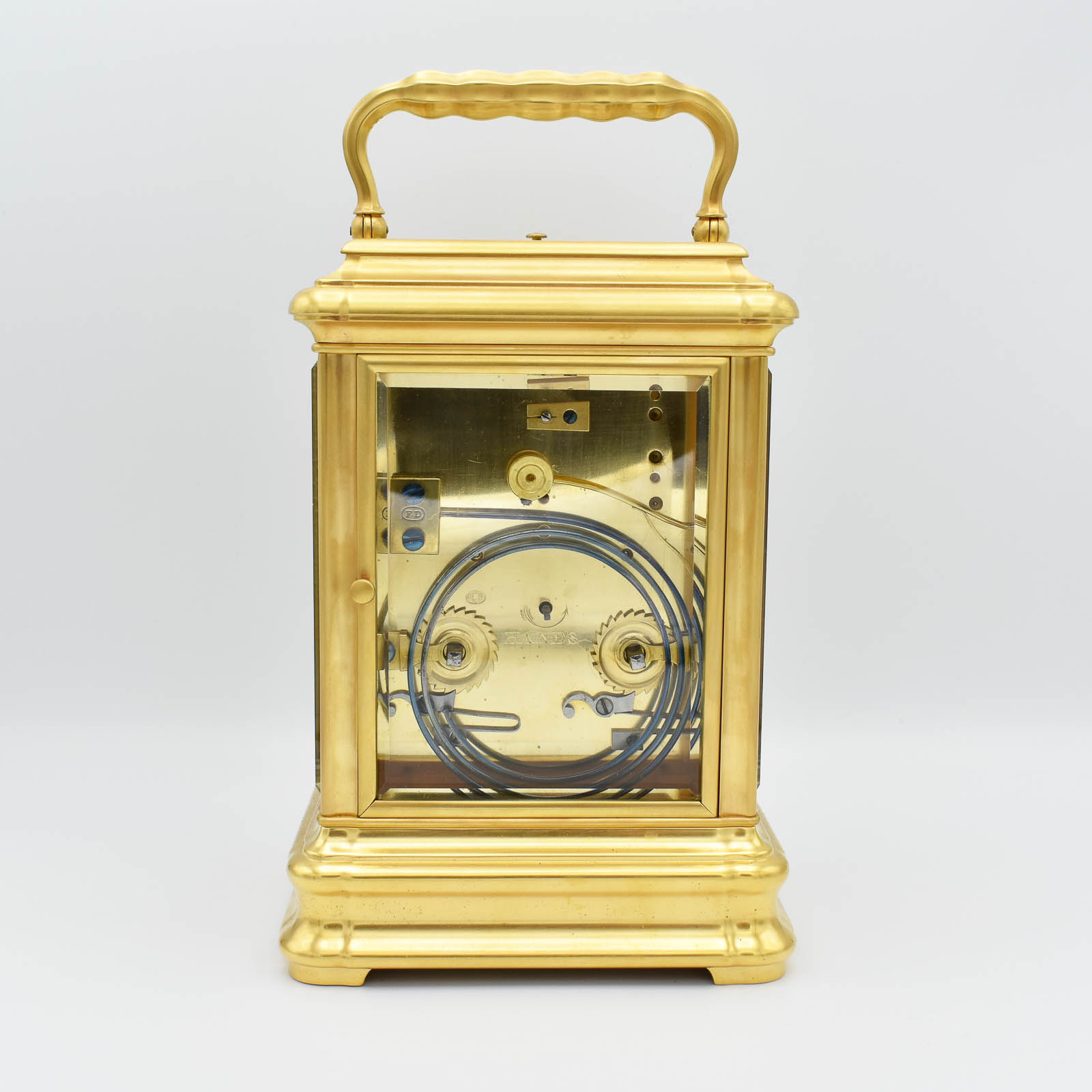 An exceptionally large or ‘Giant’ carriage clock by the well known maker Drocourt. The back plate is stamped and numbered 6806. Alfred and Pierre Drocourt were both superb clockmakers, they had a factory in Saint-Nicolas-d’Ailermont, which was regarded as the most important town for carriage clock manufacturing. The majority of their clocks would go to their Paris premises and dispersed amongst the world’s top retailers of that time. They exhibited at the major exhibitions winning a Bronze medal at Paris 1867, the Silver at Paris 1878 and the gold at Paris in 1889. The son, Alfred, succeeded his father Pierre sometime in the 1870’s. This clock has a soft/mellow gong strike on the hours and half hours and repeat button. The finely engraved dial mask is typical of Drocourt and the proportions of this clock are excellent. A rare piece. Circa 1885-90.
