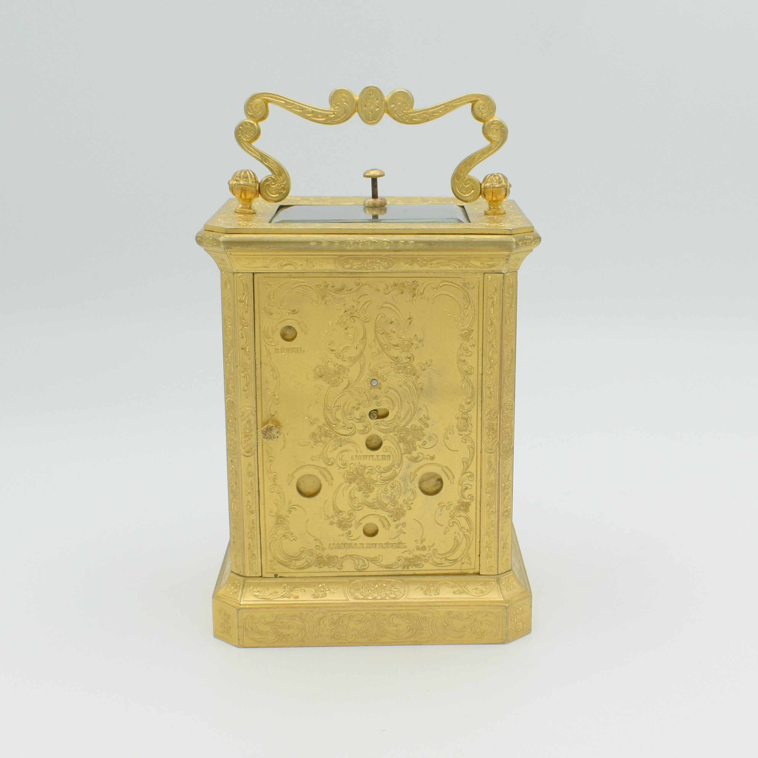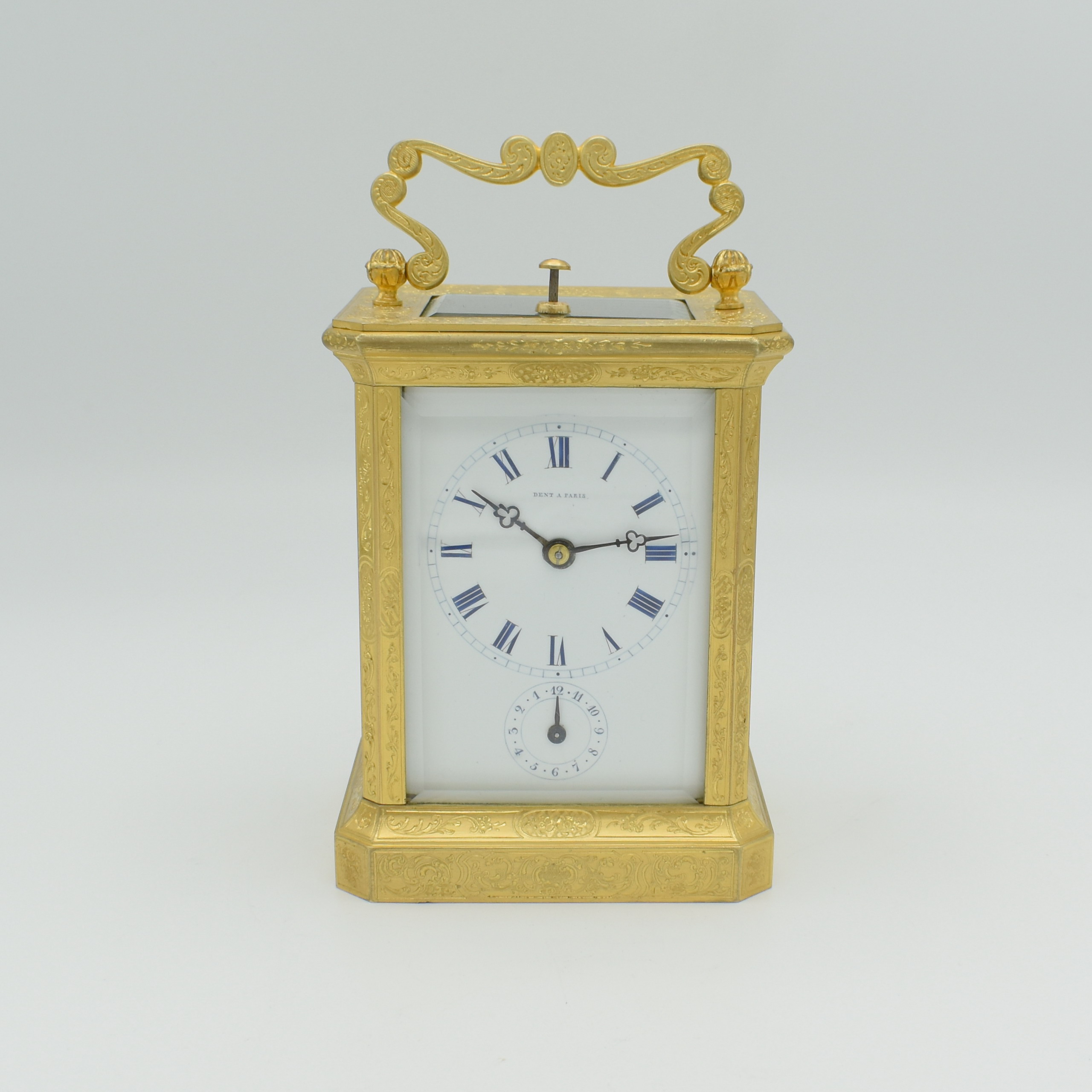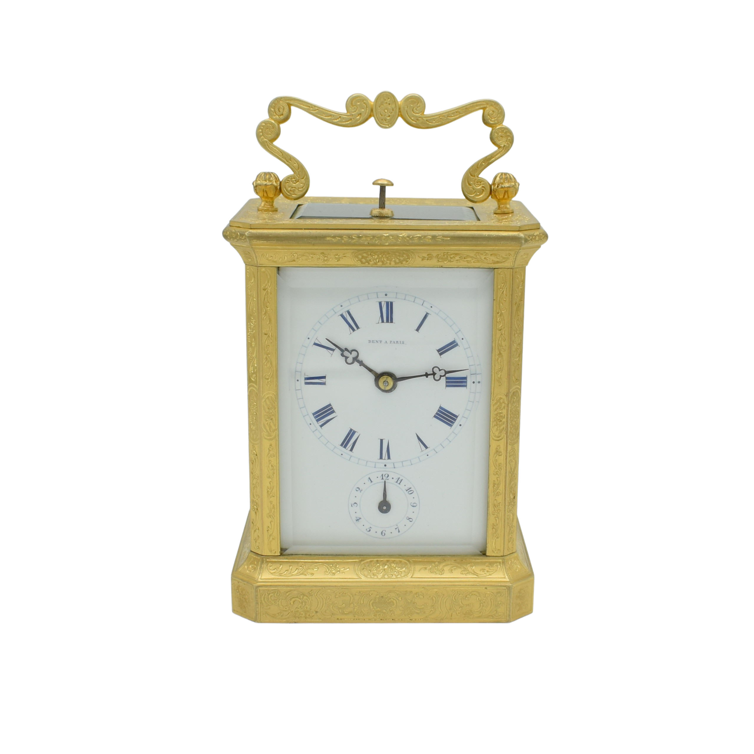 A fine early engraved carriage clock with a white enamelled dial showing cobalt blue Roman numerals and the retailers name Dent a Paris to the dial. Trefoil hands. Striking the hours and the half hours on a tuned bell and housed in a superb gilt ‘one piece’ case with hinged rear glazed door. The original lever escapement is the earlier type with mono metallic balance wheel . Edward Dent made the ships chronometer which accompanied Charles Darwin on the H.M.S Beagle in 1831 and of course built the great clock of Westminster (or ‘Big Ben’ as it’s known). This clock is also signed to the upper back plate and has the number 58 and 2723 which is the Paul Garnier number stamped into the back of the door. All bevelled glass and a shuttered rear door. Edward Dent used the Garnier workshops in Paris for the supply of the carriage clocks which he sold in his prestigious London establishments. Circa 1850.
