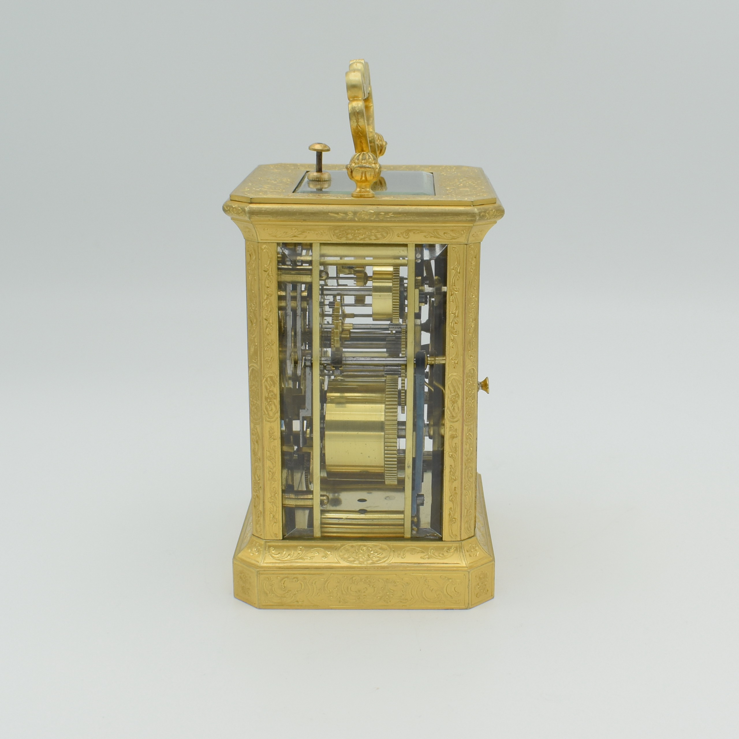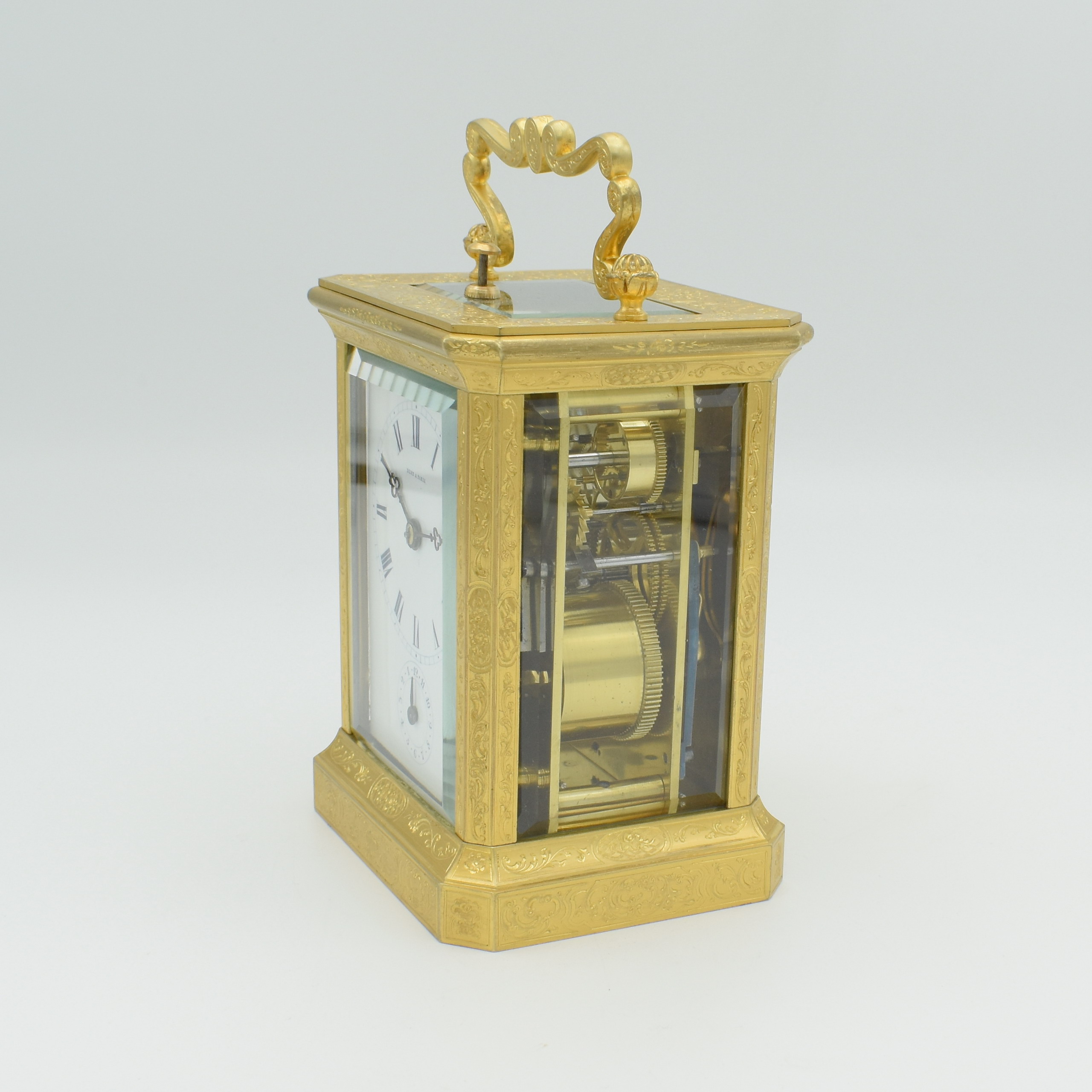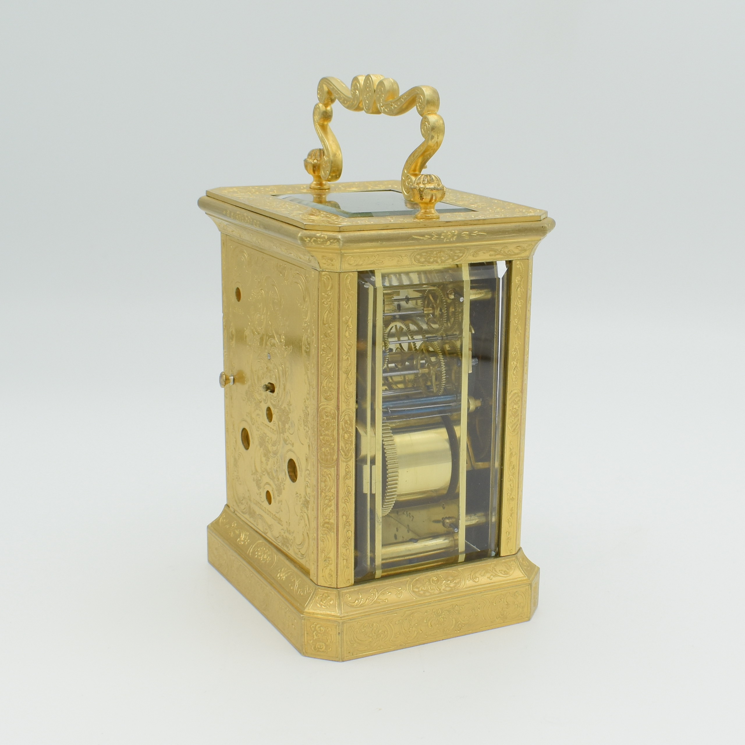A fine early engraved carriage clock with a white enamelled dial showing cobalt blue Roman numerals and the retailers name Dent a Paris to the dial. Trefoil hands. Striking the hours and the half hours on a tuned bell and housed in a superb gilt ‘one piece’ case with hinged rear glazed door. The original lever escapement is the earlier type with mono metallic balance wheel . Edward Dent made the ships chronometer which accompanied Charles Darwin on the H.M.S Beagle in 1831 and of course built the great clock of Westminster (or ‘Big Ben’ as it’s known). This clock is also signed to the upper back plate and has the number 58 and 2723 which is the Paul Garnier number stamped into the back of the door. All bevelled glass and a shuttered rear door. Edward Dent used the Garnier workshops in Paris for the supply of the carriage clocks which he sold in his prestigious London establishments. Circa 1850.