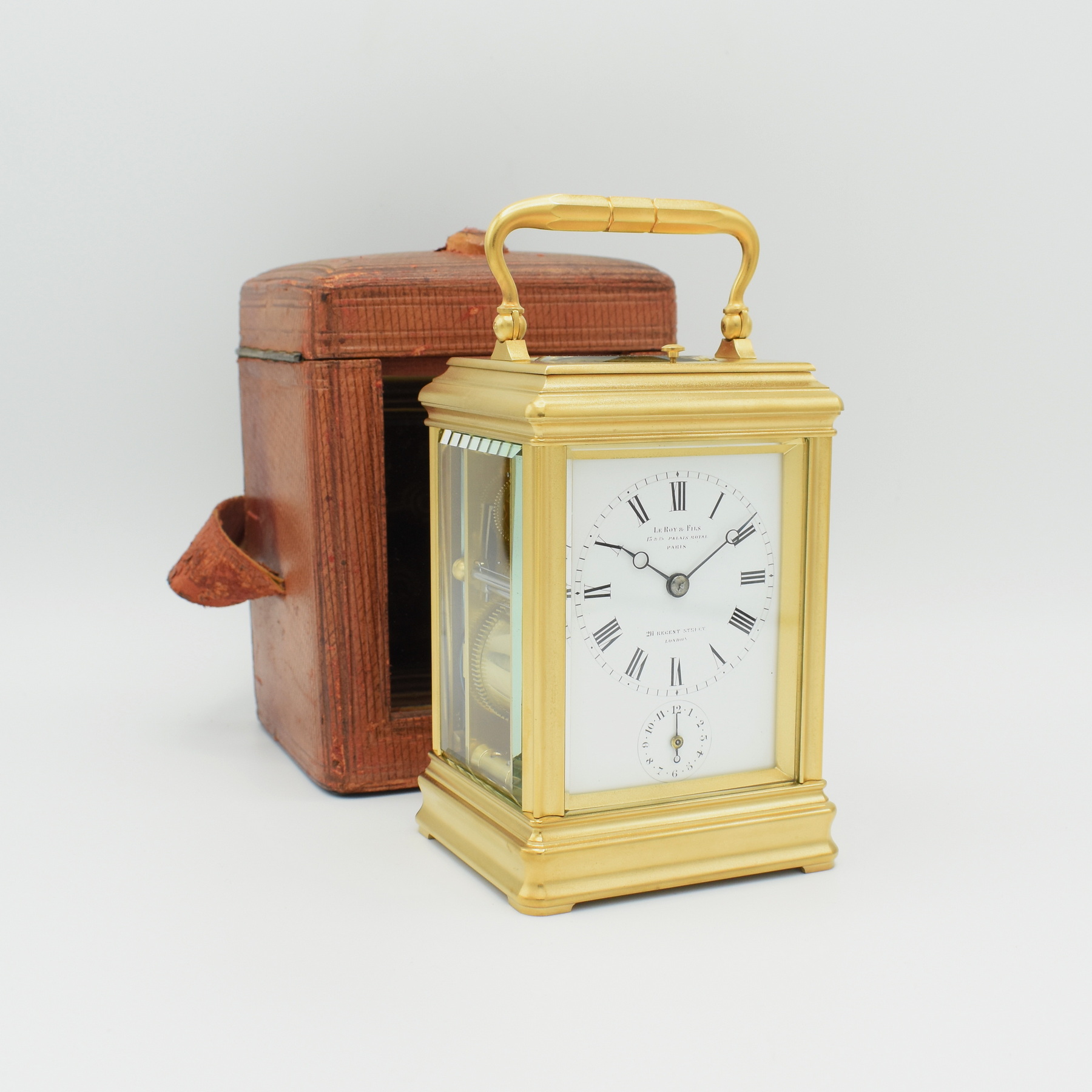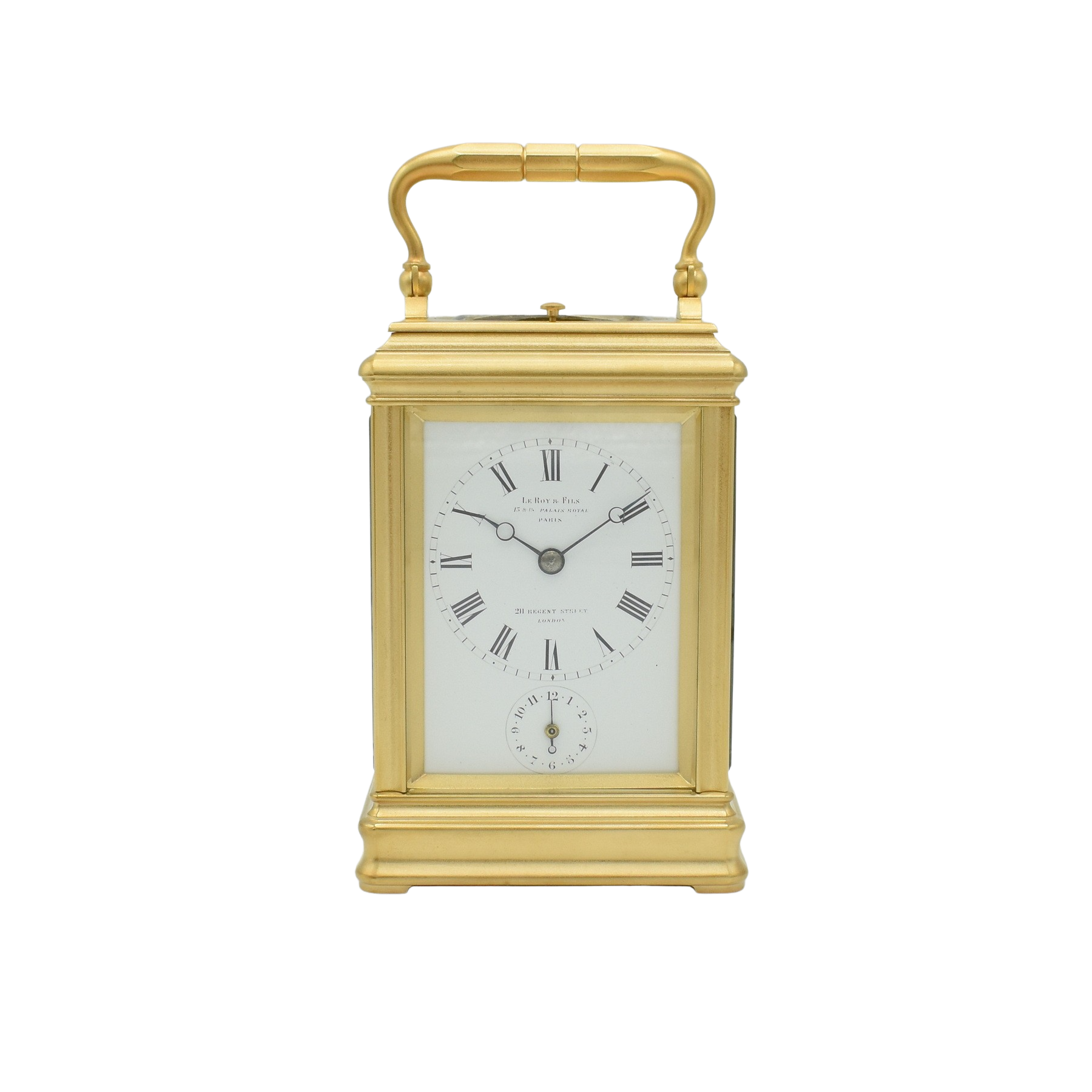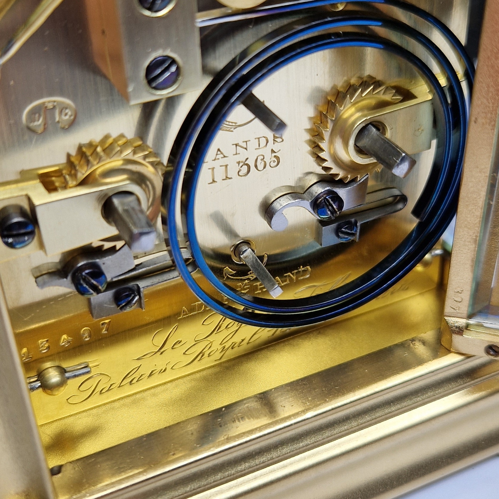 No11365 is a superb gilt Carriage clock with push repeat and alarm function, it was finished and retailed by the famous Le Roy & Fils, 211 Regent Street, London and of The Palais Royal, Paris. The clock was made by Drocourt and also bears their stamp and number (in small) on the backplate. The gilding on this clock has been carefully preserved (see macro images) and has that wonderful ‘orange peel’ finish you get with mercurial gilding. The outer protective leather covered case is in remarkable condition with glass panel and slide, we can assume the fact that this clock has been protected in the outer case for the last 140 years has preserved this rare finish seldom seen these days. The clock strikes on a soft gong and has hourly and half hourly strike. Circa 1890.
