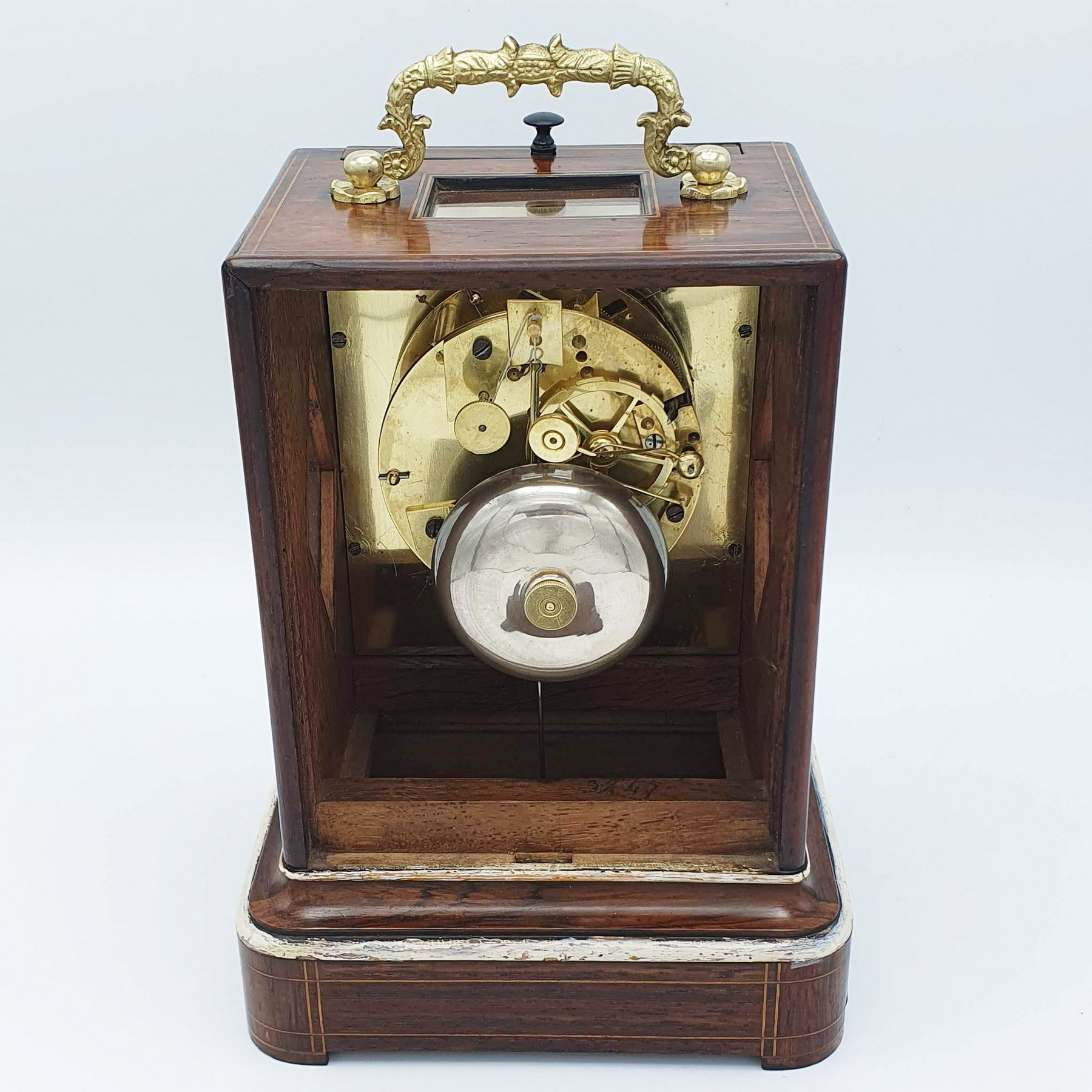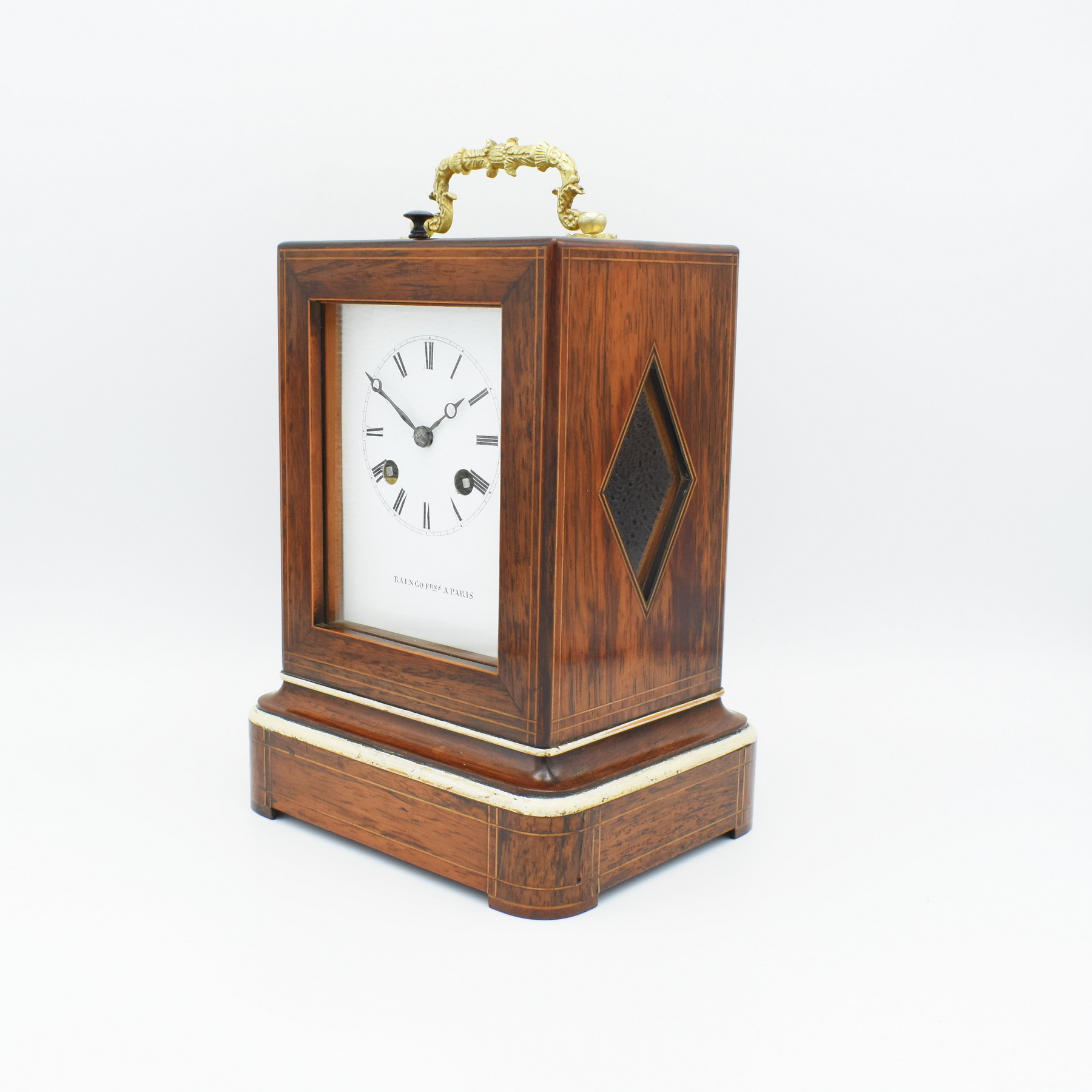 An attractive French mantel clock with a silk suspension in the ‘Pendule portative’ style with a decorative carrying handle. The glass is removed upwards to wind the clock and set the time via the tiny ebony handle. The dial is vitreous enamel showing the makers name and Roman numerals, it does have very slight chips around the winding holes but you have to be very close to see them! The clock is of 7 day duration and has a bell strike for the hour and the half hour. The case is Rosewood with boxwood inlays of geometric style. A glass aperture to the top and one to each side in a diamond shape. The rear door opens to reveal a fully overhauled mechanism stamped with the Raingo stamp. The clock was made and retailed by Raingo of Paris who produced superb clocks throughout the mid 19th Century. Zacharie Joseph Raingo (1775 – 1847), a clockmaker was born in Belgium in 1775. Z.J.Raingo specialised in creating astronomical or Orrery clocks. One of these a planetary pendulum clock made in 1824, was purchased by King George IV of England and is now housed in Windsor Castle. When servicing this clock we discovered that the spring had been lightly scratched with the date 1846, we think this may date the clock quite accurately.