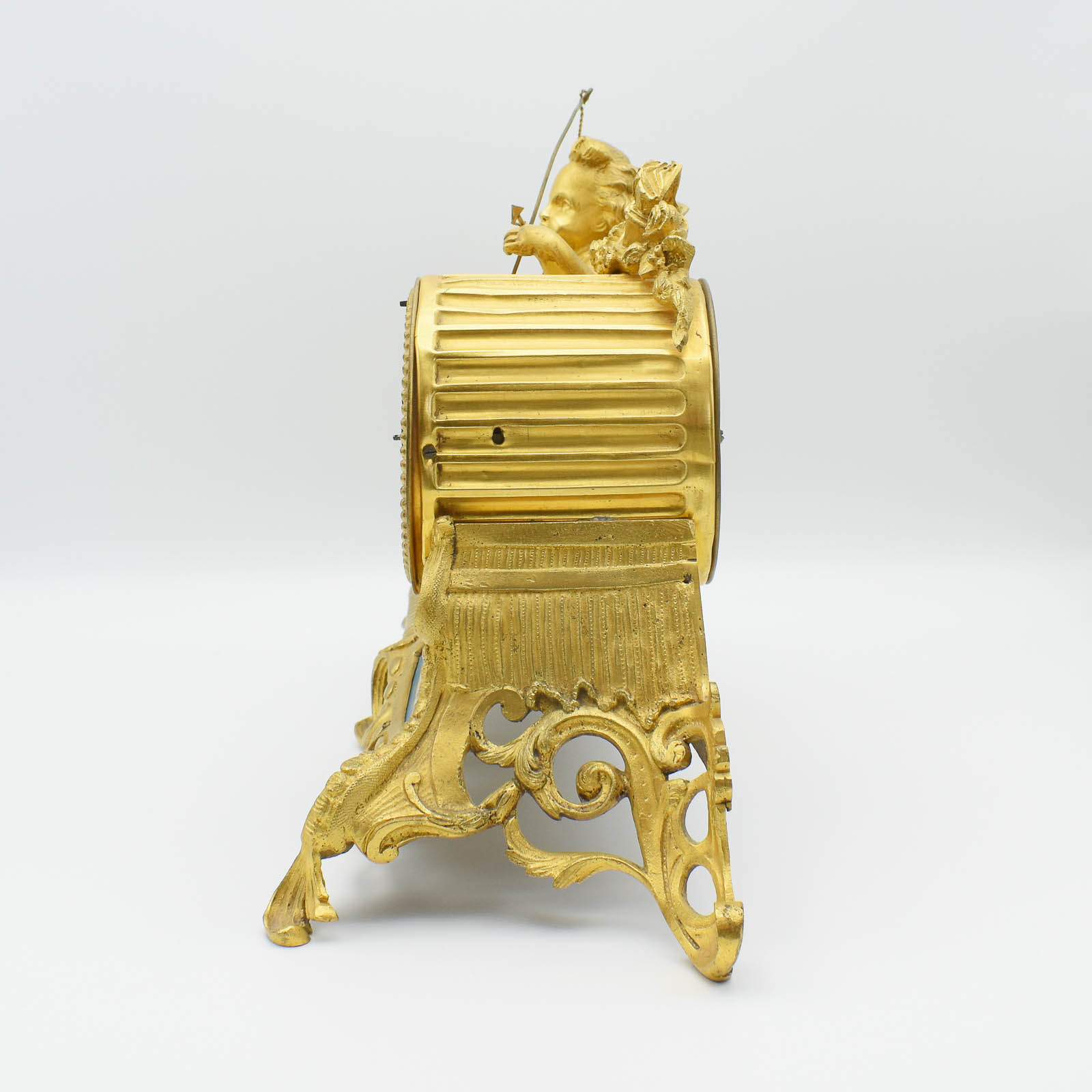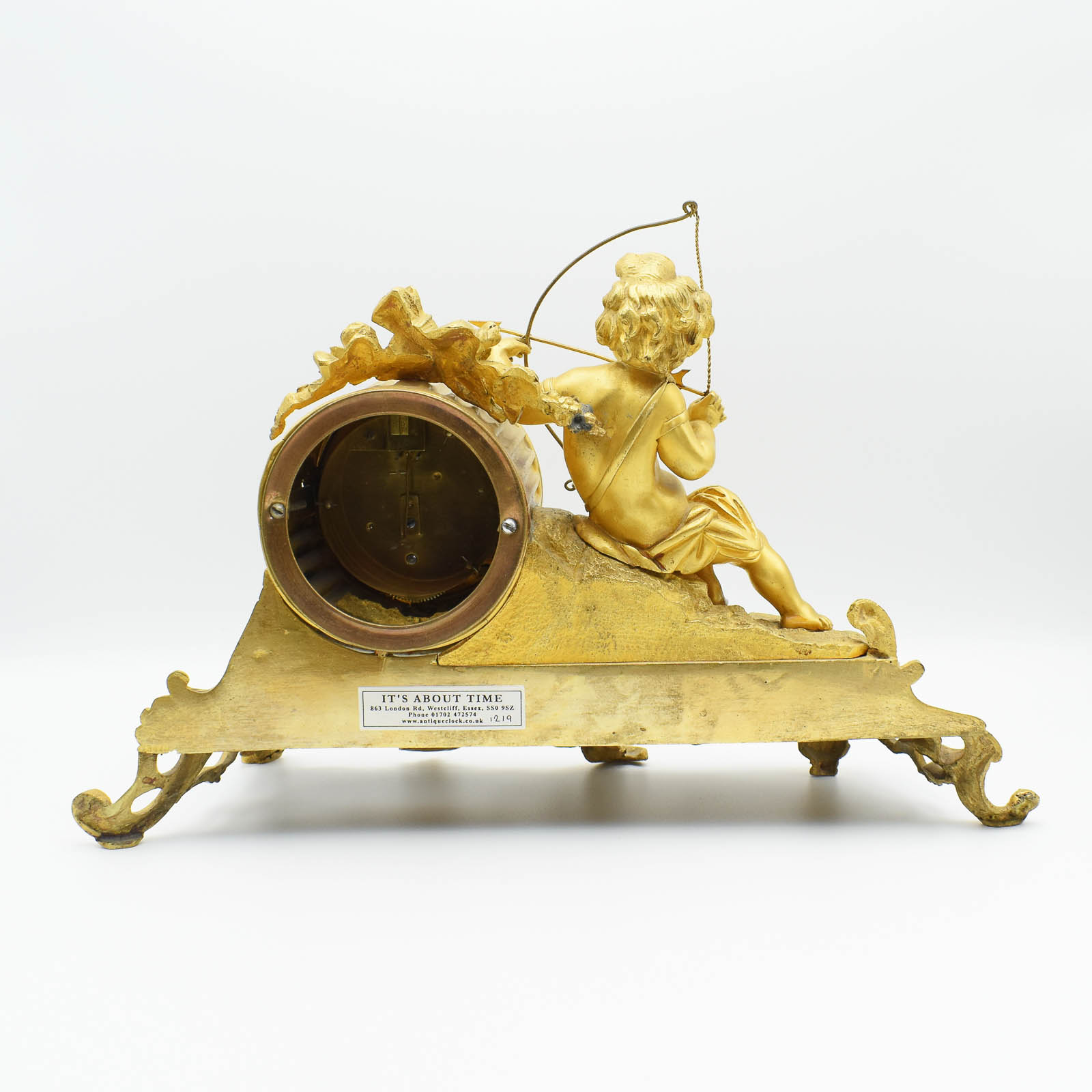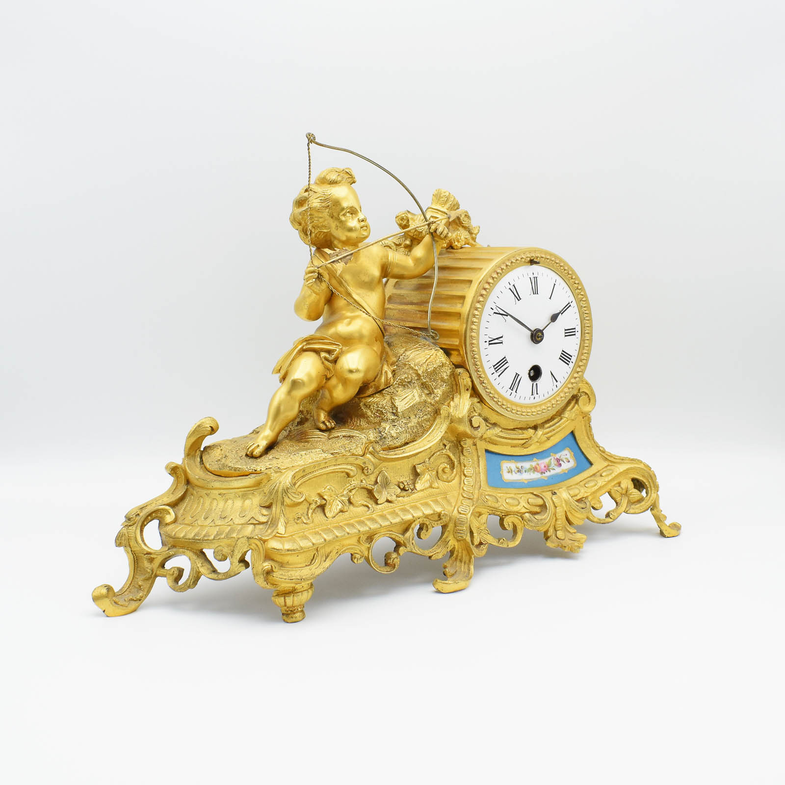 A delightful French timepiece decorated with a Cupid firing the arrow of love. The clock is non-striking which may please some of you! It’s gilded Brass (Ormolu) and will fit most mantels. A small Sevres panel decorates just below the dial.