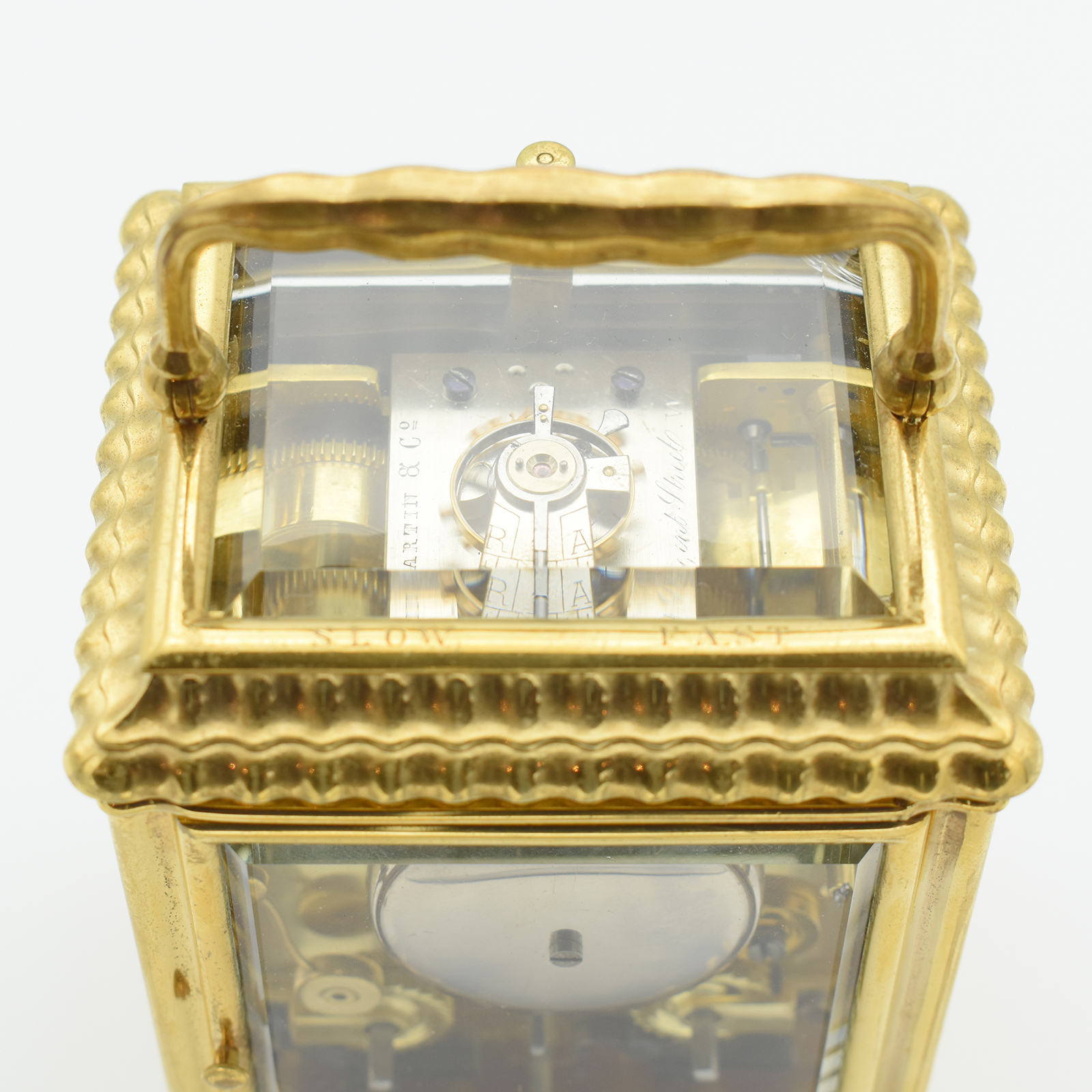Well you don’t see one of these very often! We last had a ‘Gadrooned’ gorge case carriage clock around 10 years ago and at that time, that was the first we had ever seen. Now we have a slightly superior one for sale as this one has push repeat and alarm function. The clock strikes the hours on a bell and has a half hour with a single blow of the bell. The case still retains the original gilding, slightly worn but looking bright and very attractive. Original ‘Breguet’ style hands, a white vitreous enamel dial showing Roman numerals and a fine, silvered and jeweled lever escapement engraved T.Martin & Co., 151 Regent Street. Another unusual feature of this clock is an engraved ‘Slow – Fast’ to the top bezel, helping with adjustment of timekeeping.