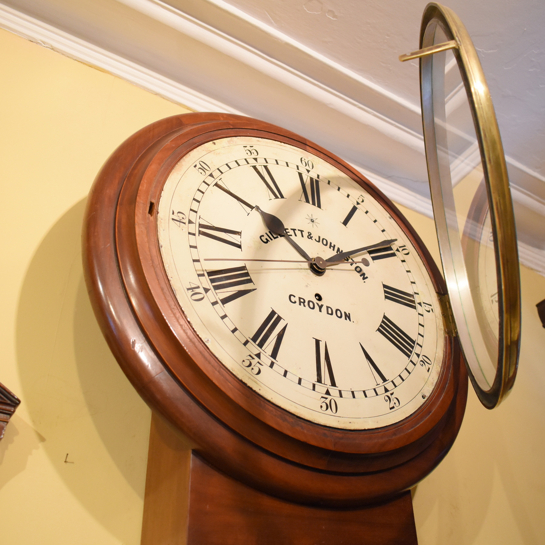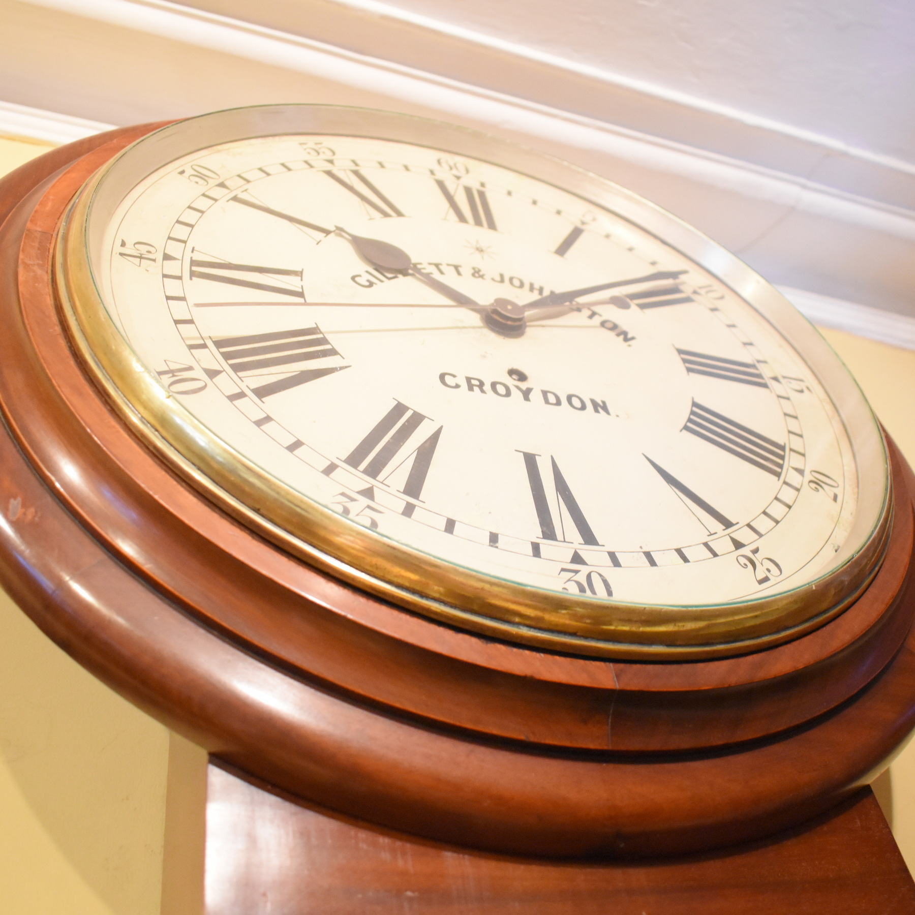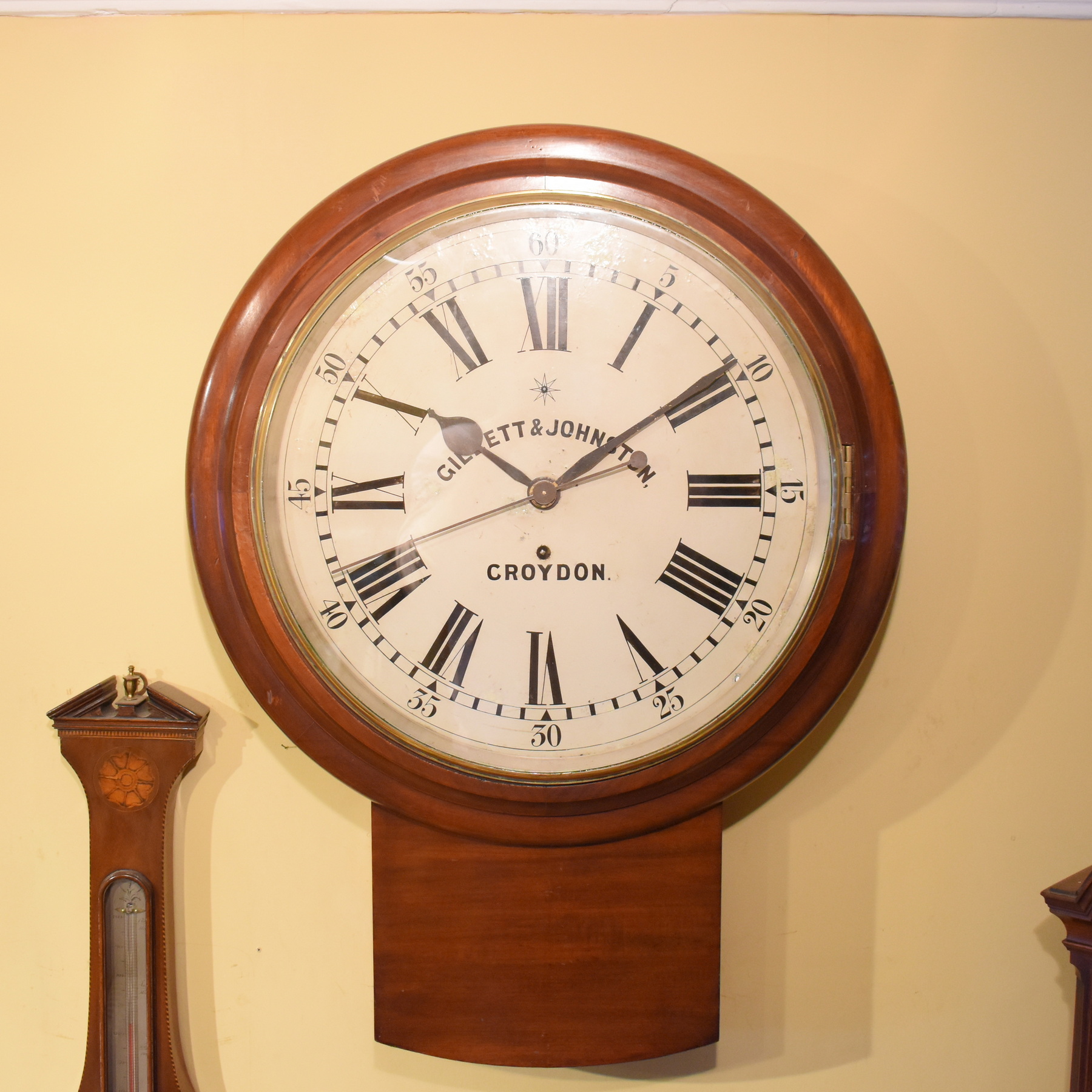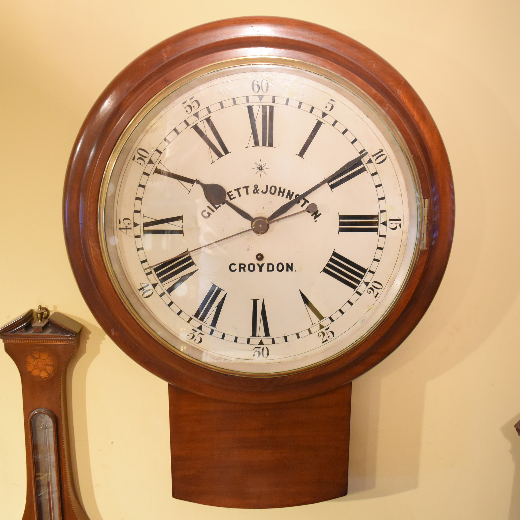 An enormous 18 inch dial regulator wall clock in excellent condition. With a sweeping second hand, large roman numerals and outer minutes around the dial, this clock is particularly rare. It is signed Gillett & Johnston of Croydon, a known maker and bell foundry, established in 1844. Made around 1890, the single fusee movement has been fully overhauled, along with fine quality mahogany case and huge glass door over the dial, making this an especially impressive timepiece.