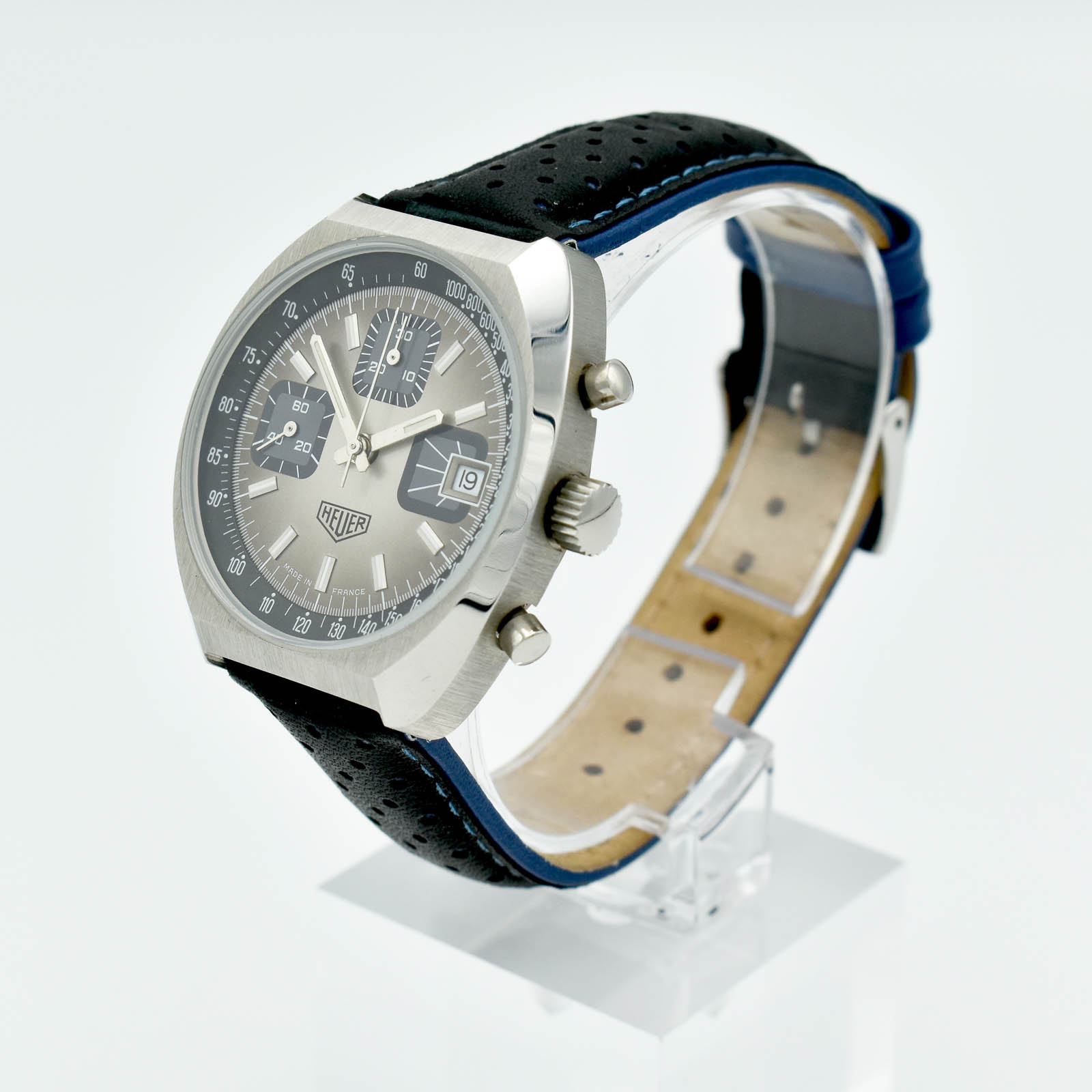 Heuer, ref. 1614, a stainless steel chronograph wristwatch, circa 1979, manual wind movement, 17 jewels unadjusted, cal. Valjoux 7765, grey fume dial with charcoal sub dials, applied steel baton hour markers, pointed steel hour and minute hands with luminous inserts, steel chronograph hands, date aperture at 3 oclock, inner tachymeter bezel, screw down case back, dial signed, on a non-original Blue-Black leather strap with pin buckle. The watch looks unworn, new-old stock. It does not have the original Box and papers but will be supplied with a good quality box and of course our 18 month guarantee. An outstanding example from around 1979!The dial colour is difficult to see on the computer monitor but is an Indigo Blue colour with 3 chrono sub dials in blue as well. The perforated sports strap has a blue background which compliments it quite well.