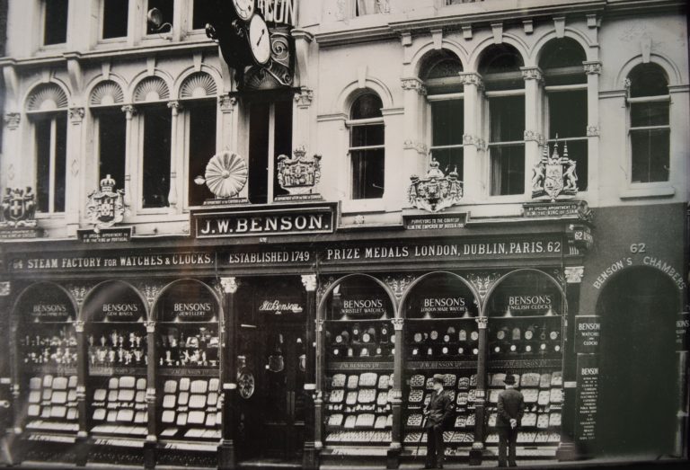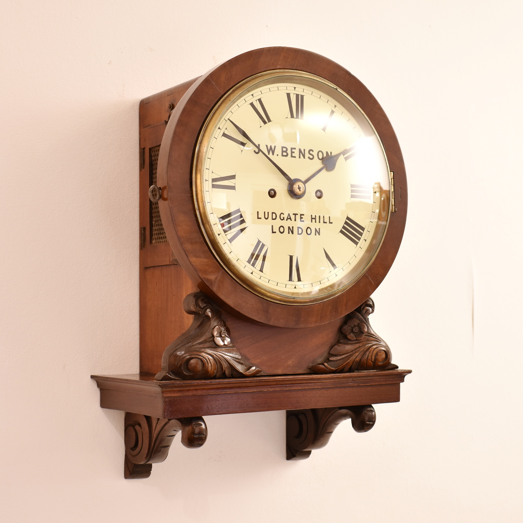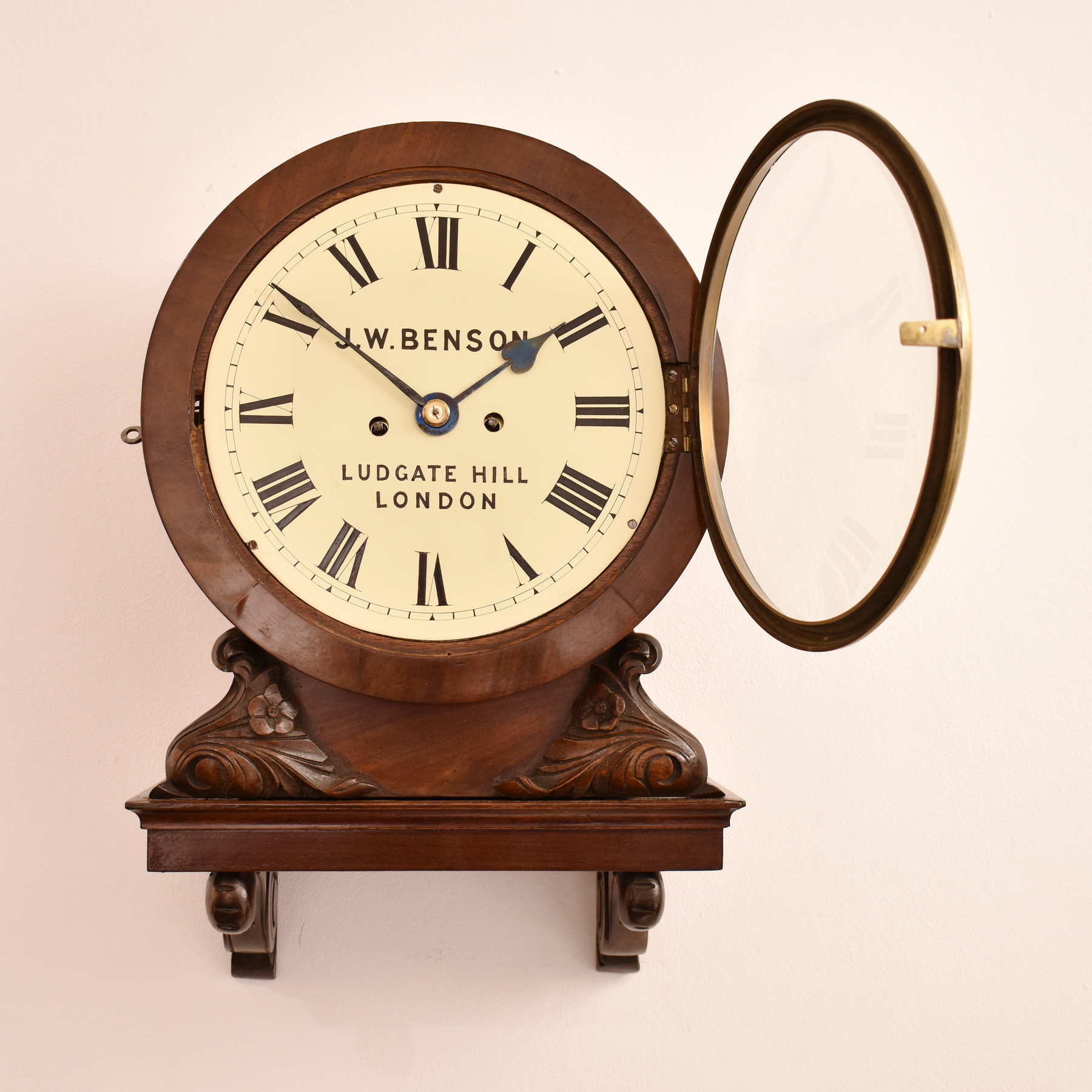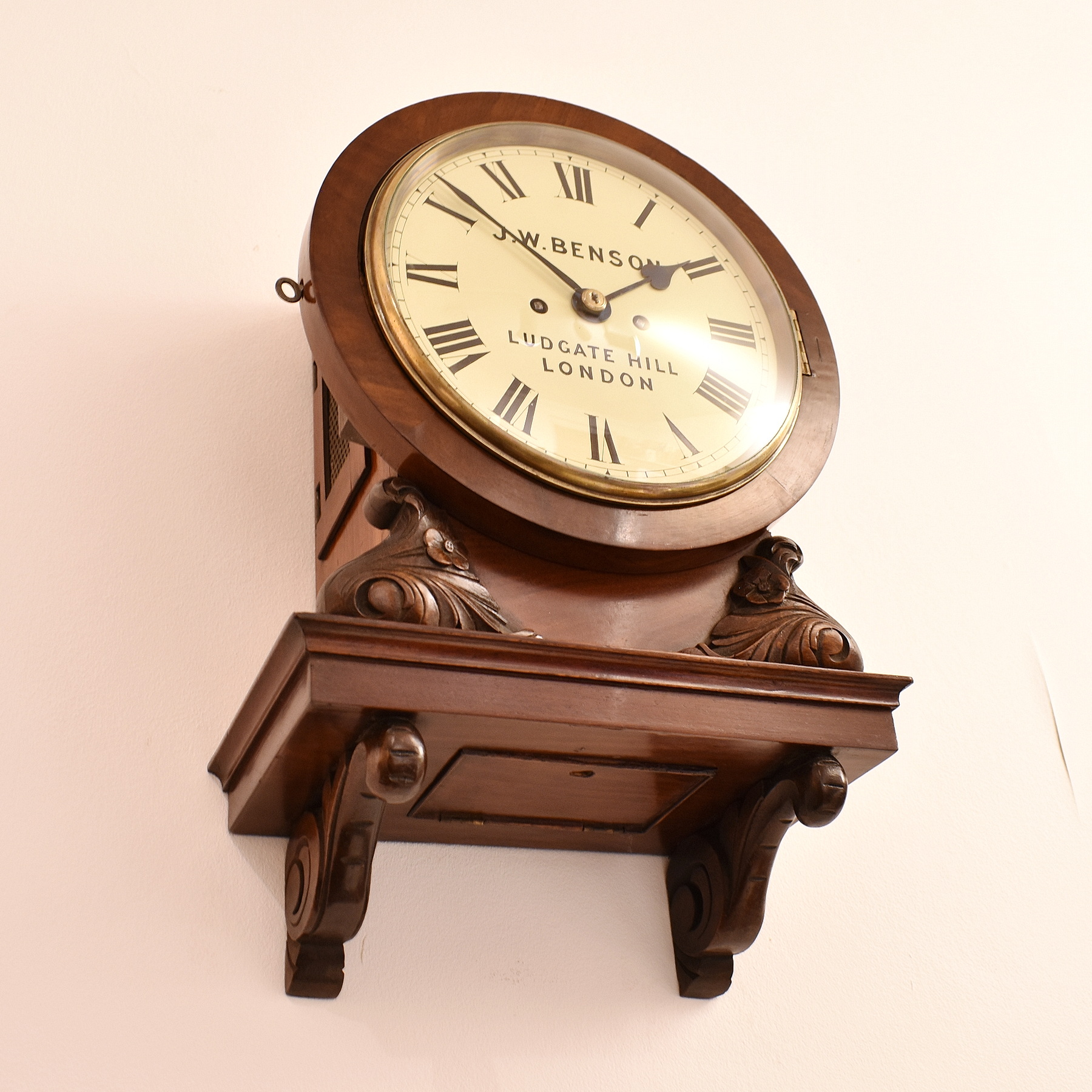 A fine and small striking wall clock by J.W.Benson of Ludgate Street, London, styled as a wall/bracket clock. The Red Walnut case is of good colour, hung from the top, with a faux bracket and decorative floral carvings to the trunk, as well as stylish twin side panels and locking bottom door. The clock is nicely balanced with a wide surround and 8″ cream enamel dial, brass bezel and convex glass cover. A substantial and fine quality twin chain fusee movement, bell striking on the hour, which is unusual for a clock like this and it will run for 8 days on a full wind.