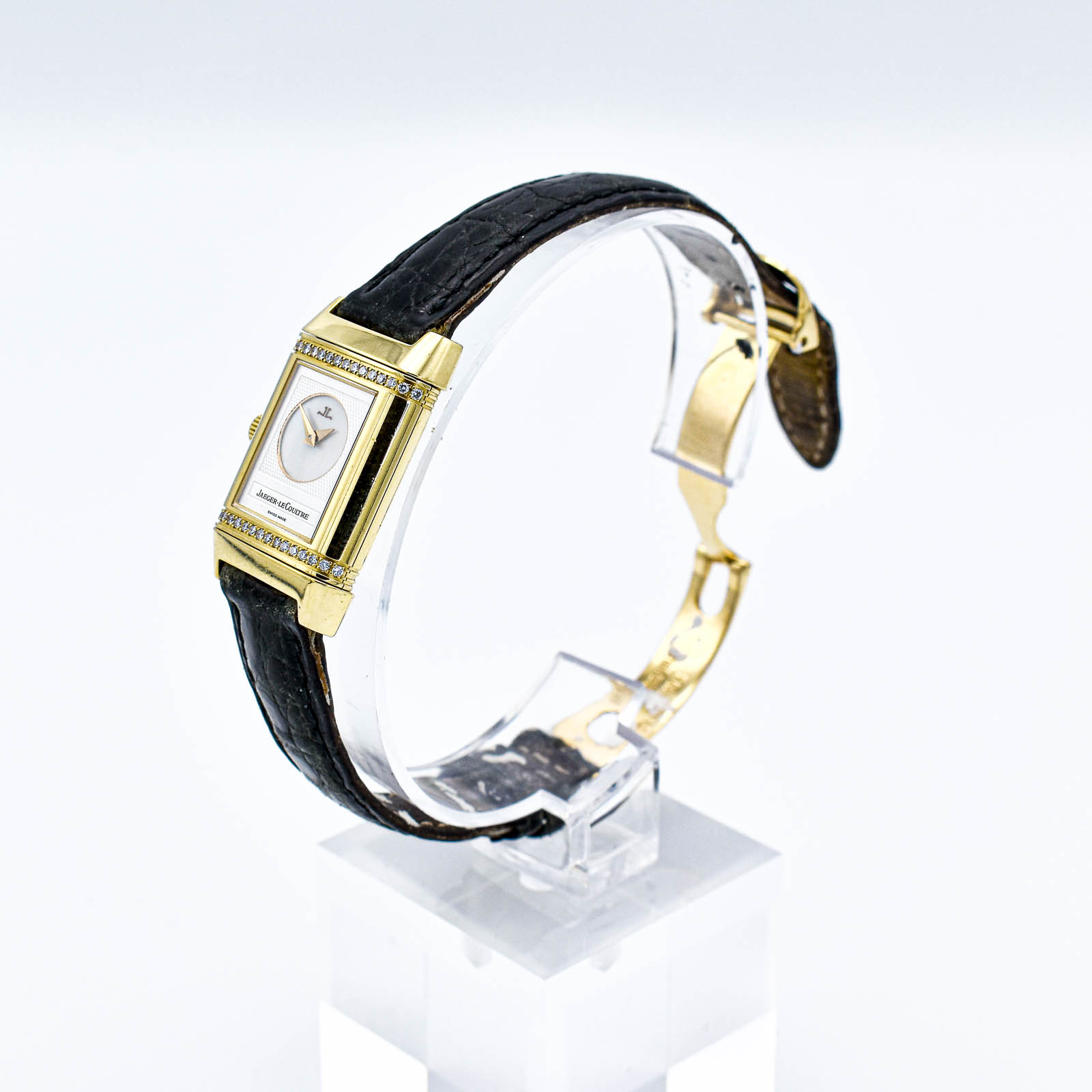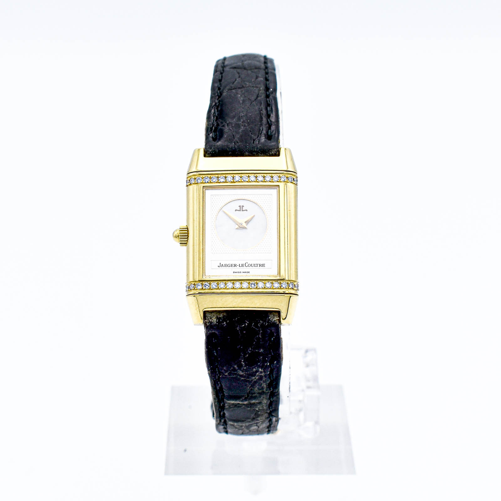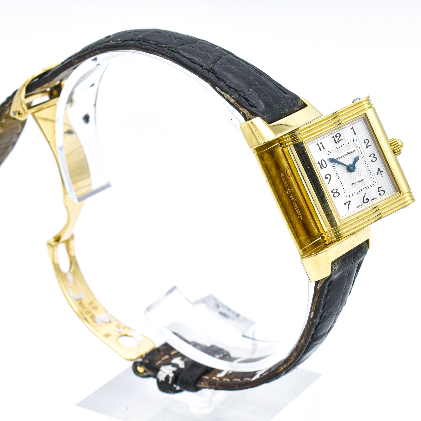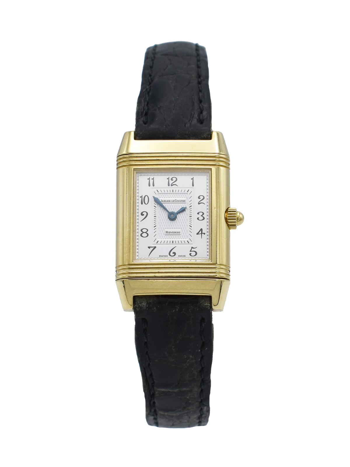 Ref 266.1.44A ladies 9ct gold Jaeger Le Coultre Reverso – Duetto on a crocodile strap with gold deployment clasp. Both dials are silvered with one showing fine ‘engine turning’ to the centre and the ‘night’ dial showing a disc of mother of pearl. The Sapphire glasses are perfect. The watch comes with all the boxes and papers. A very attractive watch the perfect present!
