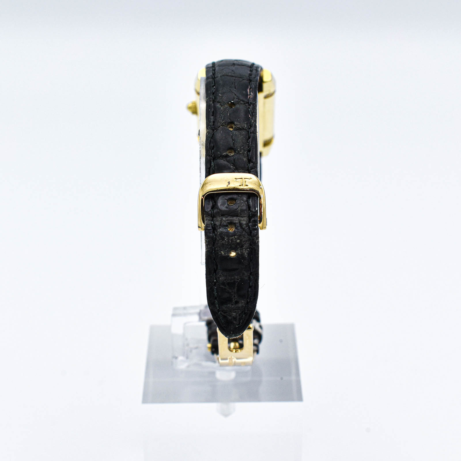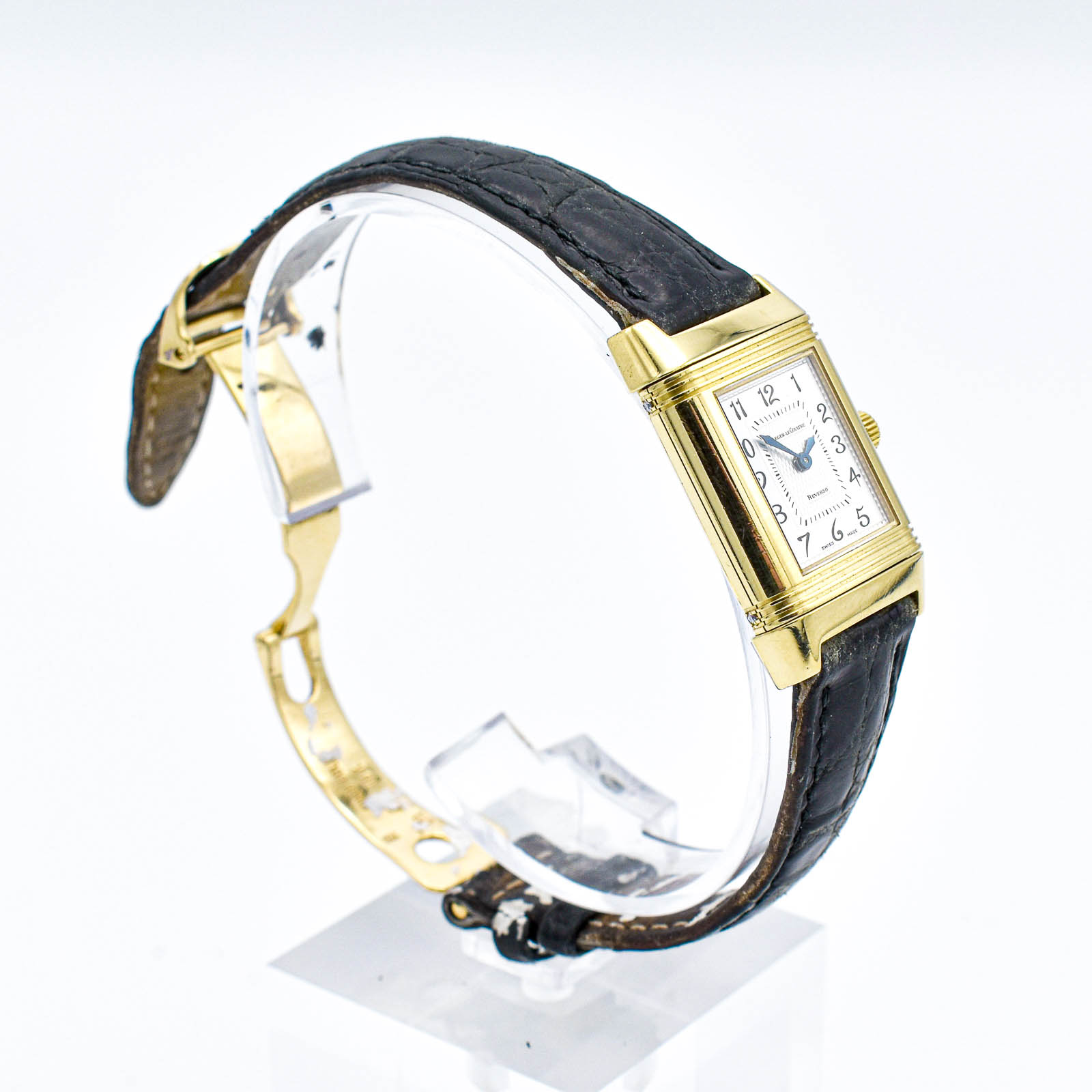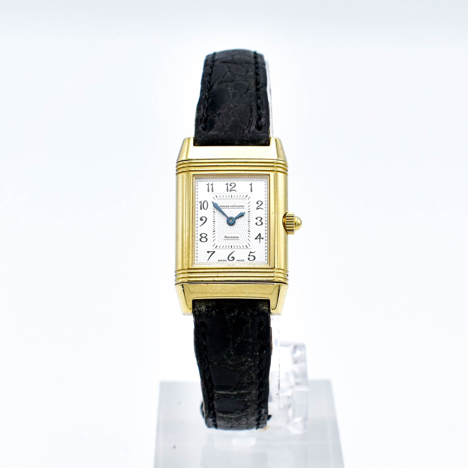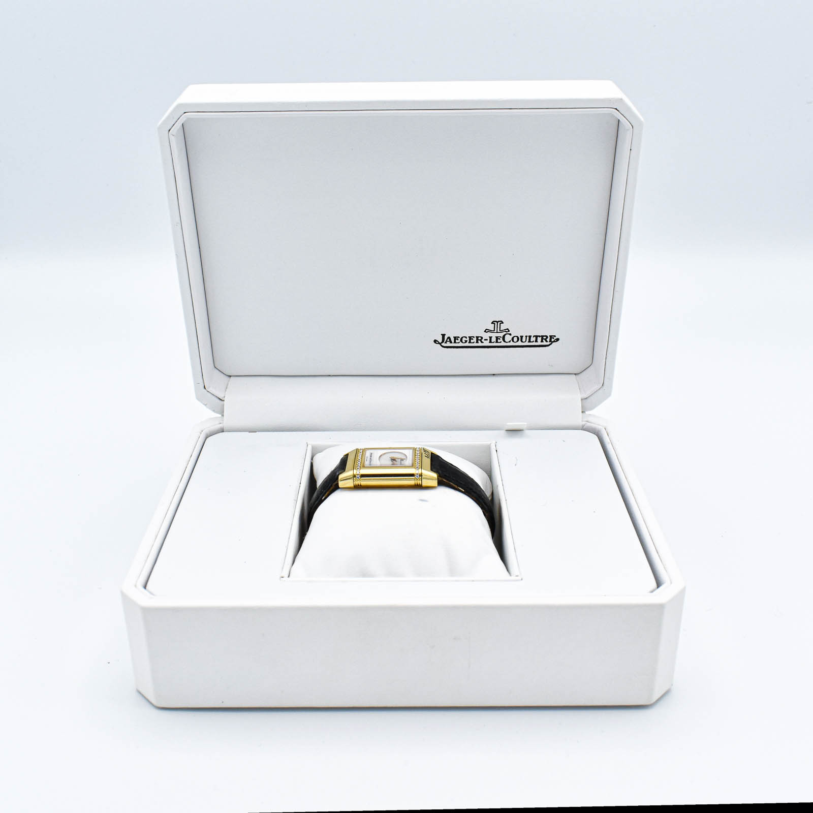 Ref 266.1.44A ladies 9ct gold Jaeger Le Coultre Reverso – Duetto on a crocodile strap with gold deployment clasp. Both dials are silvered with one showing fine ‘engine turning’ to the centre and the ‘night’ dial showing a disc of mother of pearl. The Sapphire glasses are perfect. The watch comes with all the boxes and papers. A very attractive watch the perfect present!