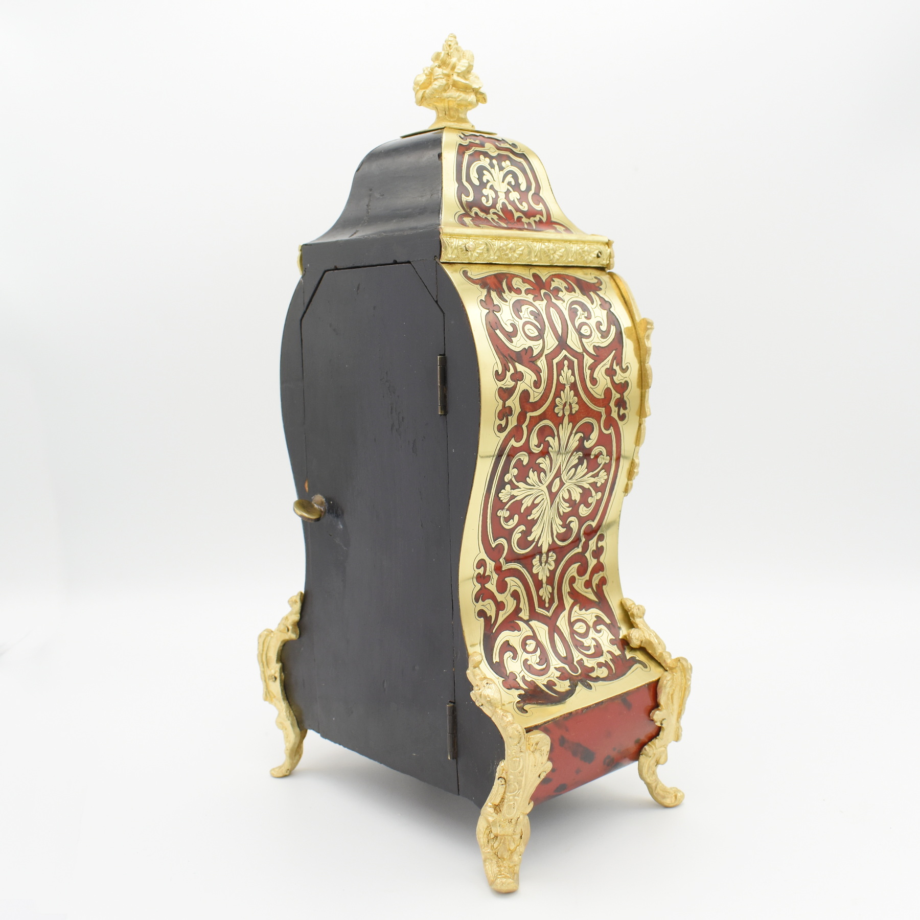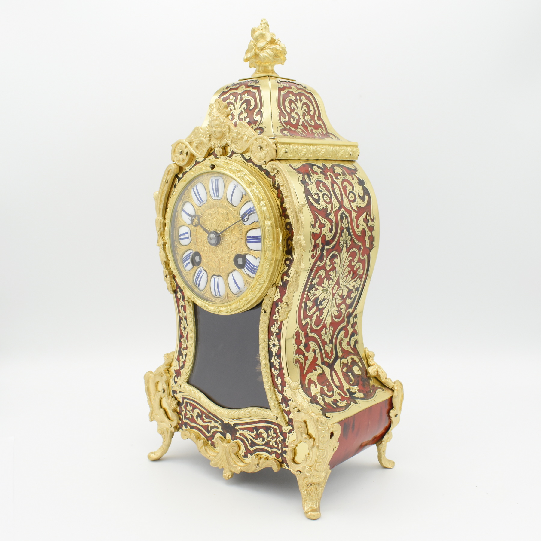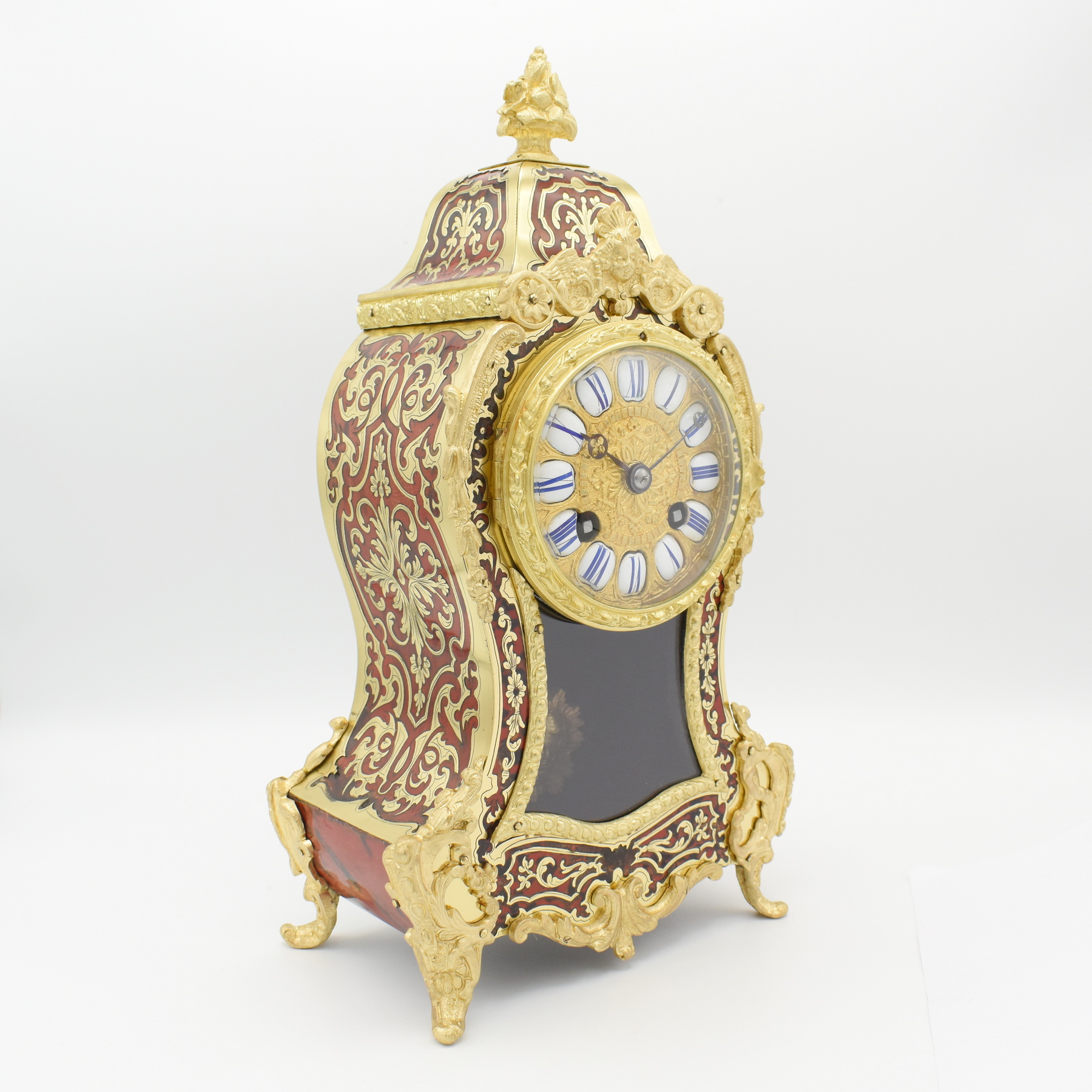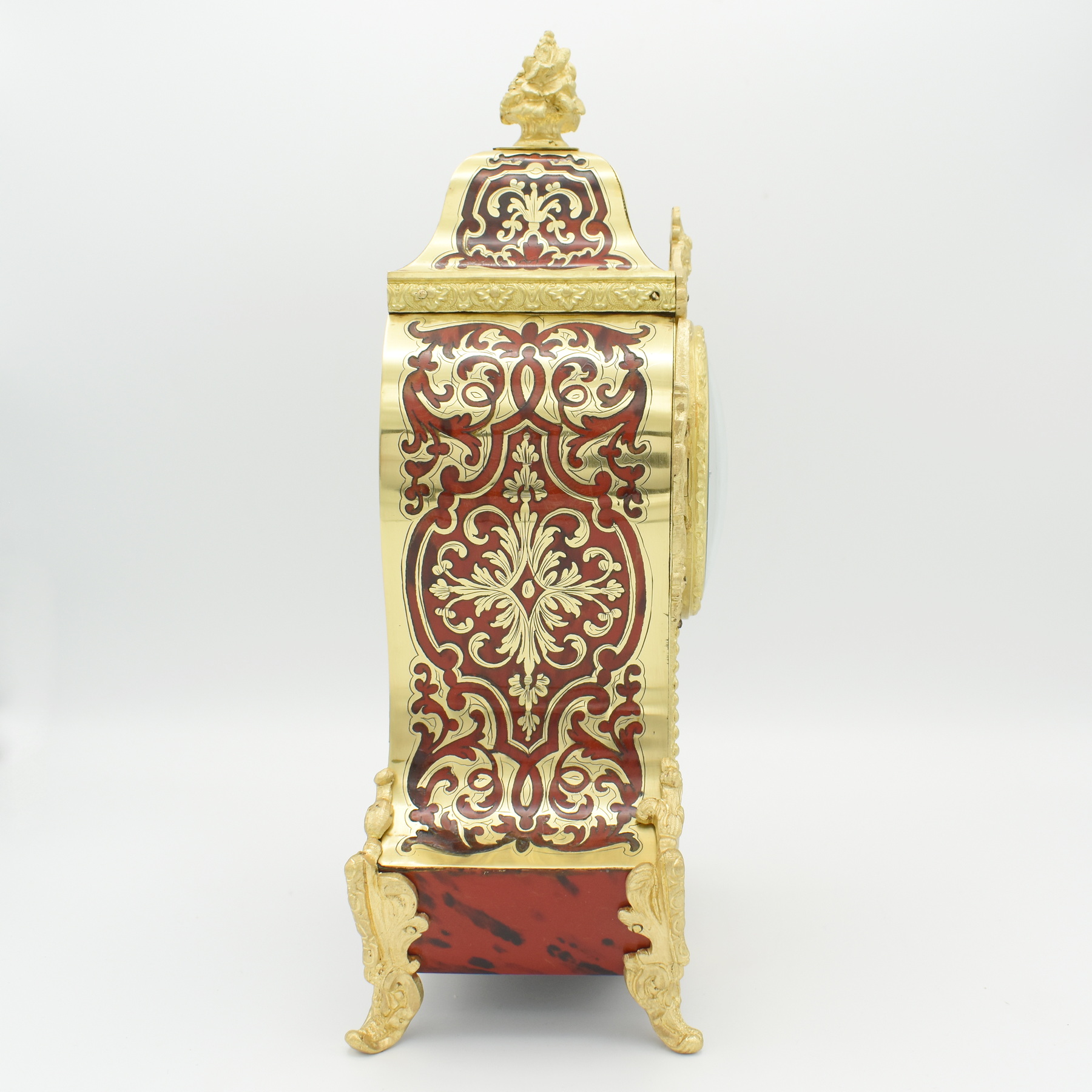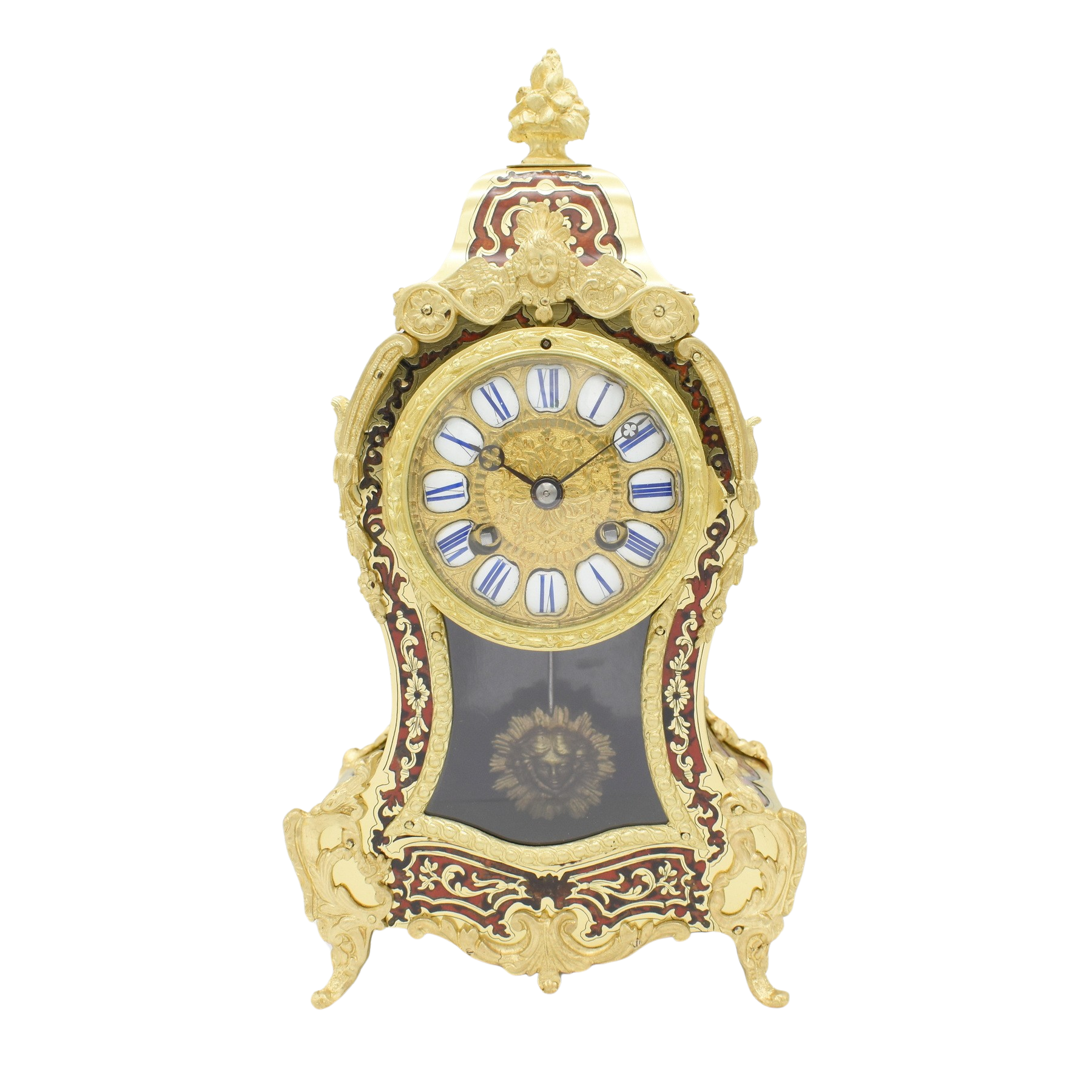 A very elegant French mantel clock in the classic Boulle style. The red tortoiseshell case is inlaid with fine Boulle work in great condition, with beautifully detailed cast brass foliage mounts to the edges of the case as well as decorative splayed feet, topped by an attractive floral cast brass finial. The typical sunburst pendulum is visible through the glass aperature to the front face, below an ornate gilt brass dial with enamelled number cartouches, showing blue Roman numerals, and a delicate pair of hands. Inside, the 8 day movement striking the hour and half hour on a bell, wound from the front. Overall a very attractive clock. Made circa 1890 by Japy Frères of Besancon, France.