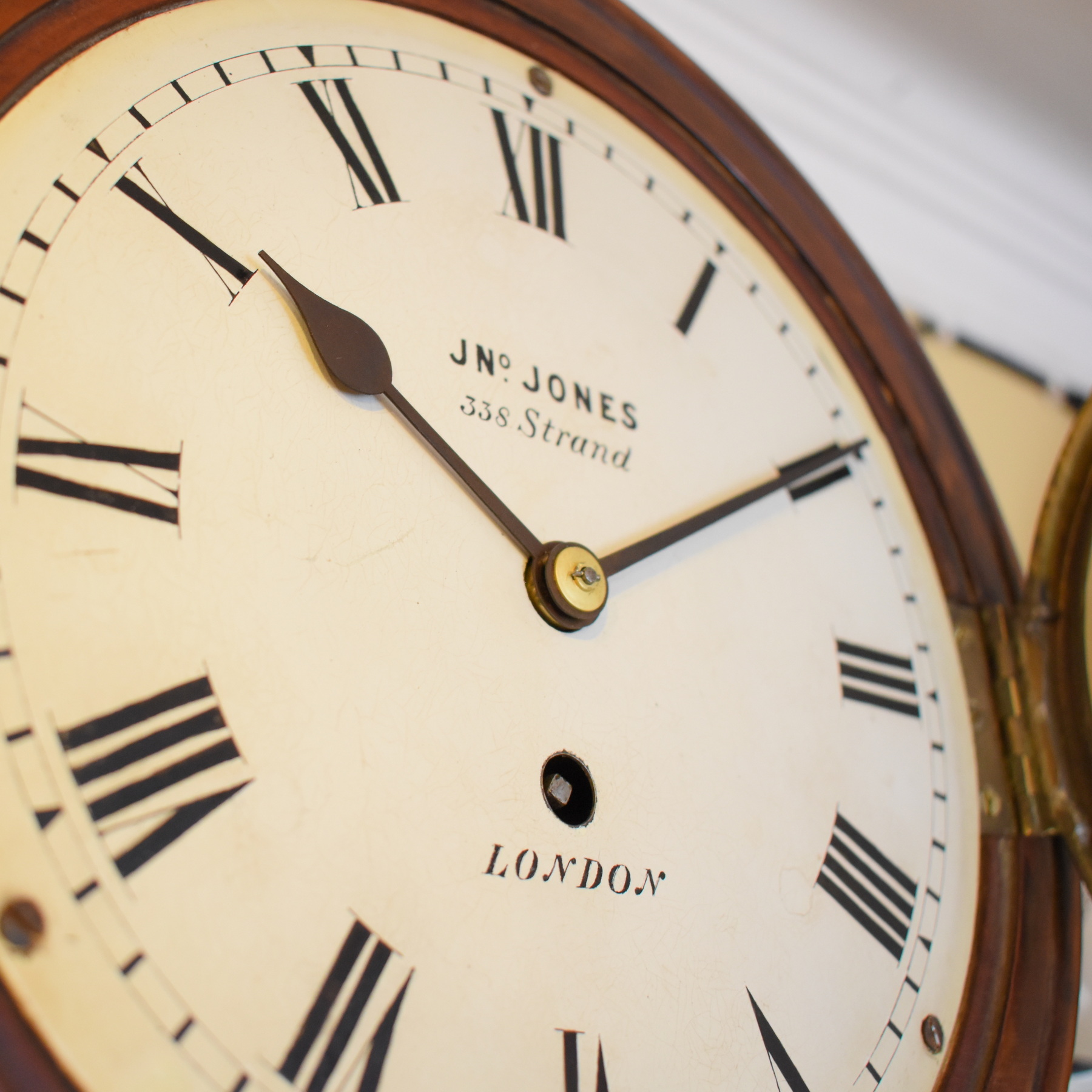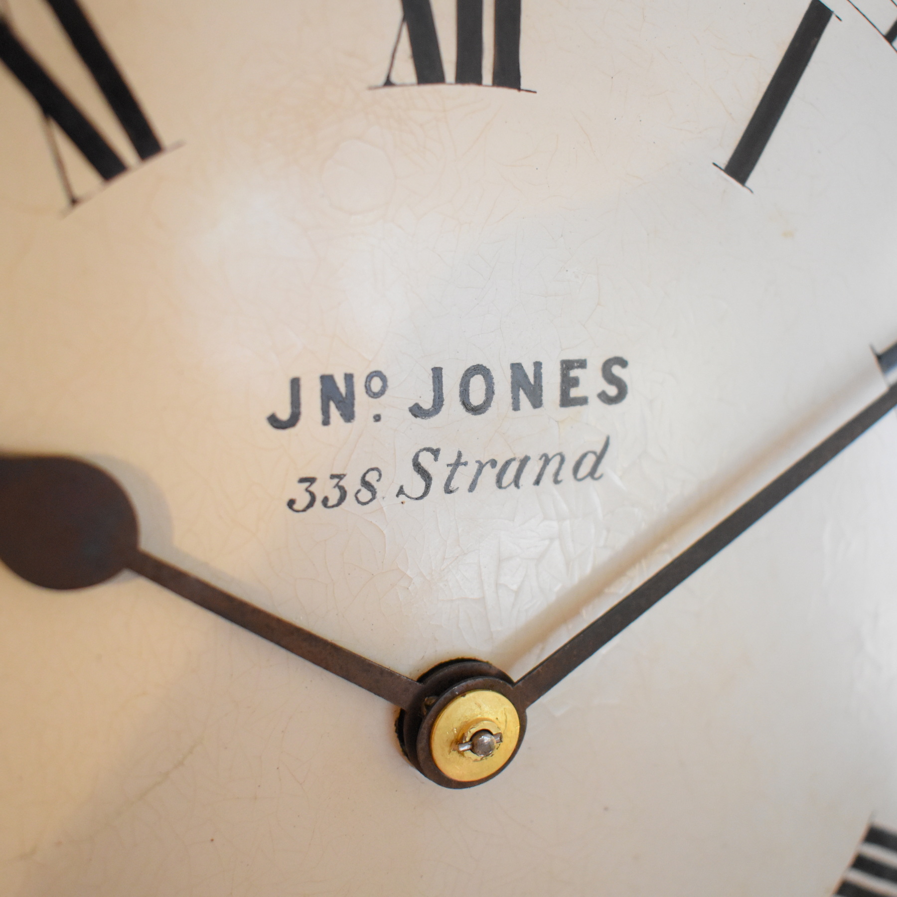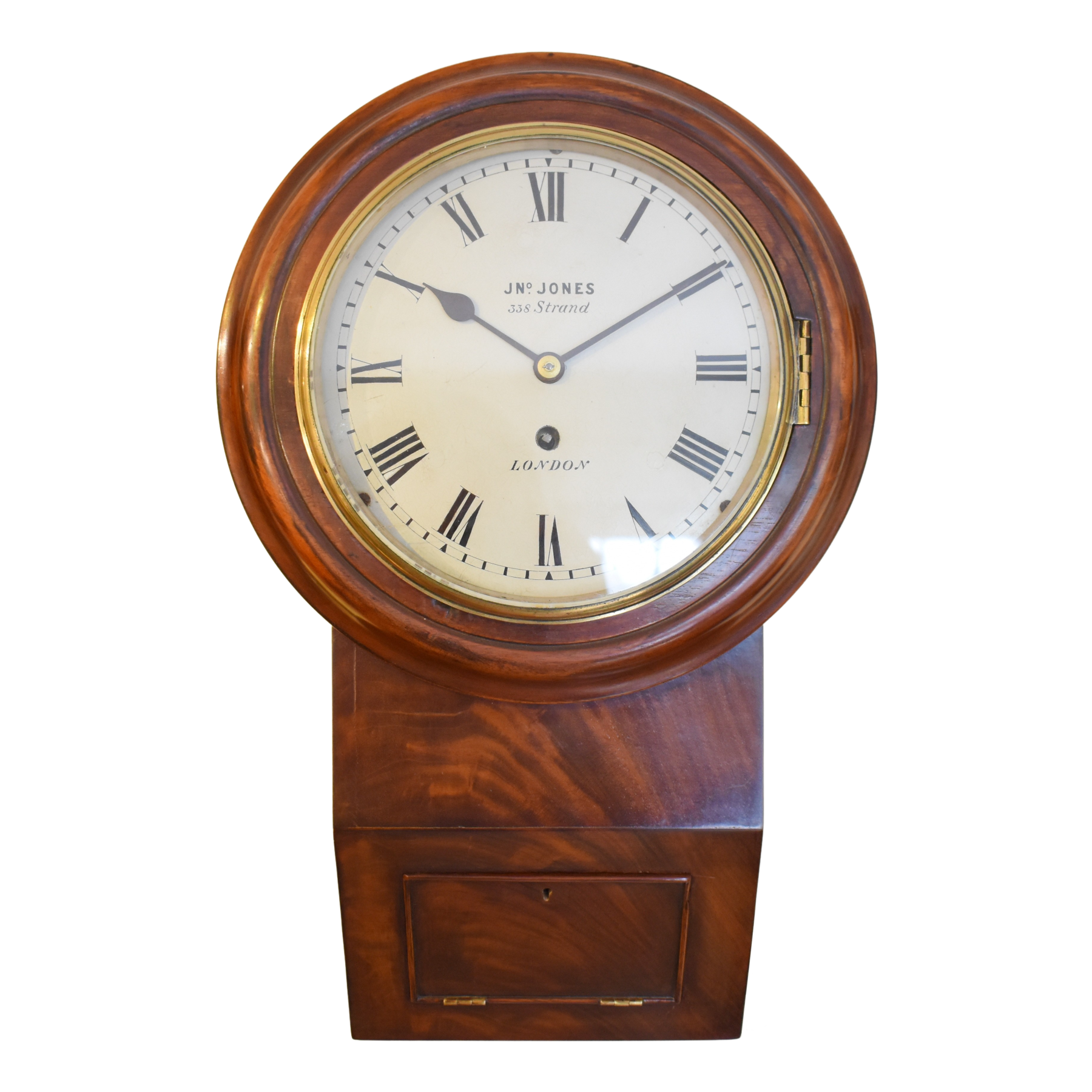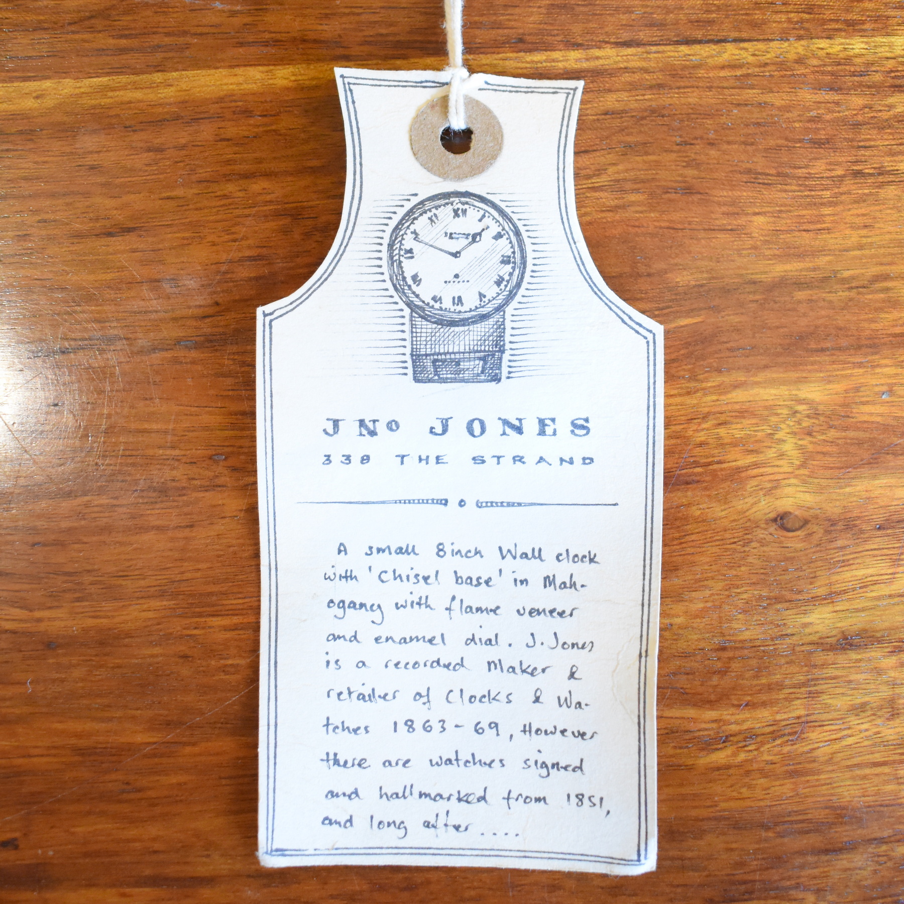 A particularly attractive 8 inch wall clock with ‘chisel base’ in mahogany, with a nicely coloured flame veneer and good quality enamel dial, signed JN Jones, 338 Strand. JN Jones is recorded as maker and retailer of clocks and watches from 1863-1869, however there are watches signed and hallmarked from 1851 and long after. This good and quite rare wall timepiece was likely made circa 1880. With original single fusee movement fully cleaned and restored, and case in such excellent condition, this is an investment quality clock.