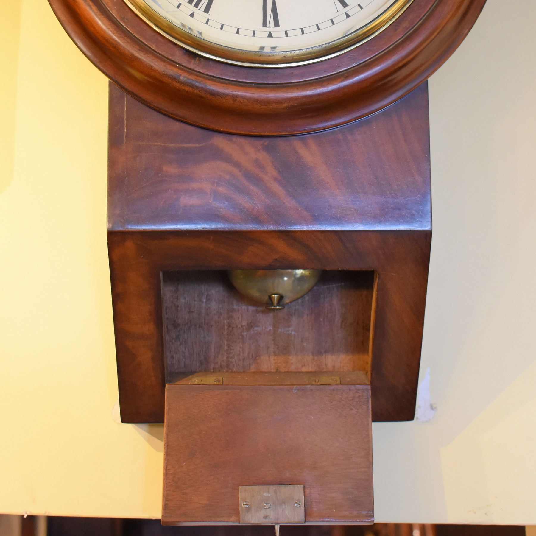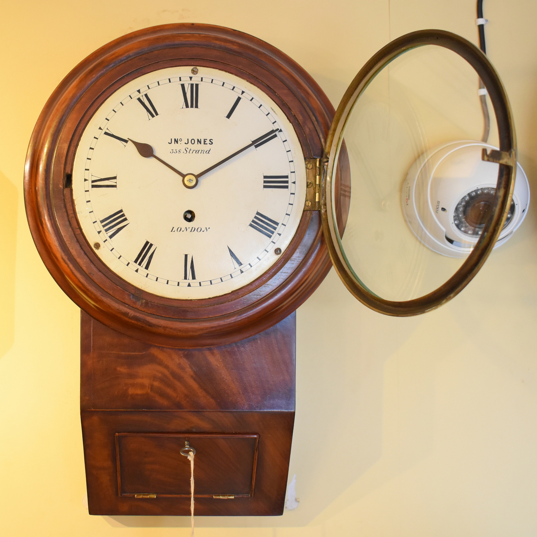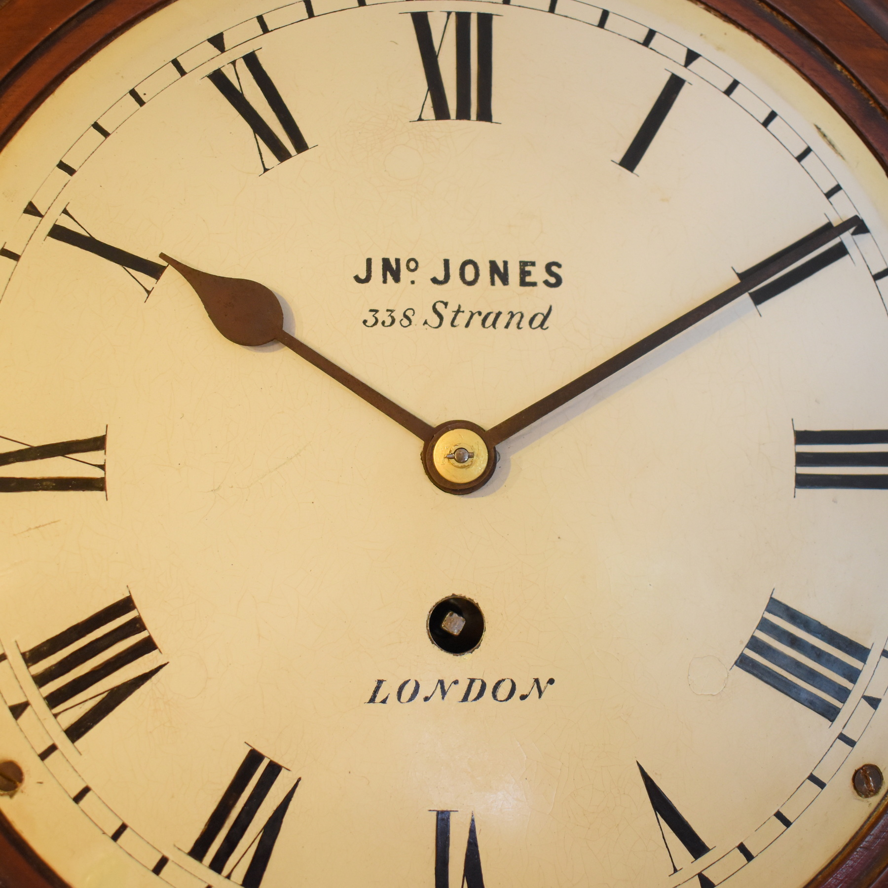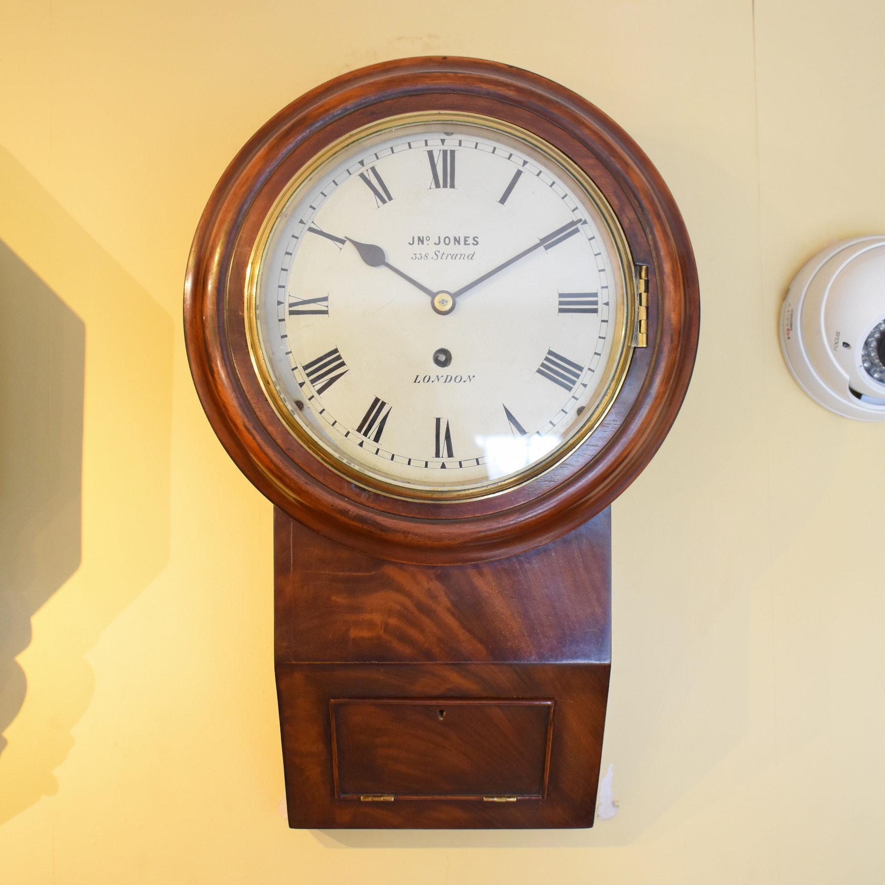 A particularly attractive 8 inch wall clock with ‘chisel base’ in mahogany, with a nicely coloured flame veneer and good quality enamel dial, signed JN Jones, 338 Strand. JN Jones is recorded as maker and retailer of clocks and watches from 1863-1869, however there are watches signed and hallmarked from 1851 and long after. This good and quite rare wall timepiece was likely made circa 1880. With original single fusee movement fully cleaned and restored, and case in such excellent condition, this is an investment quality clock.