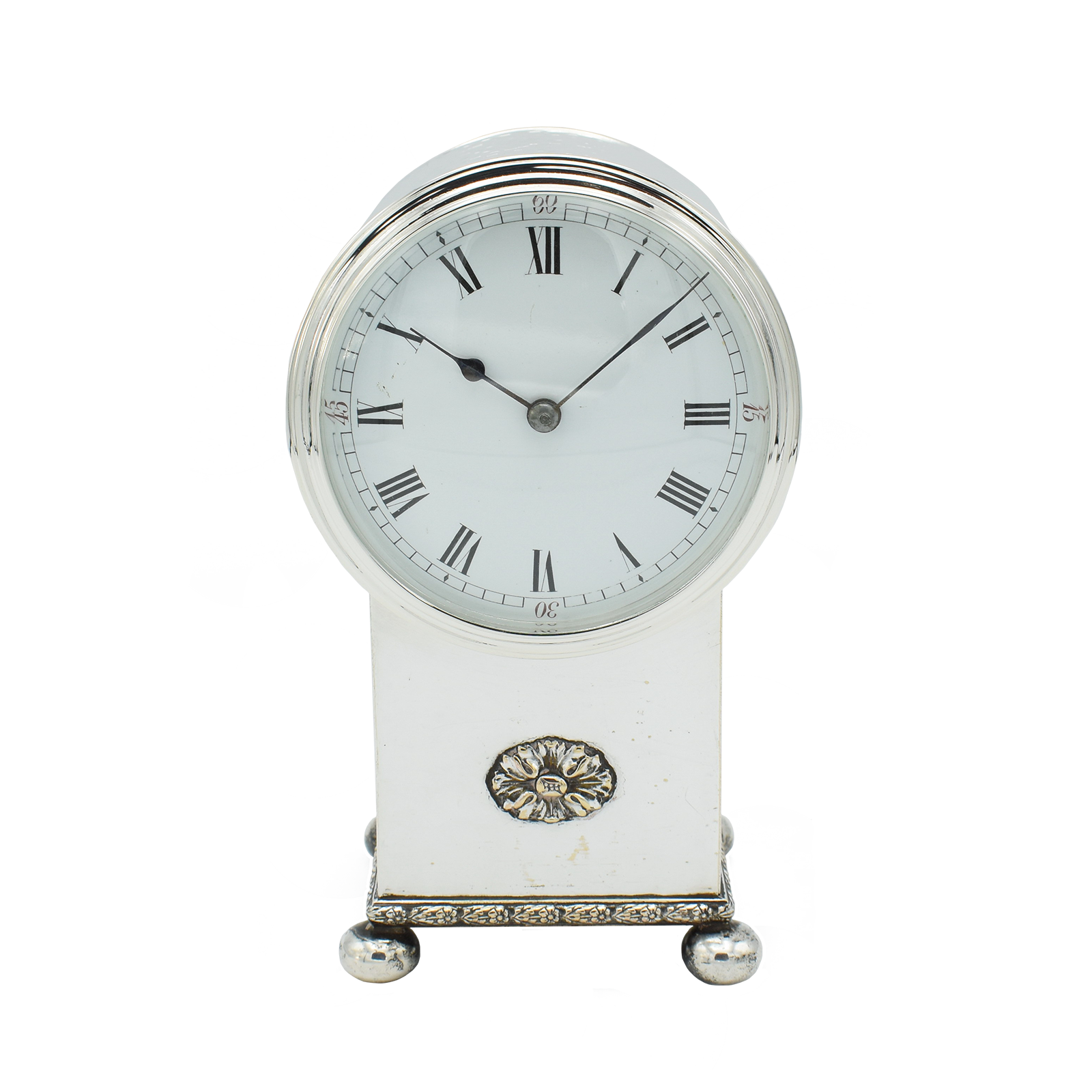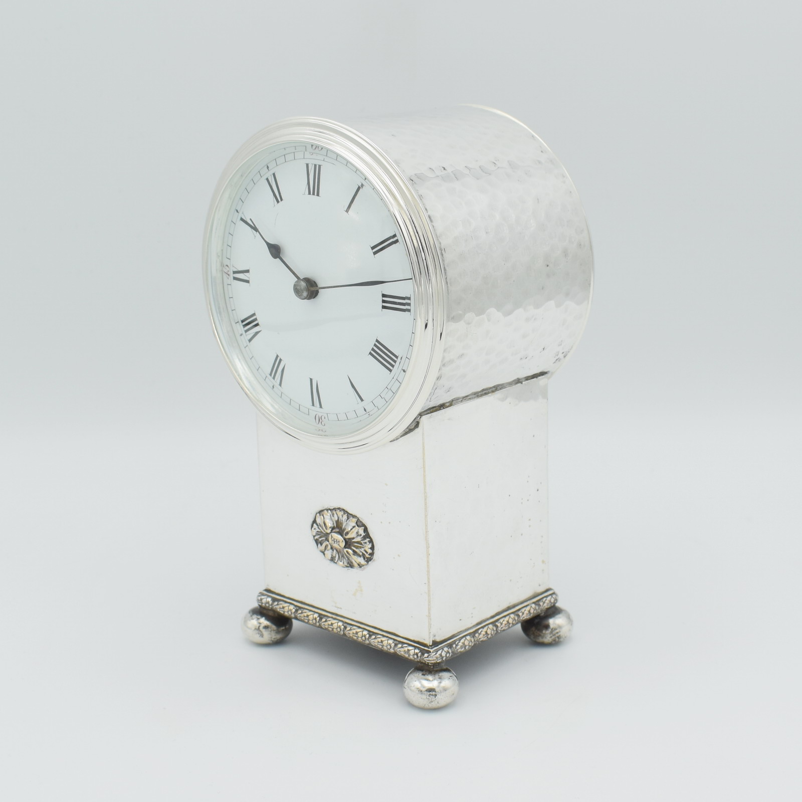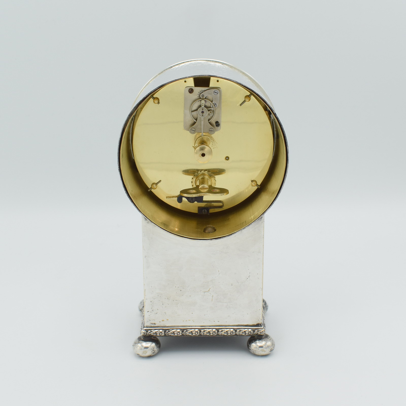 This is such and attractive little clock. The dial is white with Roman Numberals, the outer edge of the dial has deep red Arabic minutes at the quarters. The slender hands are blued steel. The case is made from hammered copper which has then been silver plated. It stands on splendid ‘Bun’ feet with a little decoration above and then a small oval motif on the center line of the base. It really does need to be seen in ‘real life’ to fully appreciate. There are a couple of tiny marks on the glass but you have to be very close to see them.