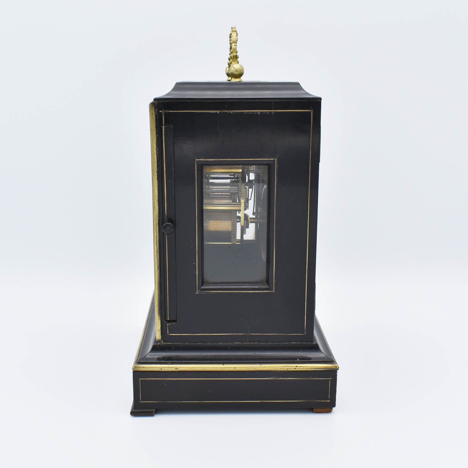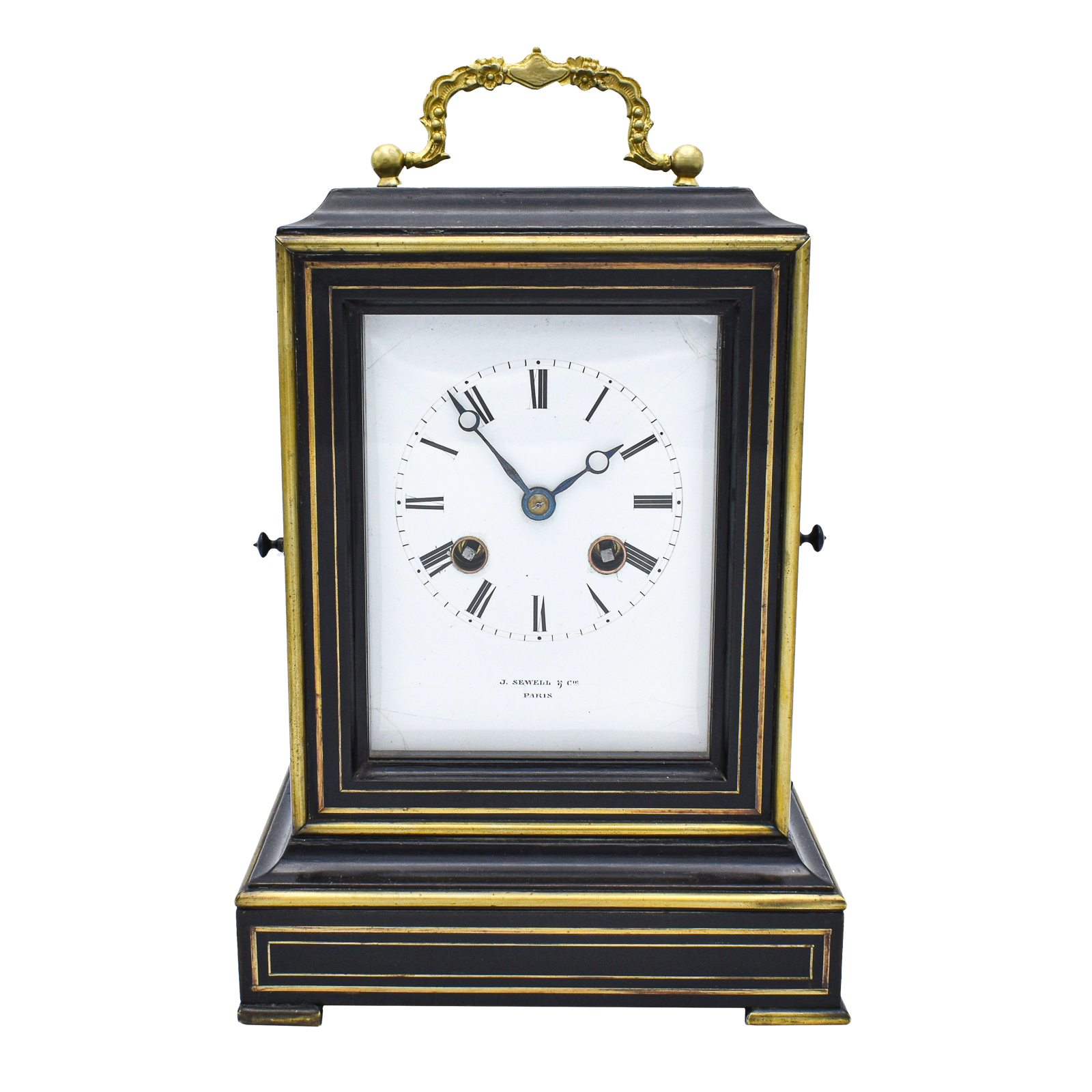 An attractive French mantel clock with a silk suspension in the ‘Pendule portative’ style with a decorative carrying handle. The glass is removed to wind the clock and unusually it is removed from the right hand side. The dial is vitreous enamel showing the makers name and Roman numerals, it does have slight hairlines to the corners as can be seen in the pictures but you have to be very close to see them. If the new owner would like these permanently removed, it can be arranged for an extra cost. Personally I would leave them as they are really are faint. The clock is of 7 day duration and has a bell strike for the hour and the half hour. The case is ebonised with brass inlays of geometric style. A glass aperture to the top and one to each side. The rear door opens to reveal a fully overhauled mechanism. The clock was made and retailed by J.Sewell and Co of Paris who produced superb clocks throughout the mid 19th Century.