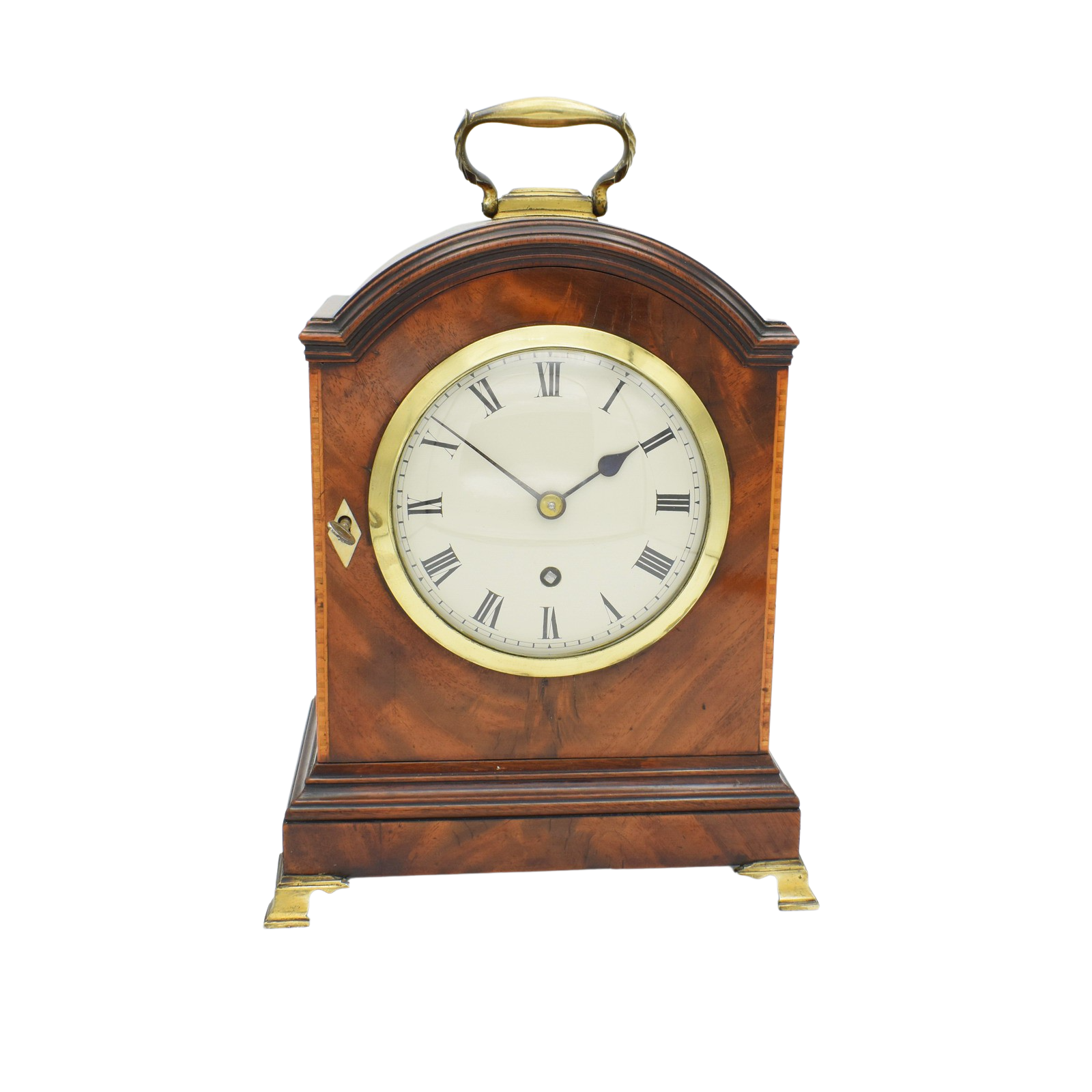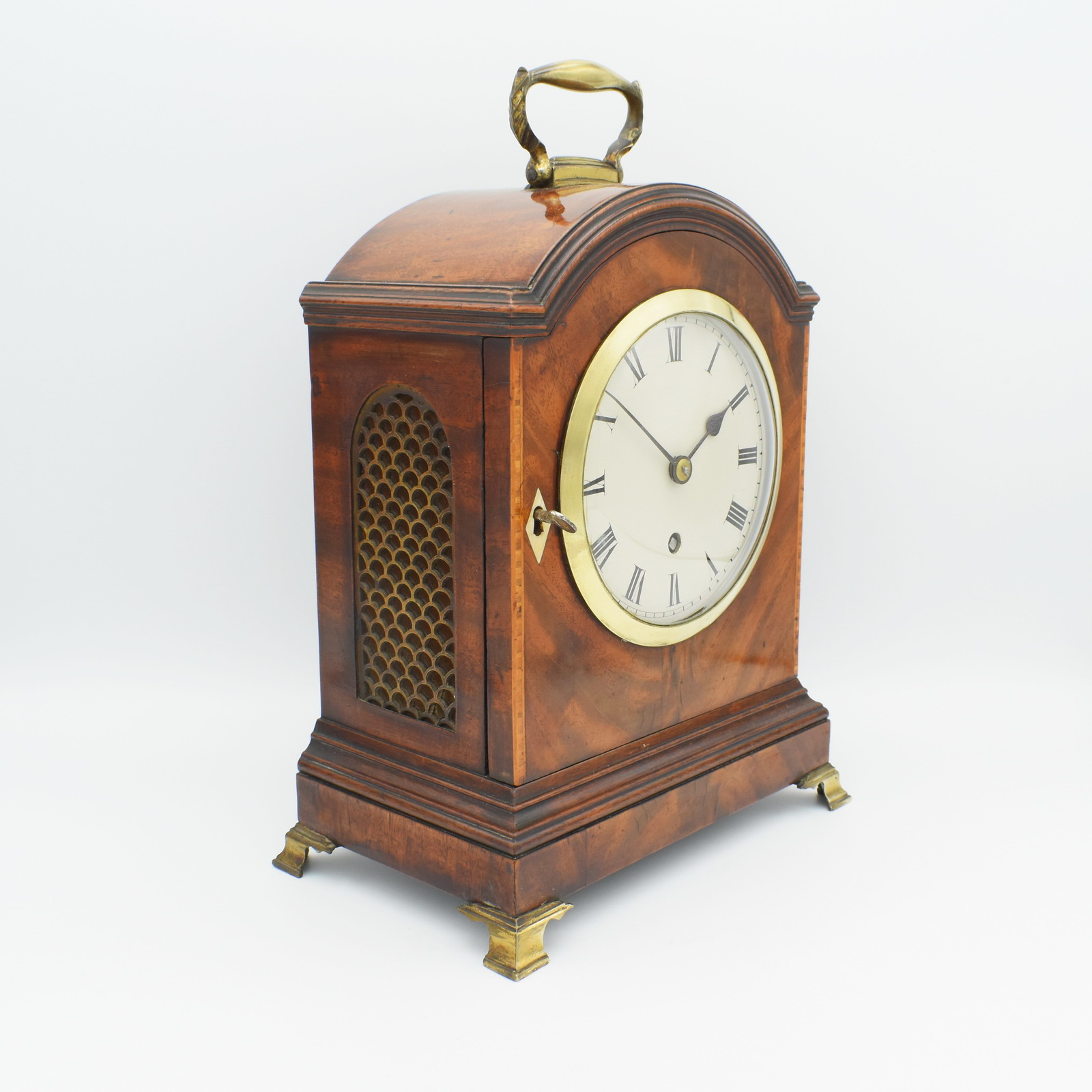 This is a very small and attractive timepiece of extremely high quality. The case is constructed in the traditional Georgian style being of Oak with a thick Mahagany ‘flame’ veneer, the colour and patina are perfect, chestnut and toffee! The dial has been signed to the rear Frodsham and C then Sec’? The high quality movement has been fully overhauled (and does not have a pendulum you have to worry about fitting). The case features ‘fish scale’ frets to both sides, a fret work rear door and a full opening front. The dial is ‘off white’ showing Roman numerals and blued steel hands. The clock stands on 4 bracket feet and has a solid cast brass carry handle. Quite an usual clock and very small in comparison to other Bracket clocks. There are of course many Frodshams listed in the clockmakers volumes. The quality of this fine clock does suggest London cabinet making and clockmaking.
