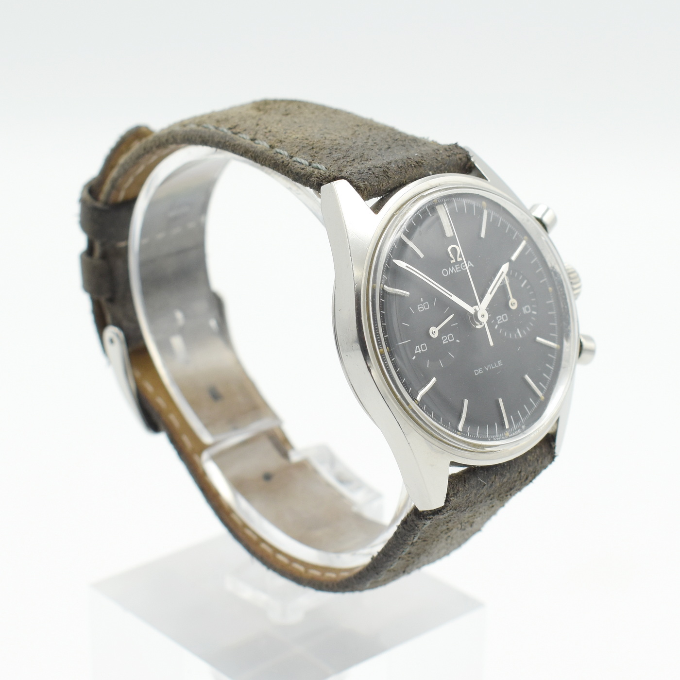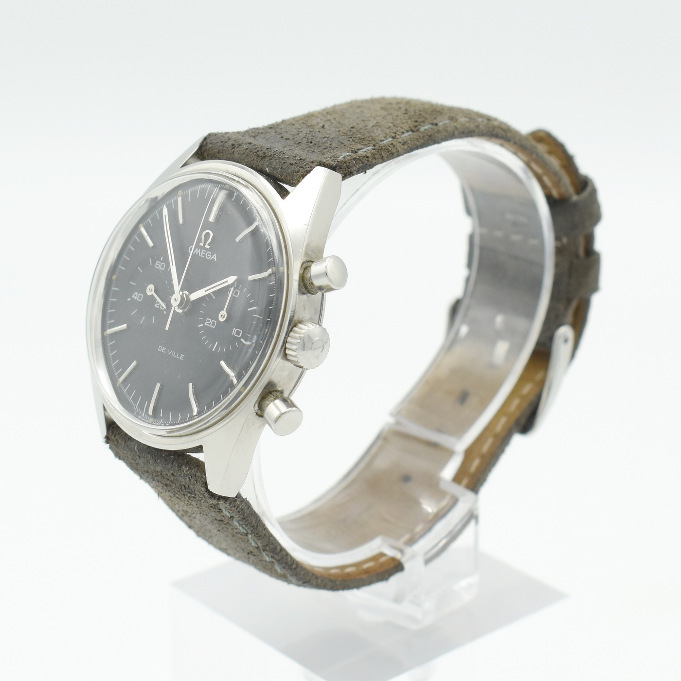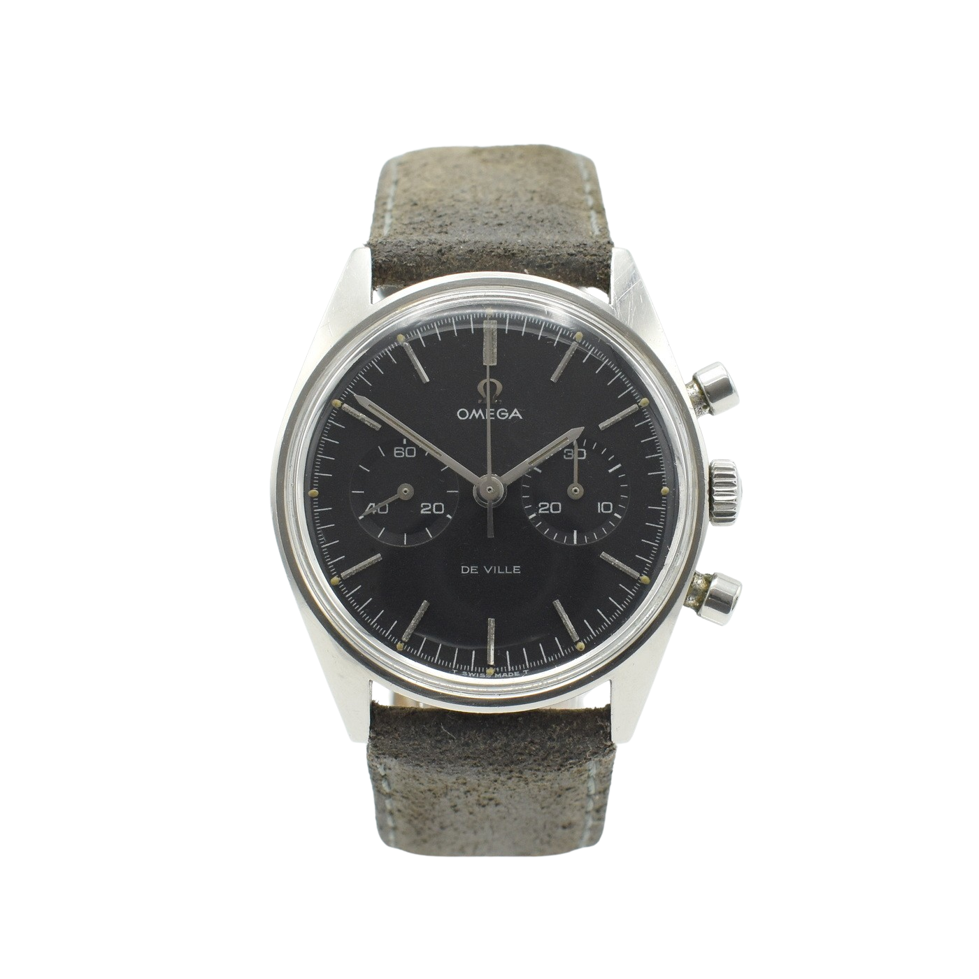 An extremely rare De Ville Chronograph by Omega, a true classic with black/grey dial, all original hands, and case in great condition. Reference number 145.017, serial number 27742575, dating it to 1968. The dial is simple and elegant with a soft matte finish, bevelled, polished chrome hour batons, and at the 3 and 9 hour marks, two sunken subdials for the 30 minute register and the seconds hand respectively, which sit seamlessly in the dial, with the seconds hand through the centre being the stopwatch hand. The watch comes on a grey/brown leather strap with a distressed effect, which suits the case and dial well, especially with the nice patina on the hands and indices. The original, manually wound calibre 860 movement, which is the two subdial version of the 861, runs smoothly and keeps accurate time, with the chronograph functions resetting sharply, and can be both started and stopped by the upper pusher and reset via the lower pusher. It is currently receiving a full service and a clean and polish of the case, the pictures shown are pre-restoration, more pictures to follow! The case measures 40mm in length from the lugs, 35mm in diameter not including the crown or pushers (38mm including), 19mm between the lugs, and 12mm in depth.