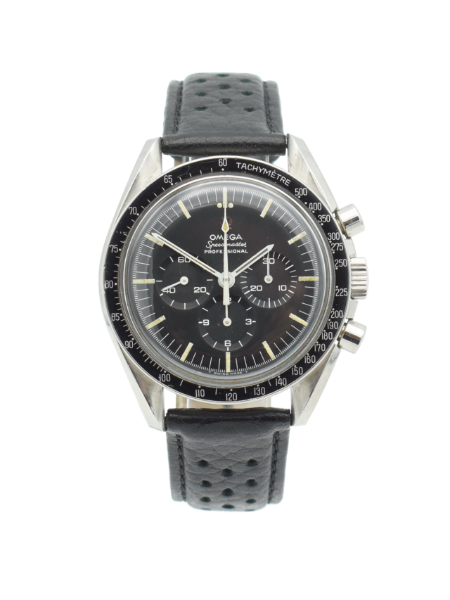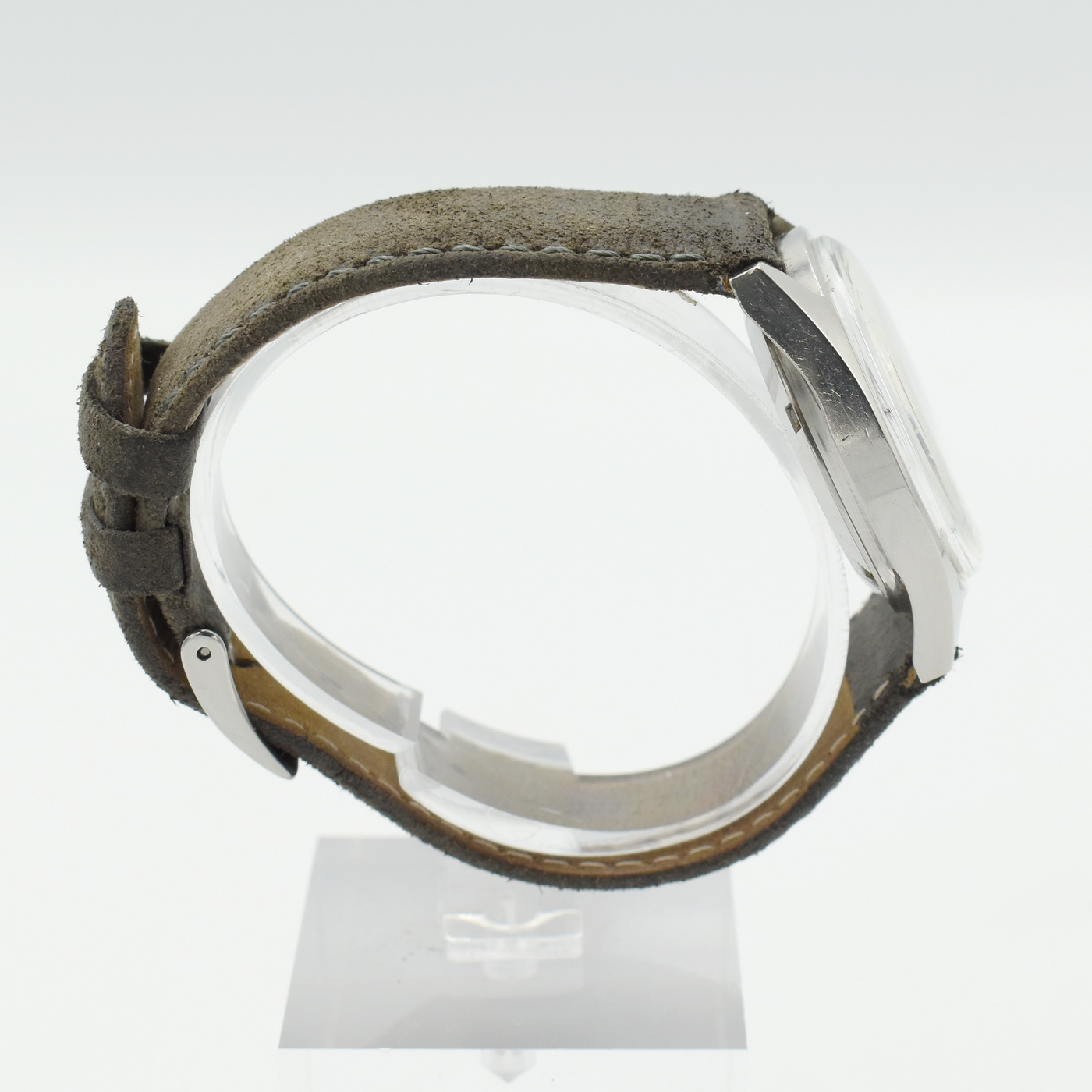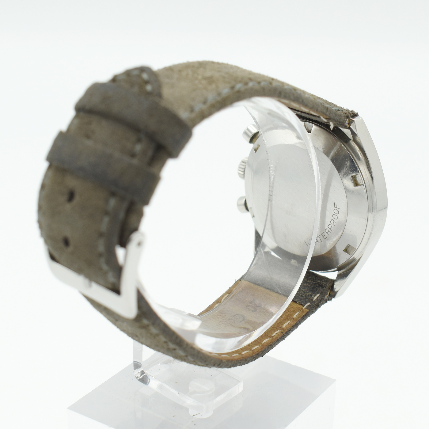 An extremely rare De Ville Chronograph by Omega, a true classic with black/grey dial, all original hands, and case in great condition. Reference number 145.017, serial number 27742575, dating it to 1968. The dial is simple and elegant with a soft matte finish, bevelled, polished chrome hour batons, and at the 3 and 9 hour marks, two sunken subdials for the 30 minute register and the seconds hand respectively, which sit seamlessly in the dial, with the seconds hand through the centre being the stopwatch hand. The watch comes on a grey/brown leather strap with a distressed effect, which suits the case and dial well, especially with the nice patina on the hands and indices. The original, manually wound calibre 860 movement, which is the two subdial version of the 861, runs smoothly and keeps accurate time, with the chronograph functions resetting sharply, and can be both started and stopped by the upper pusher and reset via the lower pusher. It is currently receiving a full service and a clean and polish of the case, the pictures shown are pre-restoration, more pictures to follow! The case measures 40mm in length from the lugs, 35mm in diameter not including the crown or pushers (38mm including), 19mm between the lugs, and 12mm in depth.