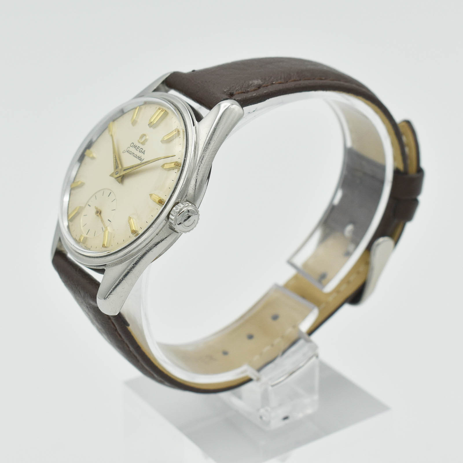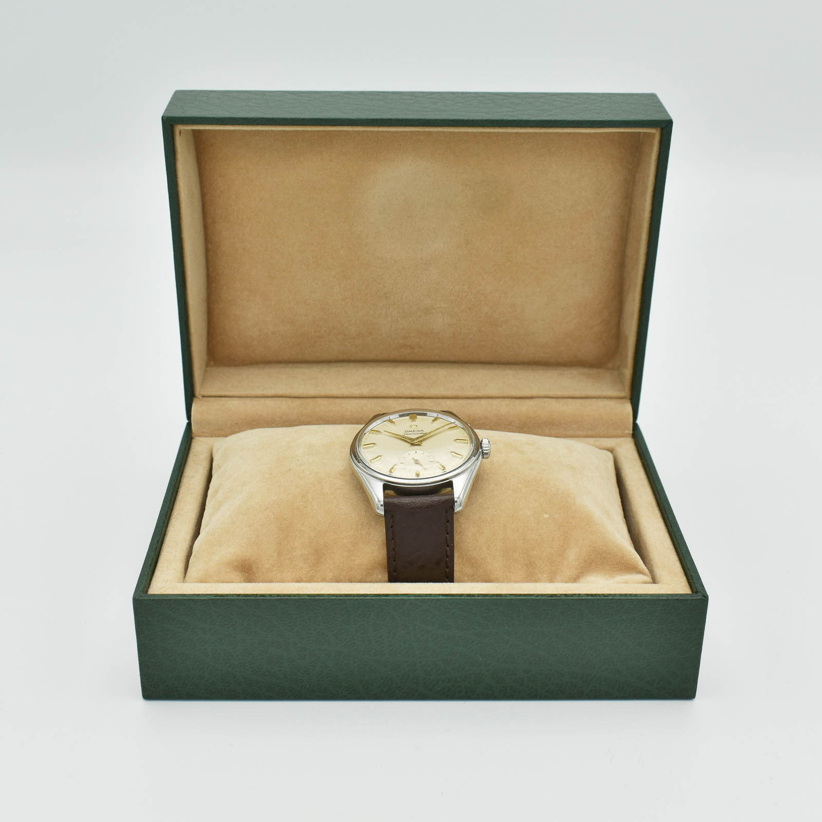 A very good Omega 2990-1 measuring 36mm across without the winding crown. In a polished stainless steel ‘waterproof’ case with gold indices and gold delphine hands. The watch is in very good order throughout. The dial is untouched, bright silver and in very good vintage condition. The crown with logo is original and it’s manual wind Cal-267 with 17 jewels. An excellent vintage Omega with is sometimes referred to as the ‘Ranchero’ as it shared the same case and movement.