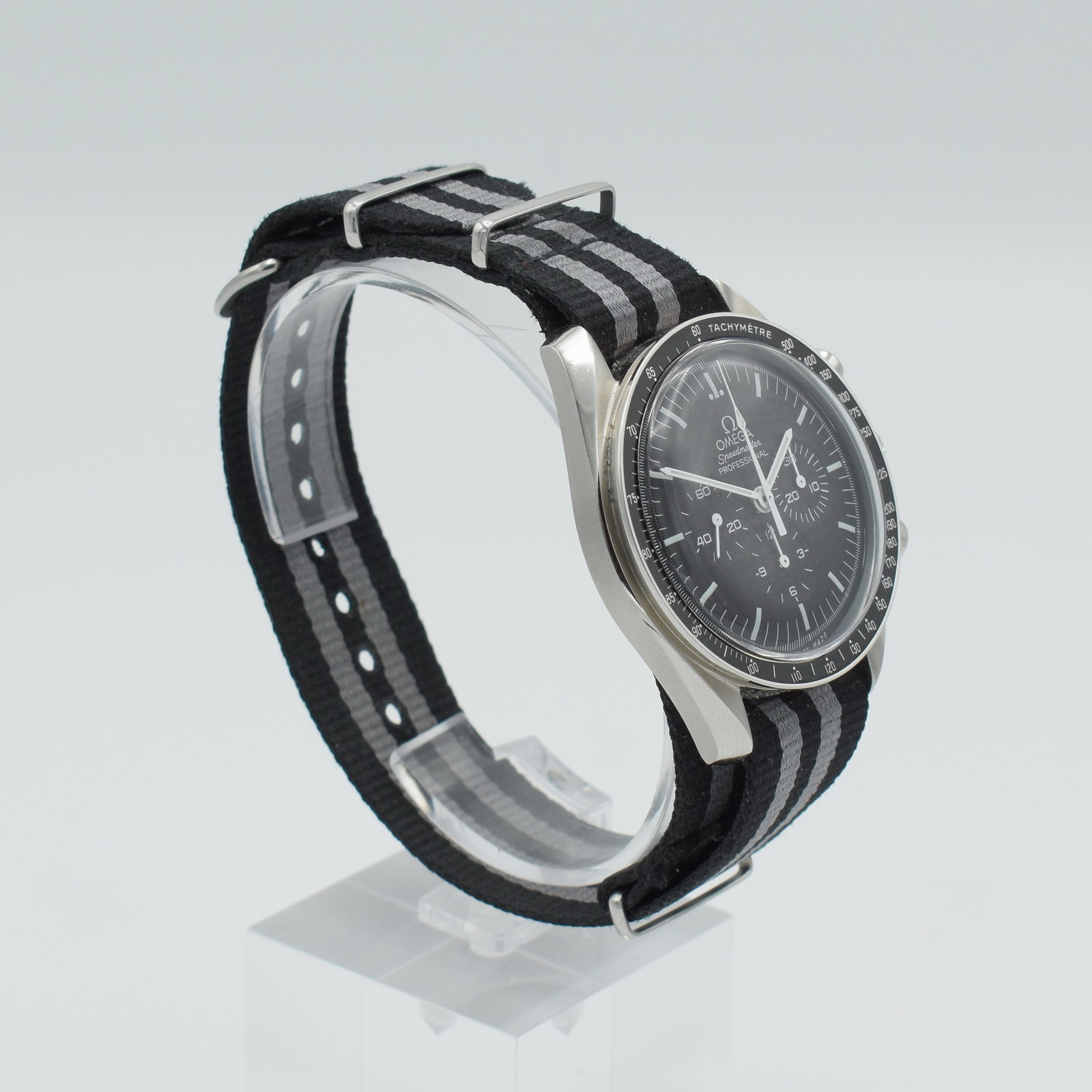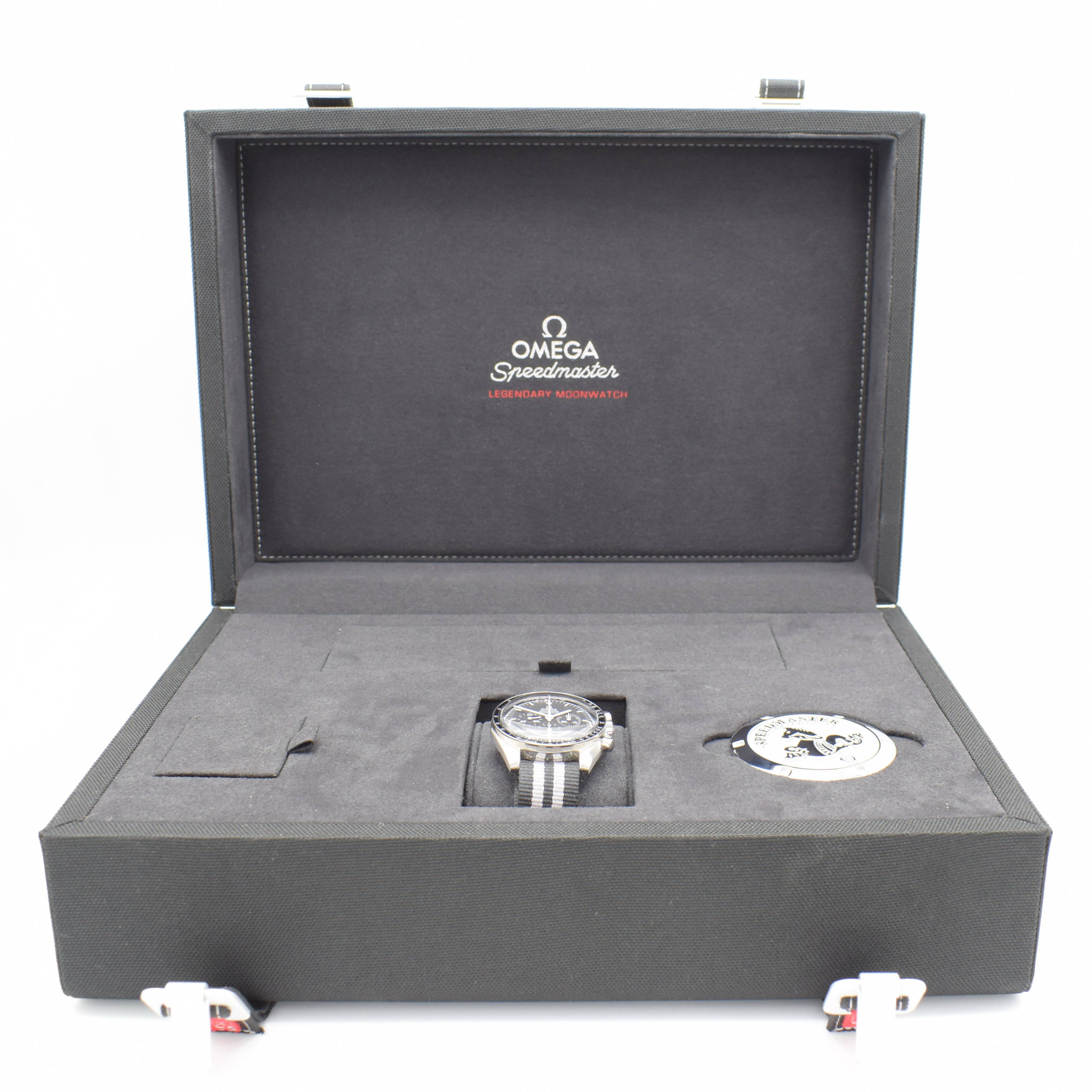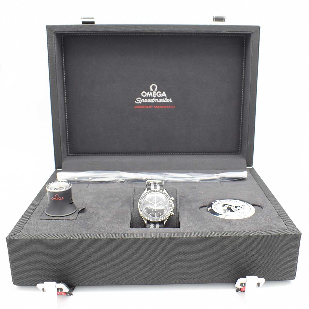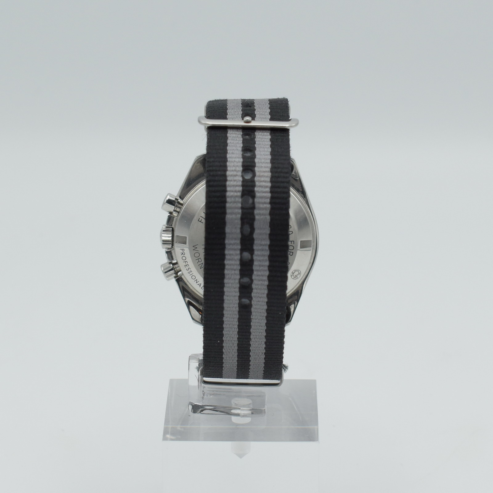 A nearly new Omega Speedmaster in exceptional condition with all boxes and paperwork. This watch even has the original outer cardboard box that Omega ship with it. The watch has unused Nasa double length strap, original Stainless Steel strap and we have supplied a stripped black/grey nato which also looks great on it. The watch carries the remaining 4 years of the Omega 5 year warranty. The strap tool and eye glass. A modern classic.
