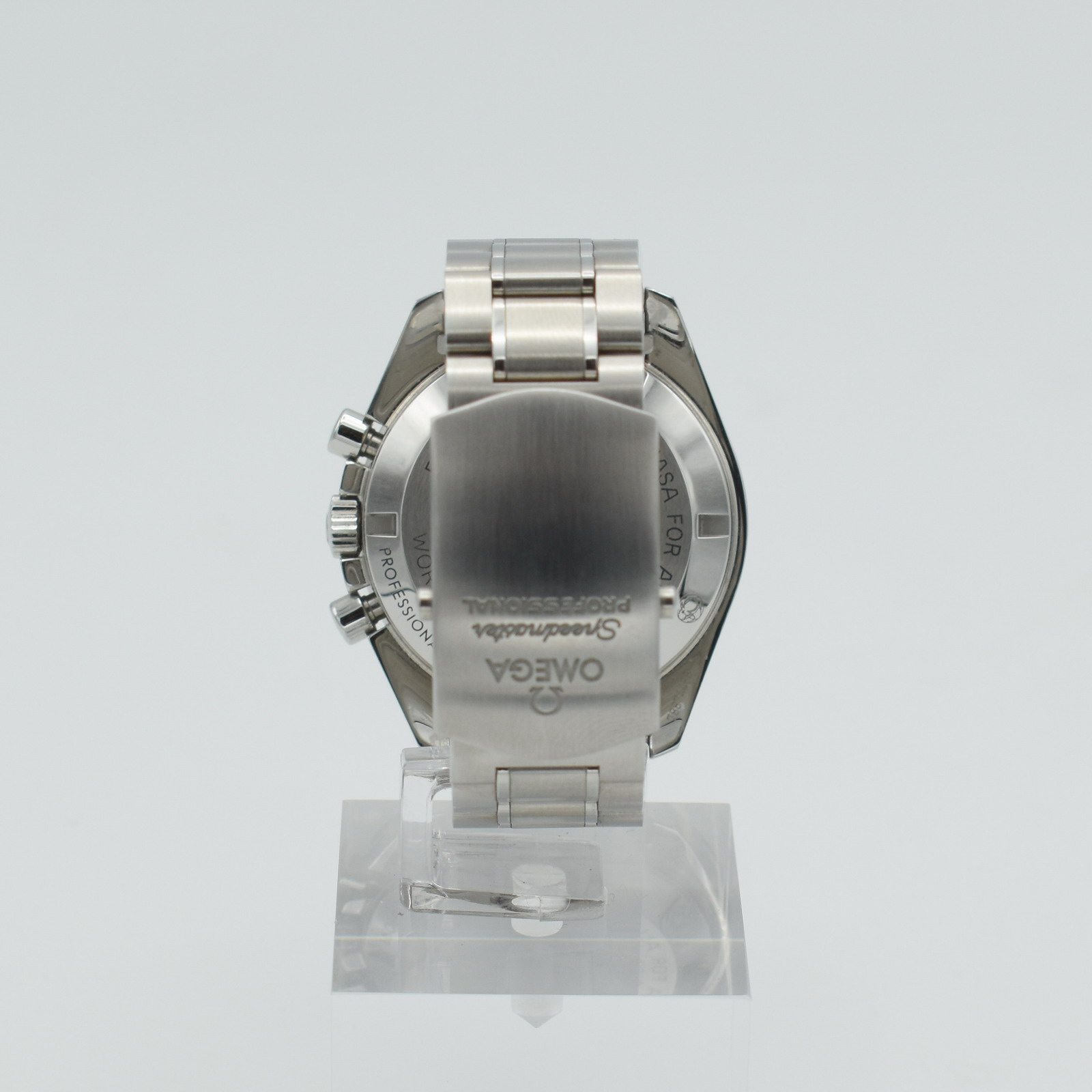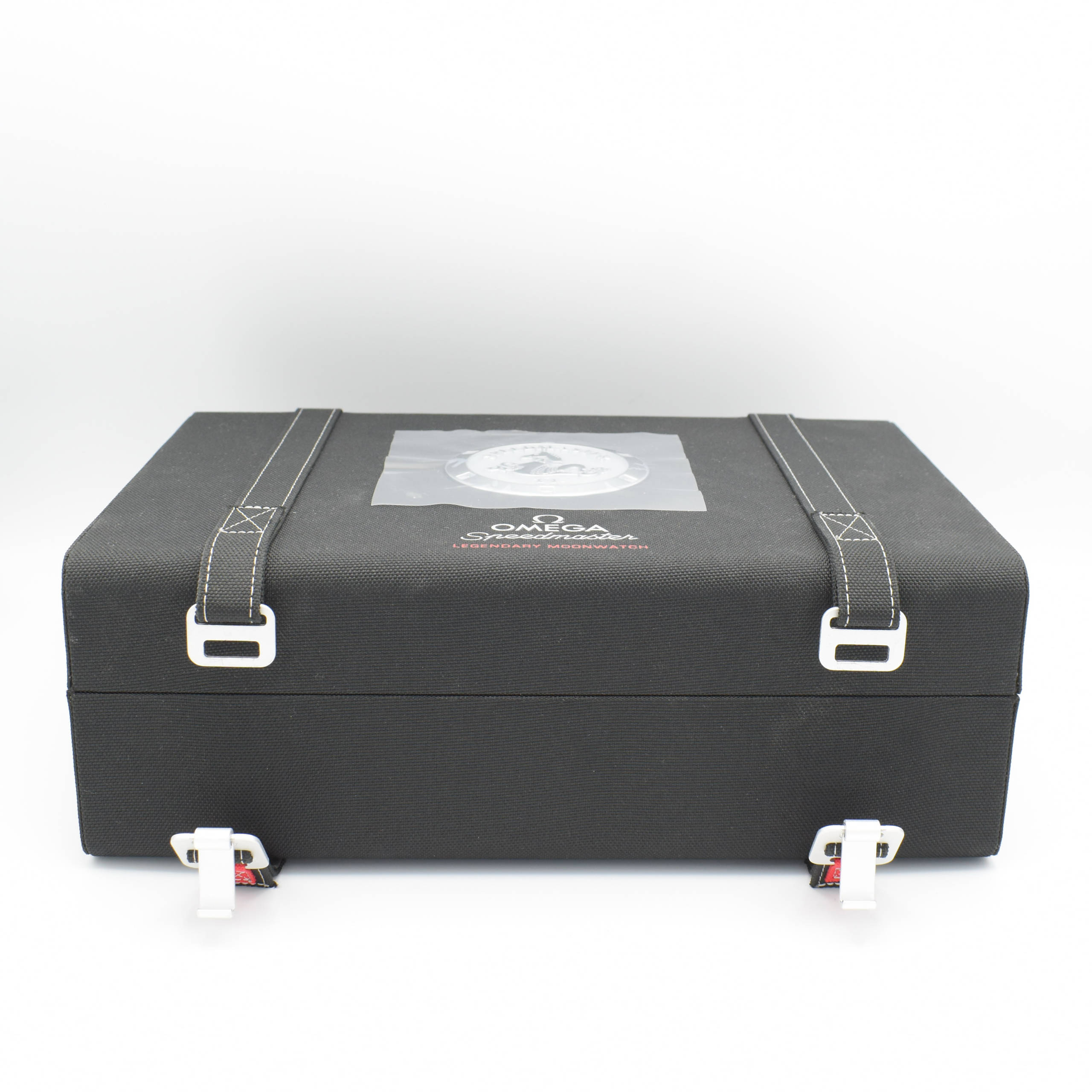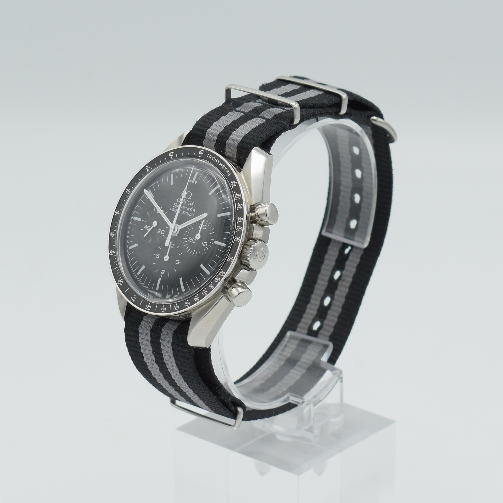 A nearly new Omega Speedmaster in exceptional condition with all boxes and paperwork. This watch even has the original outer cardboard box that Omega ship with it. The watch has unused Nasa double length strap, original Stainless Steel strap and we have supplied a stripped black/grey nato which also looks great on it. The watch carries the remaining 4 years of the Omega 5 year warranty. The strap tool and eye glass. A modern classic.