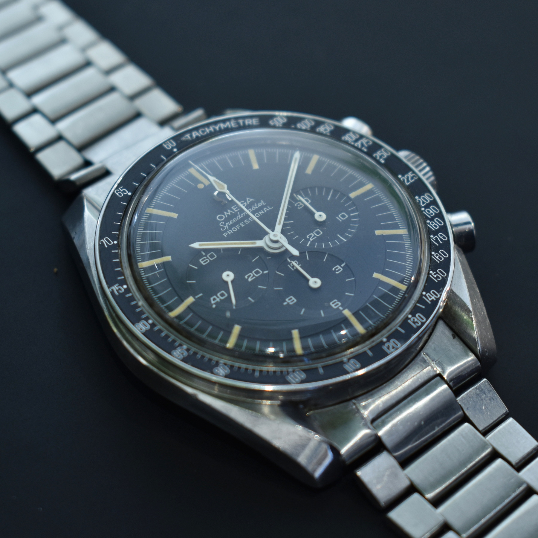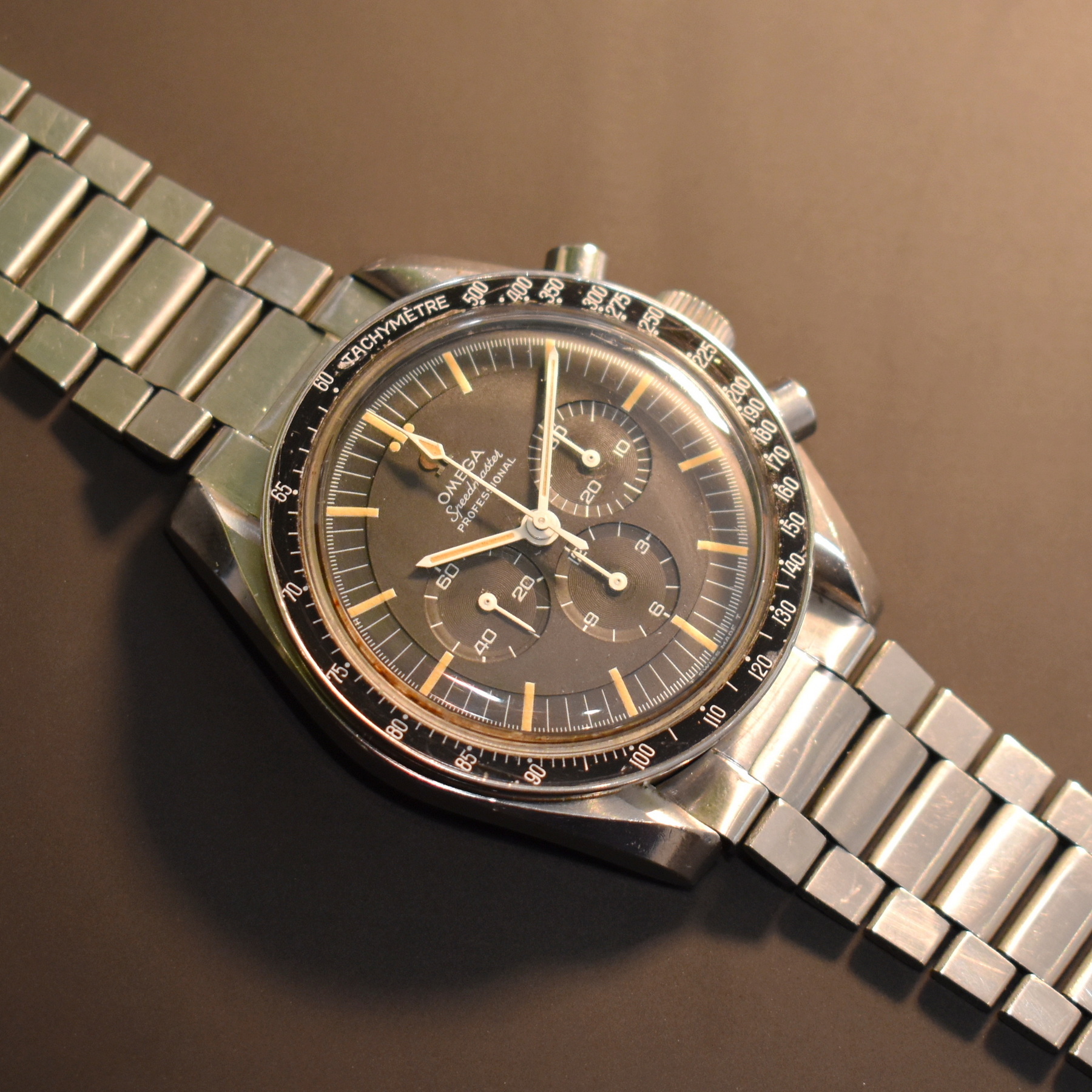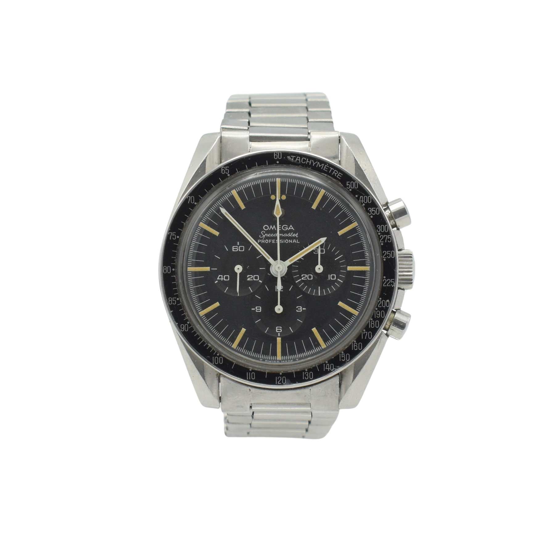 This 1966 Omega Speedmaster is the ‘one year only’ C.B. (La Centrale Boites) lugs case, sub reference 105.012-66 C.B. Inside is the famous calibre 321 movement, with the original pushers and stainless steel strap, model 1039 with 516 endlinks, all correct and original for the date of the watch. We have not polished the case and it shows a few age related marks as can be seen in the pictures. The case can of course be gently polished if you require it. The dial is in great condition having had the Lume plots tidied up by the foremost ‘Lume’ specialist in the UK. Original hands Also note the raised polished logo. The bezel is the original Dot over ninety and in remarkable condition only showing a few age related marks. Overall we would say that this ‘Pre Moon’ example of the classic Speedmaster from 1966 is a superb watch and having an unpolished C.B. case is extremely rare.