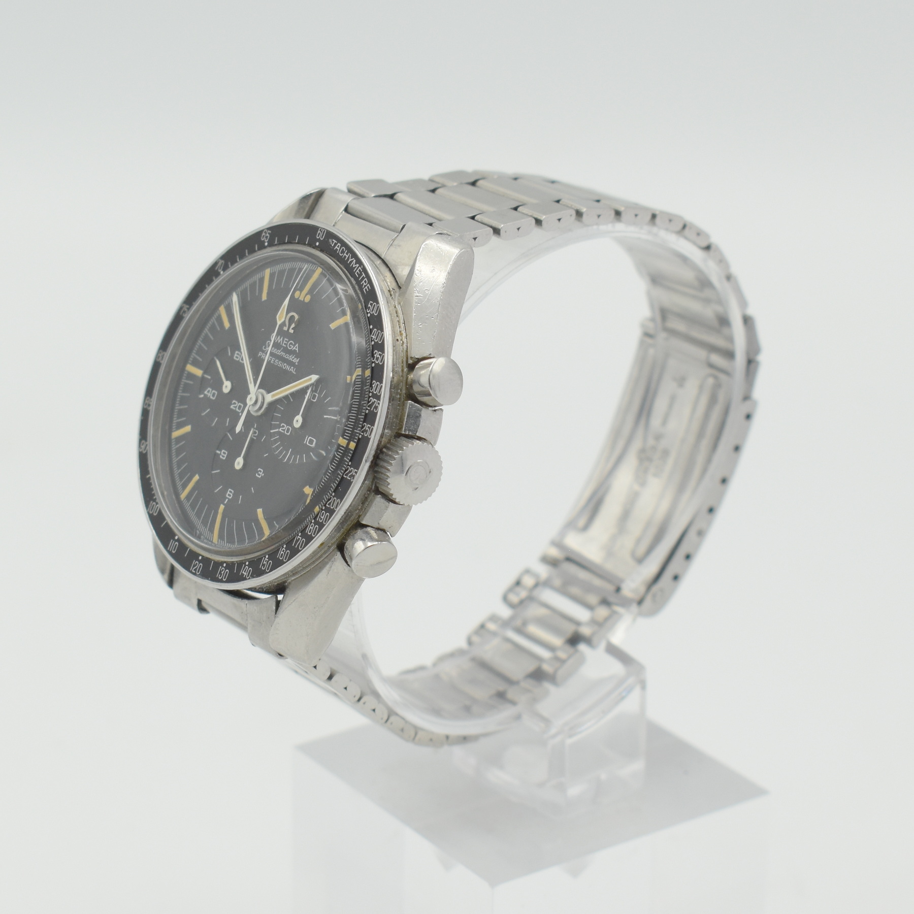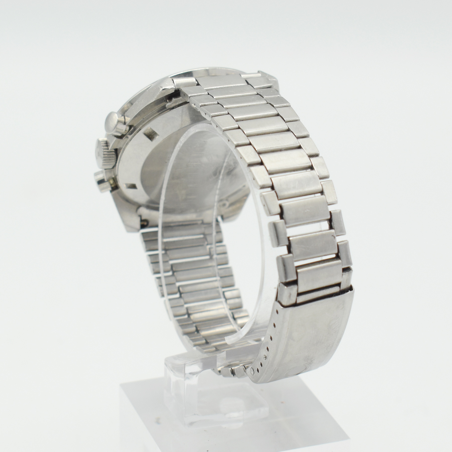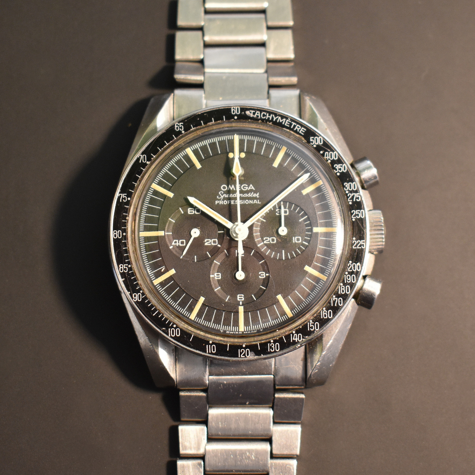 This 1966 Omega Speedmaster is the ‘one year only’ C.B. (La Centrale Boites) lugs case, sub reference 105.012-66 C.B. Inside is the famous calibre 321 movement, with the original pushers and stainless steel strap, model 1039 with 516 endlinks, all correct and original for the date of the watch. We have not polished the case and it shows a few age related marks as can be seen in the pictures. The case can of course be gently polished if you require it. The dial is in great condition having had the Lume plots tidied up by the foremost ‘Lume’ specialist in the UK. Original hands Also note the raised polished logo. The bezel is the original Dot over ninety and in remarkable condition only showing a few age related marks. Overall we would say that this ‘Pre Moon’ example of the classic Speedmaster from 1966 is a superb watch and having an unpolished C.B. case is extremely rare.