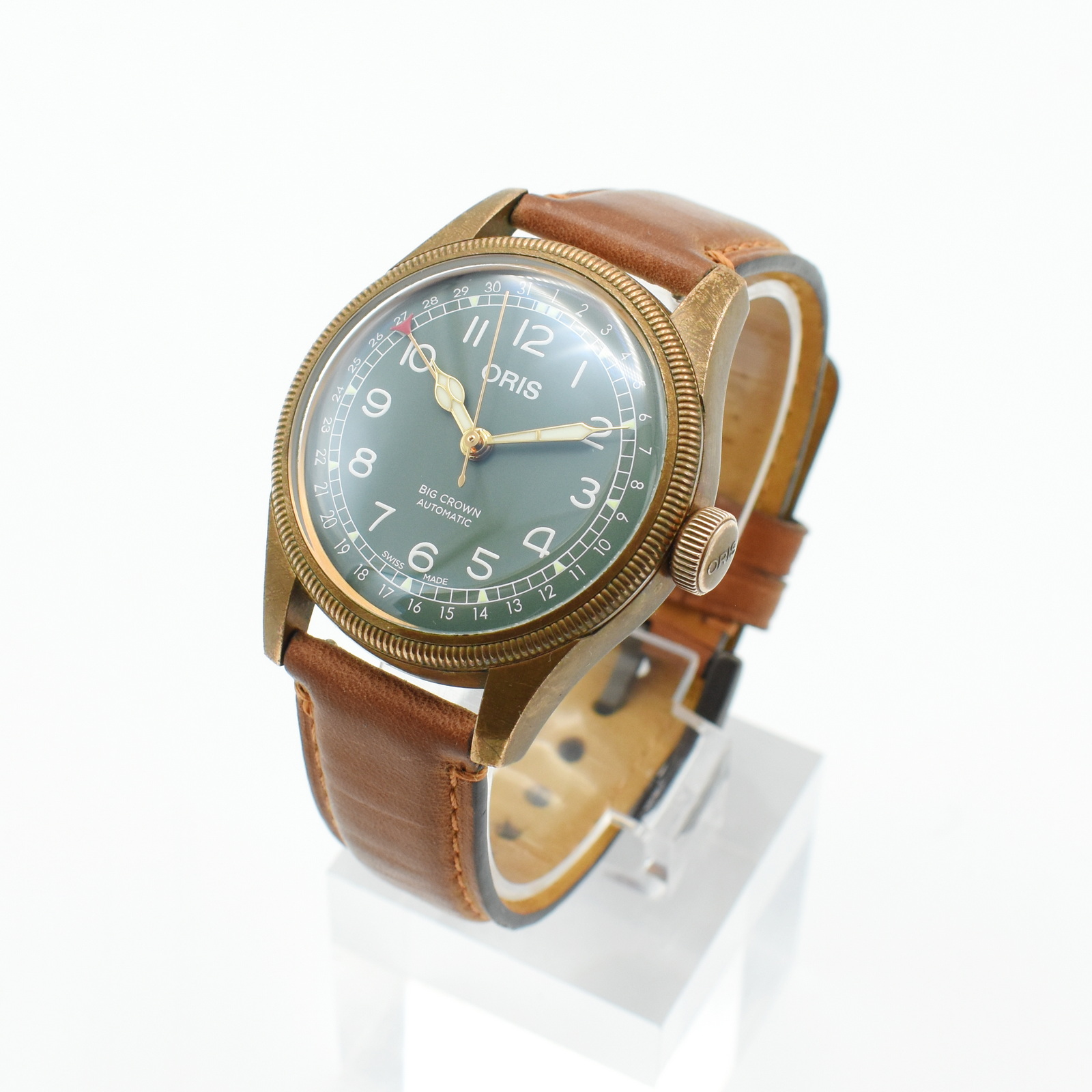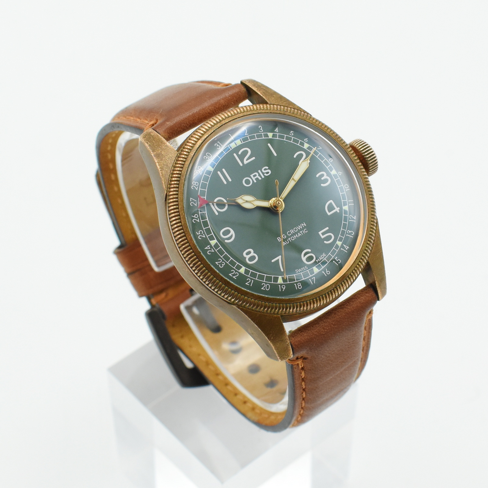 The Oris Big Crown with pointer date is known for its oversized crown and pointer date. Both features have been consistent for the eight decades since the design was introduced, a timespan celebrated by this special edition, which has a case, crown, bezel and buckle cast in naturally patinating bronze.