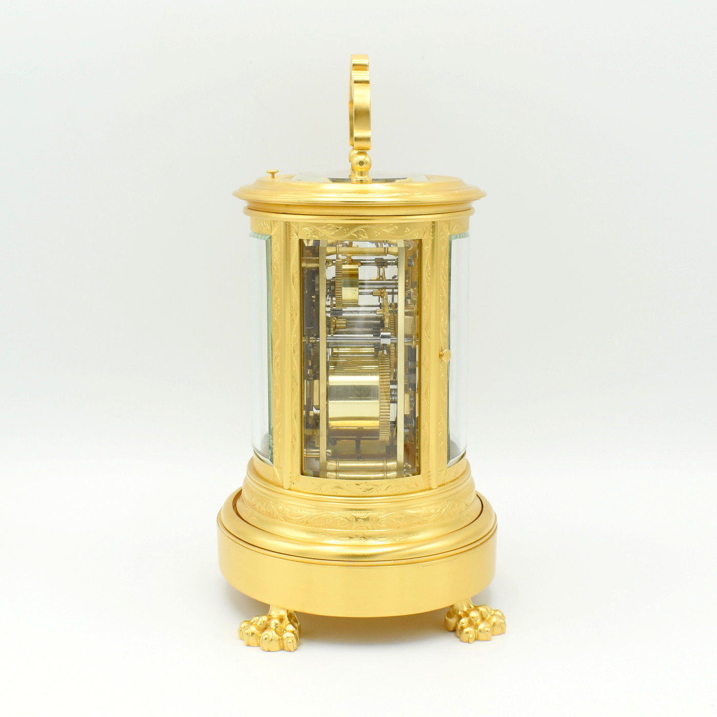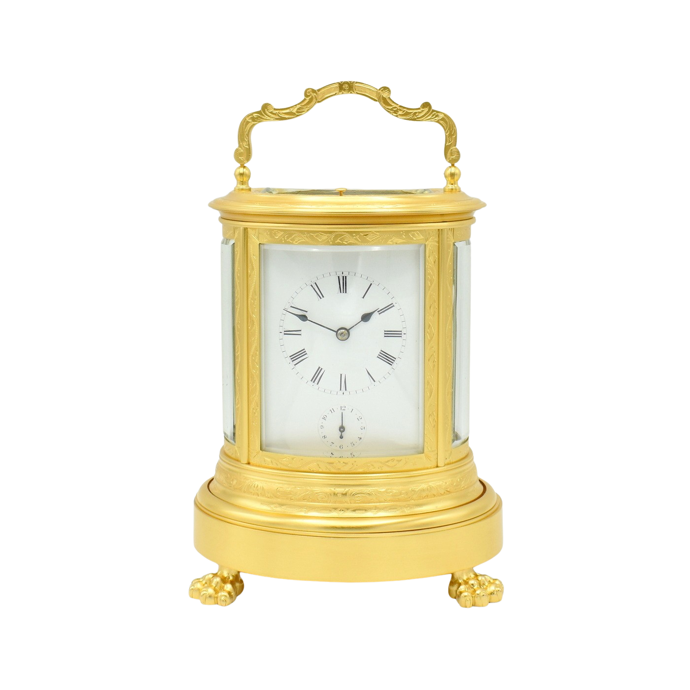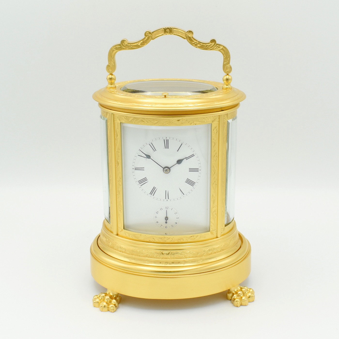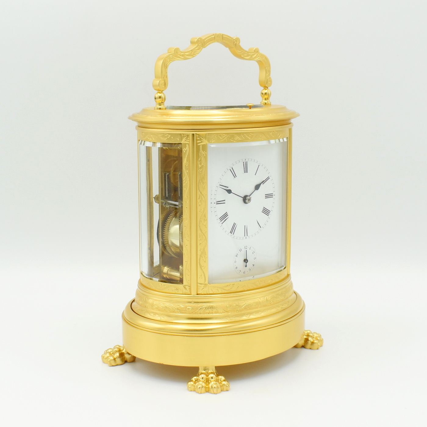 A truly stunning oval clock on a base/stand with impressive lion paw feet. The engraved case is in superb condition with a fine gilt finish, and the original glass near perfect. The clock is not attached to the base and can be lifted seperately using the carry handle, also engraved and delicately shaped. The movement has been fully overhauled and runs perfectly, with alarm function and push repeat button to the top, to strike the last hour. Although unsigned it is numbered and probably from Richard & Co., circa 1880-1890. It is worth noting that oval carriage clocks are not rare, but finding one with a stand such as this does make it quite unique and enhances the clock.