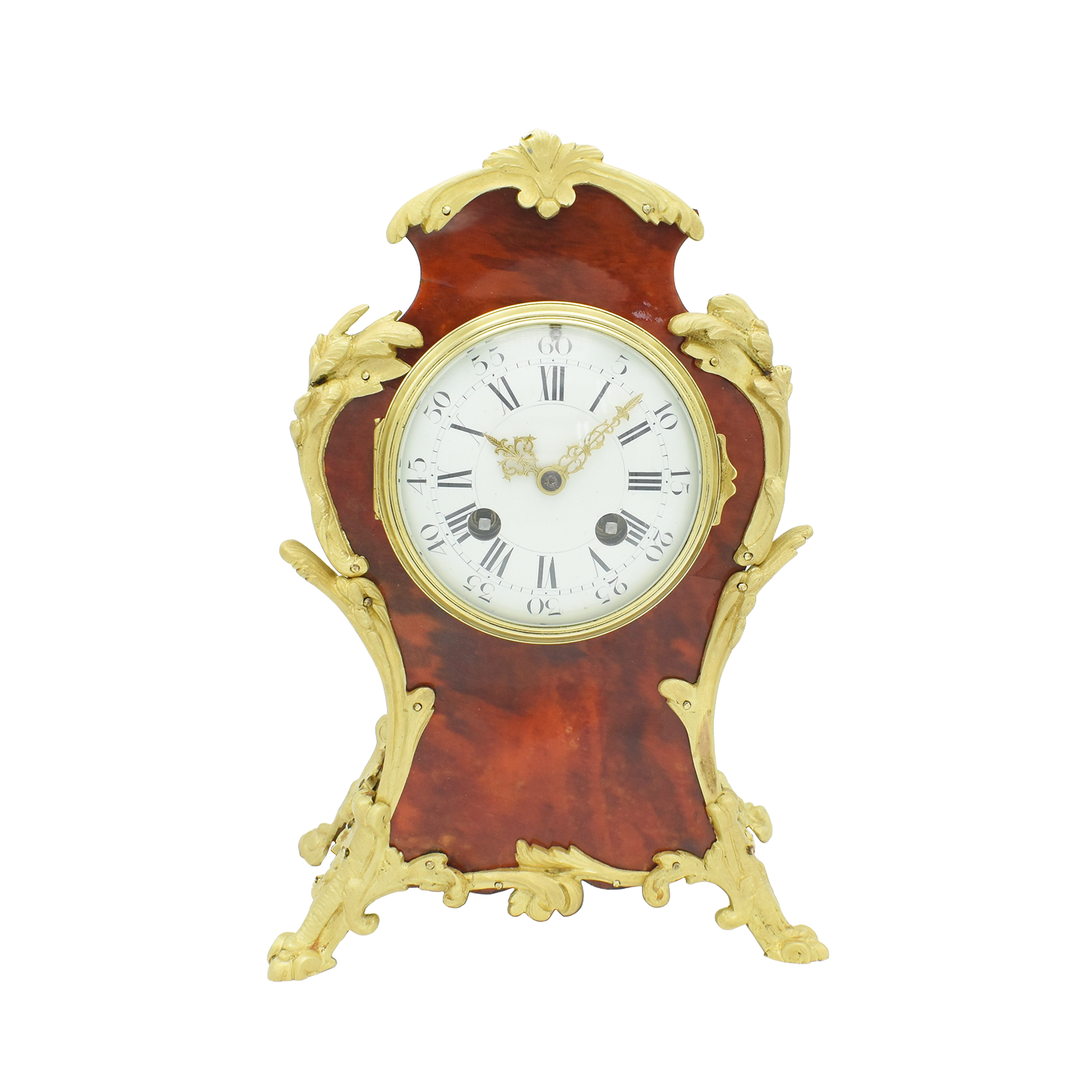 A fine decorative French mantel clock striking hourly and half hourly on a coiled gong. The vitreous enamelled dial showing Roman numerals, fine fret cut hands of gilt brass, and a cast brass decorative bezel surround with bevelled convex glass. The case is in remarkable condition for its age and retains a very good colour, a very deep red and glossy finish . The Ormolu mounts are the original fire gilt and the bracket feet are just as bright. Made in Paris around 1890 stamped and numbered. The clock strikes one at one and so on with the half hour always just a single blow.