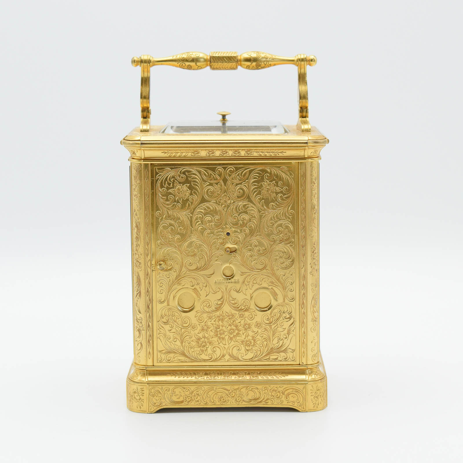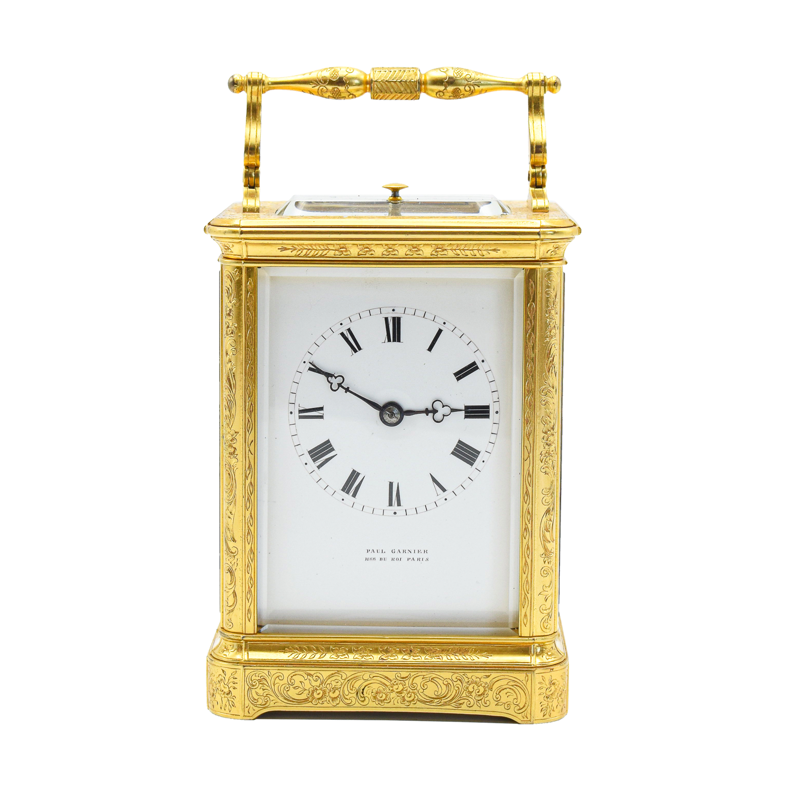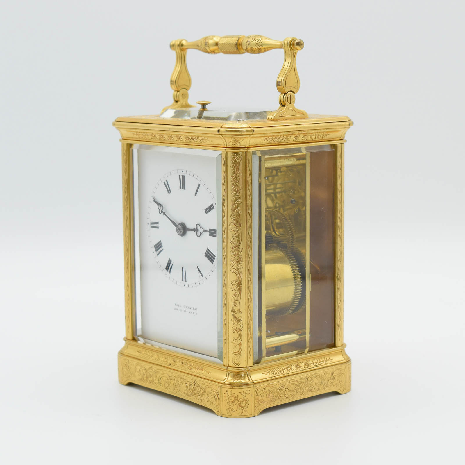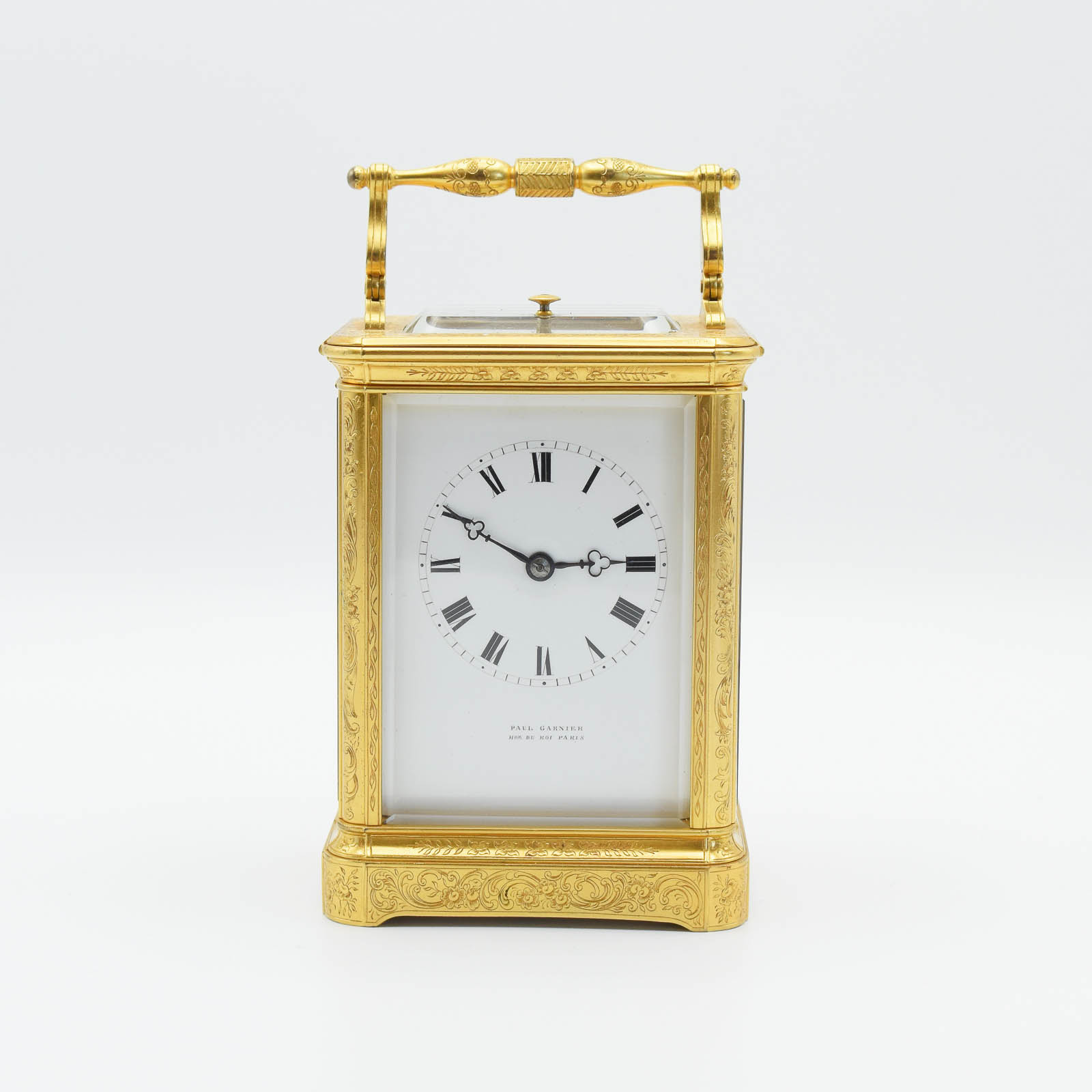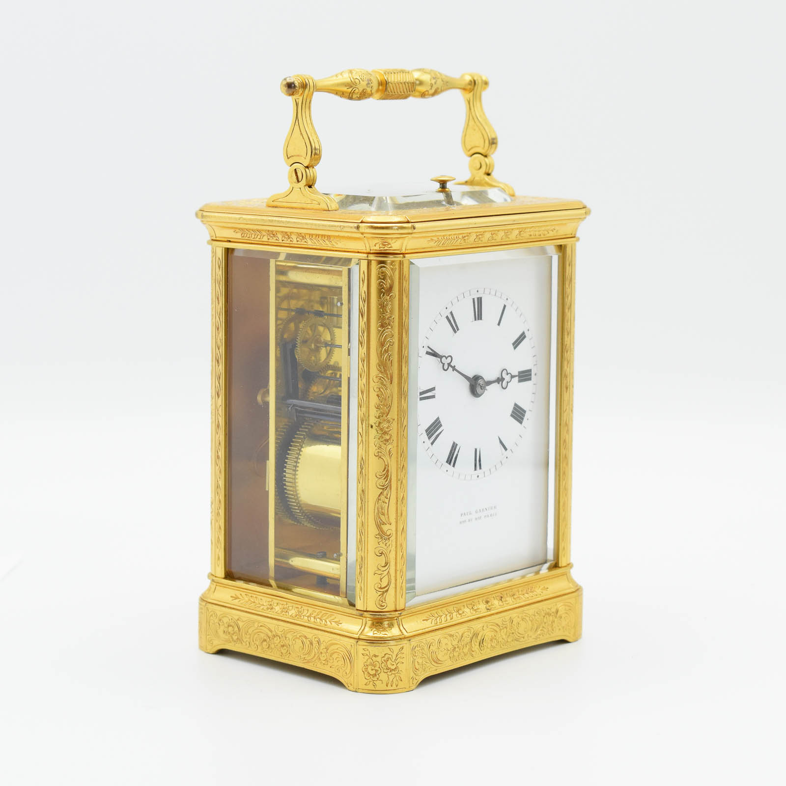 A good and quite rare, mid 19th Century Series 3, Paul Garnier carriage clock with push repeat and strike on a bell. An engraved ‘corniche’ style case with shuttered rear door and earlier style handle. The dial showing Roman numerals with trefoil hands and the name with Hrl du Roi (Horologer to the King- Louis Philippe I -1830-1848). The movement is signed on the back plate in the usual top left position. The classic Garnier style hammer striking the bell. The clock is P.G. number 2444. This clock retains the all important ‘Chaff Cutter’ escapement and the original thick bevelled White glass. The clock will run for a week, but for better timekeeping we recommend a mid week wind too. This clock can be viewed in our shop but remember we are closed Sunday’s and Monday’s. 24 Months guarantee
