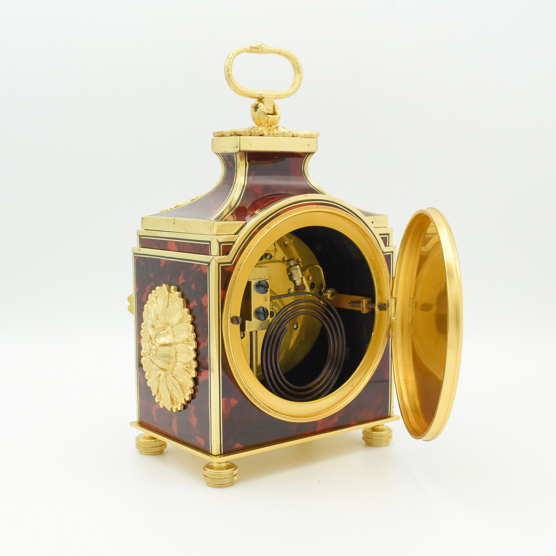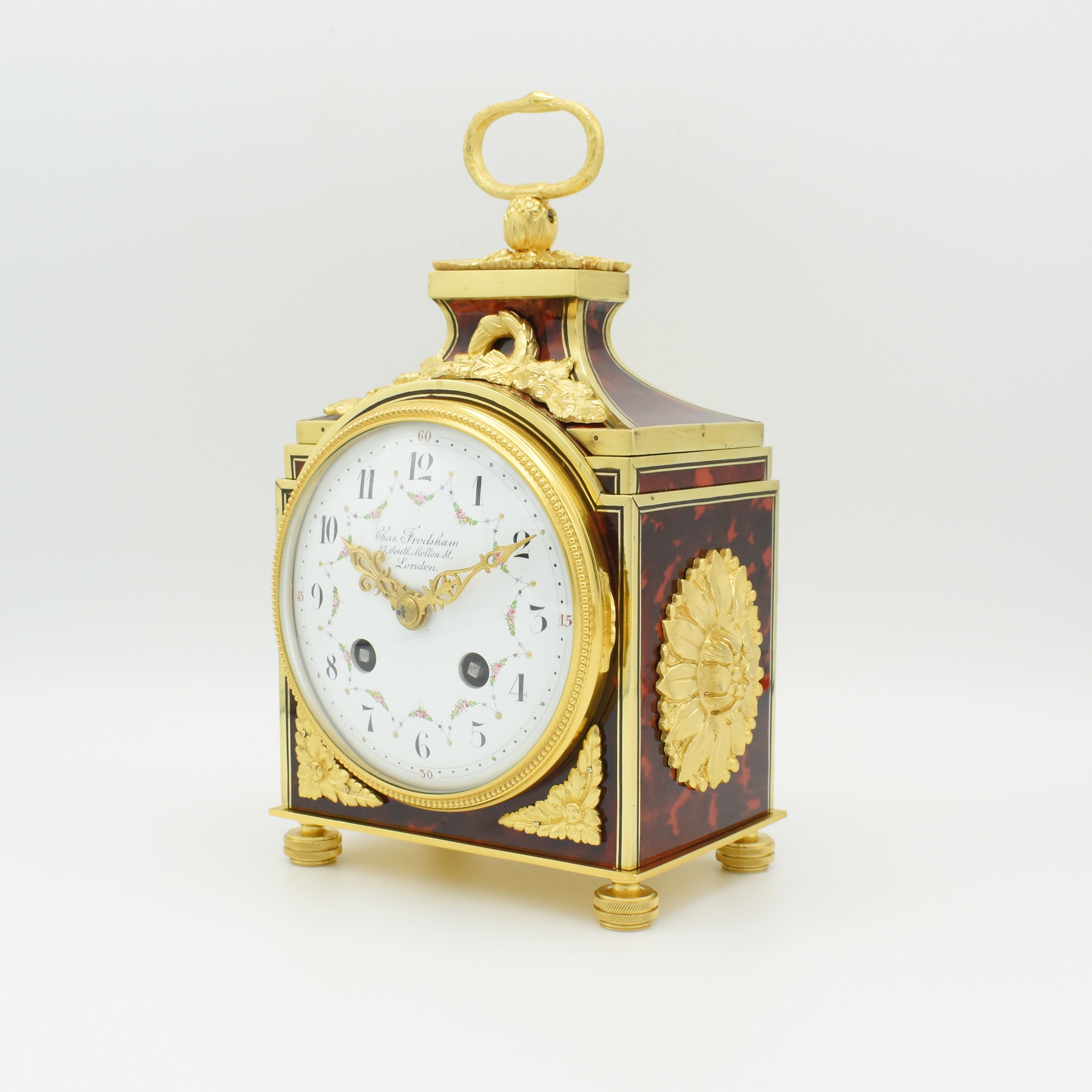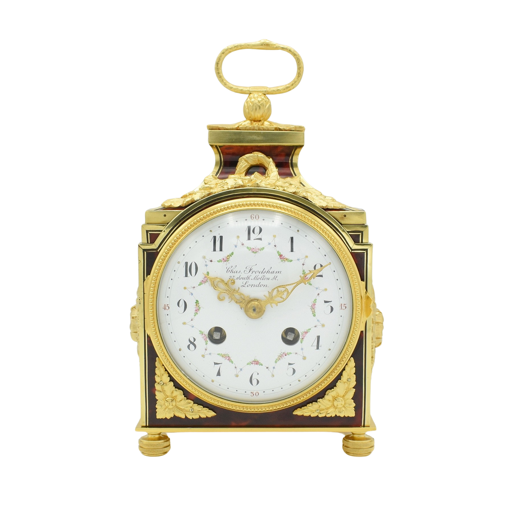 An extremely rare carriage clock or ‘Pendule d’officier’ with one of the finest cases we have ever seen. These were made from the early 1800s through to 1910’s and this one dates to around 1914. Running for a week on a full wind, and having the symbol of eternity, the snake consuming itself for the handle. The dial on the clock is excellent, hand painted with swags of flowers between the numerals and small gilt flowers joinng them. Wonderful gilt highly detailed hands, signed by Charles Frodsham of 27 South Molten Street, London. Charles Frodsham was established in 1848 ( after a partnership with John Arnold ) Born on the 15 April 1810 – 11 January 1871 he was a distinguished English clock, watch and chronometer maker establishing the firm of Charles Frodsham & Co, which remains in existence as the longest continuously trading firm of chronometer manufacturers in the world ! The case is constructed of French Oak then covered in a red Tortoiseshell style resin veneer, inlaid with brass stringing and edging and having ormulu mounts. Sold with our 24 month guarantee.