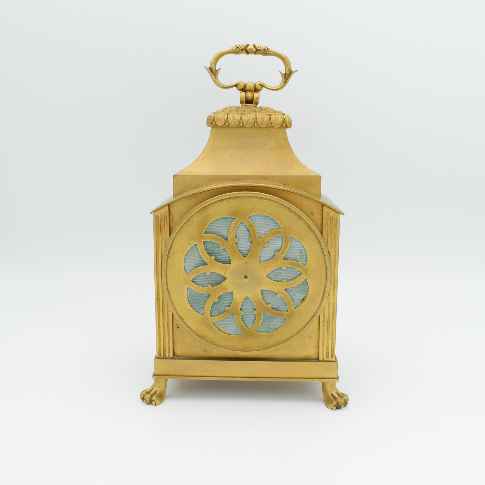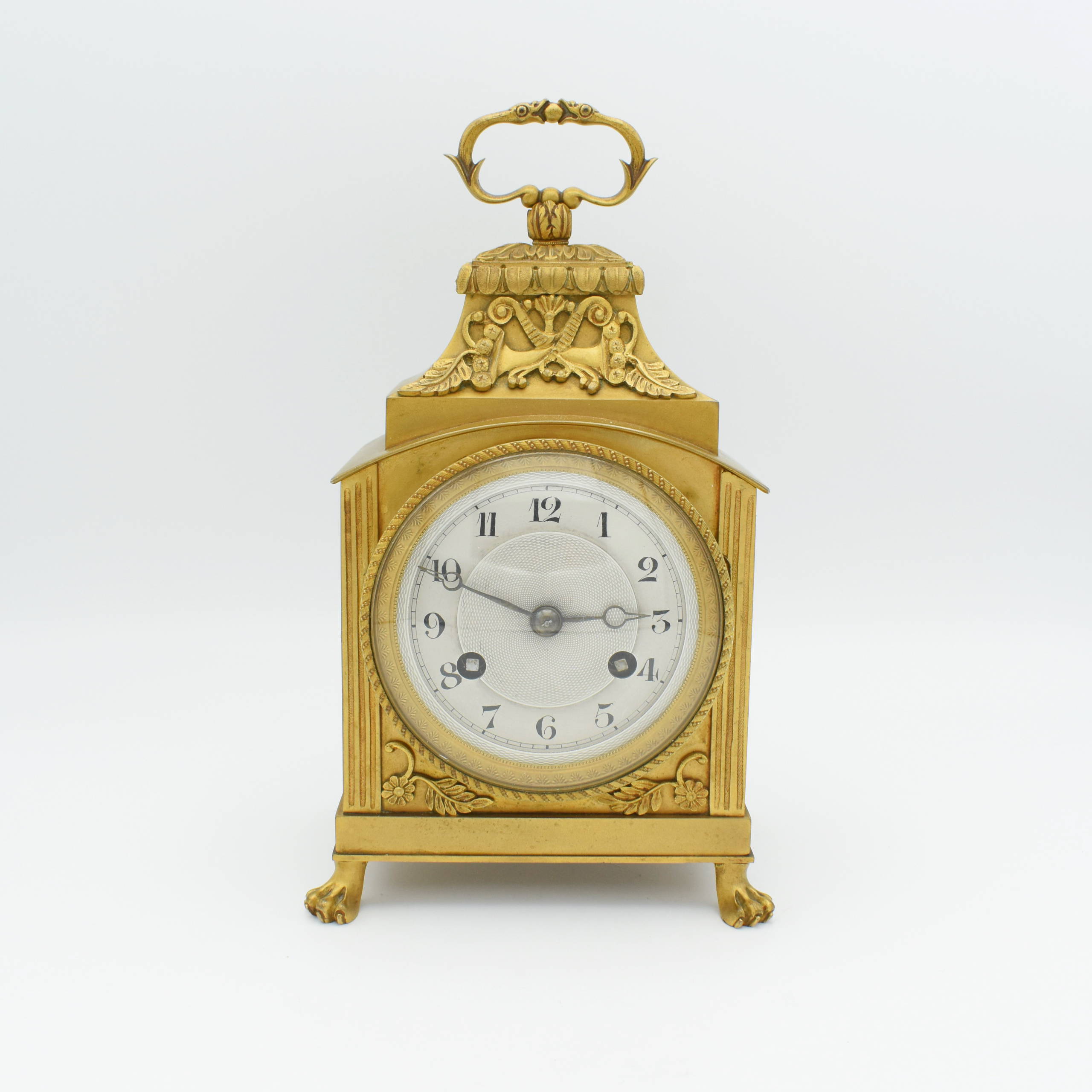 A fine gilt Pendule d’Officier Clock with a superb 8 day duration movement on a jeweled lever and silvered escapement. The beautifully ‘engine turned’ dial showing black Arabic numerals with minutes to the outer edge. Early style true Breguet hands with the cut out on the tip. Strike on the hour and once for the half hours and interestingly on two gongs creating a good mellow tone. The case having floral and ribbon gilt mounts and musical instruments and in the classic ‘Pagoda’ shape. Surmounted by a classical drop handle to carry. Standing on four fine ‘Lions paw’ feet. Circa 1890. If you can visit to see this clock we think you’ll agree, it’s quite impressive. This is the only one have seen with musical instruments cast into the design, which leads us to believe this may have been made by specialcomission for someone with a musical connection 130 years ago.