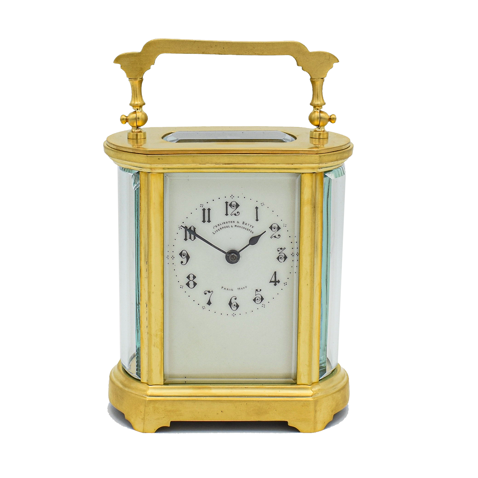 A gilded timepiece carriage clock retailed by Penlington & Batty aRound 1890. Curved and bevelled side glasses, with an unusual off White enamel dial showing fancy Arabic numerals. Wound once a week with a key. This clock does have a small chip to the right side glass which can be seen in the pictures and a minor chip to the top glass, however only noticeable upon close inspection.